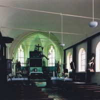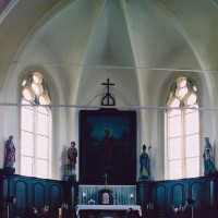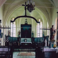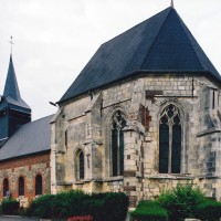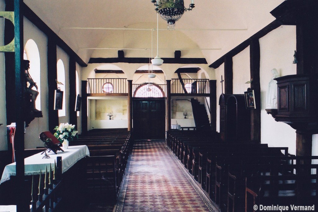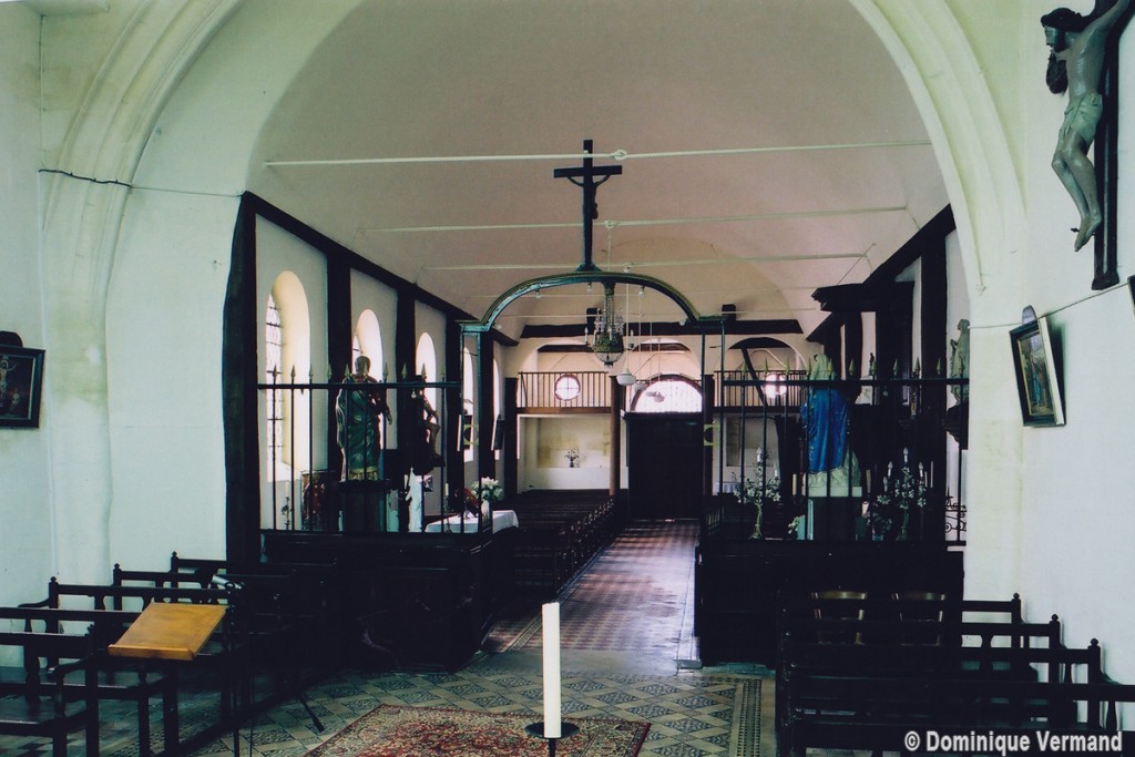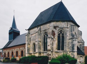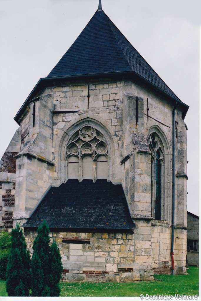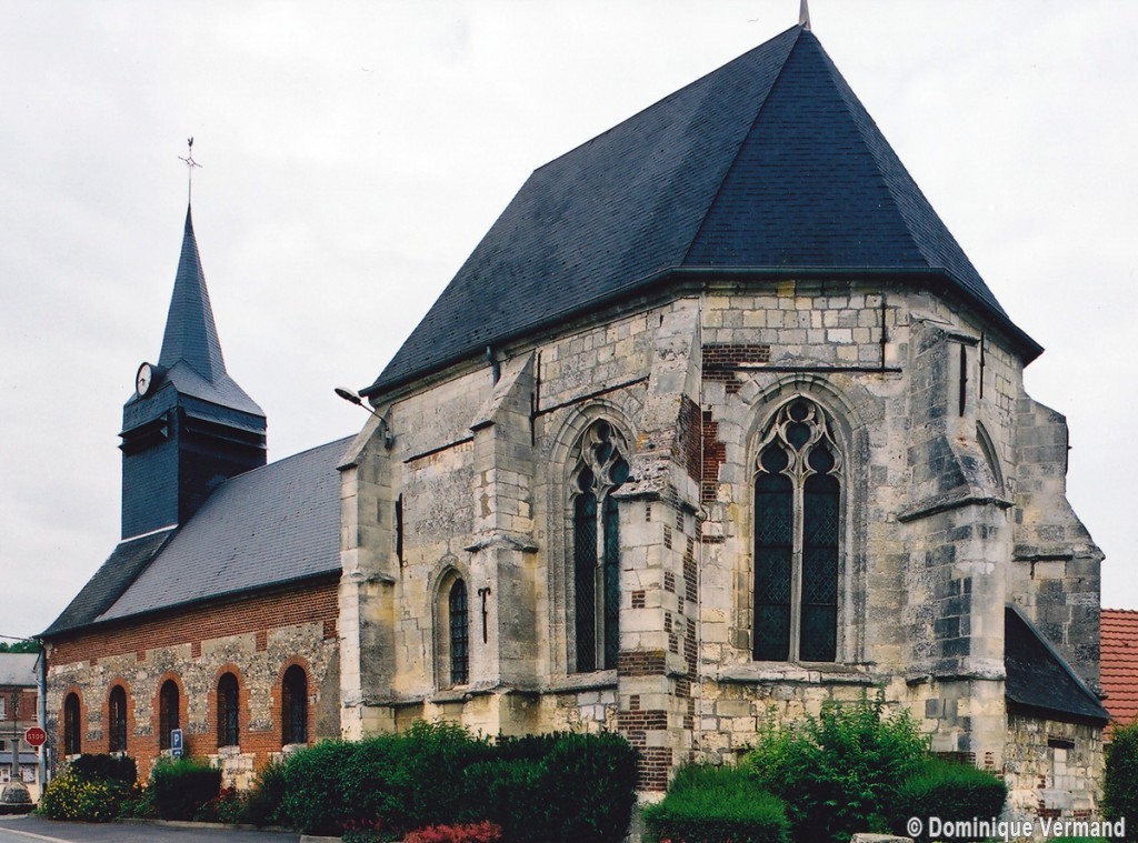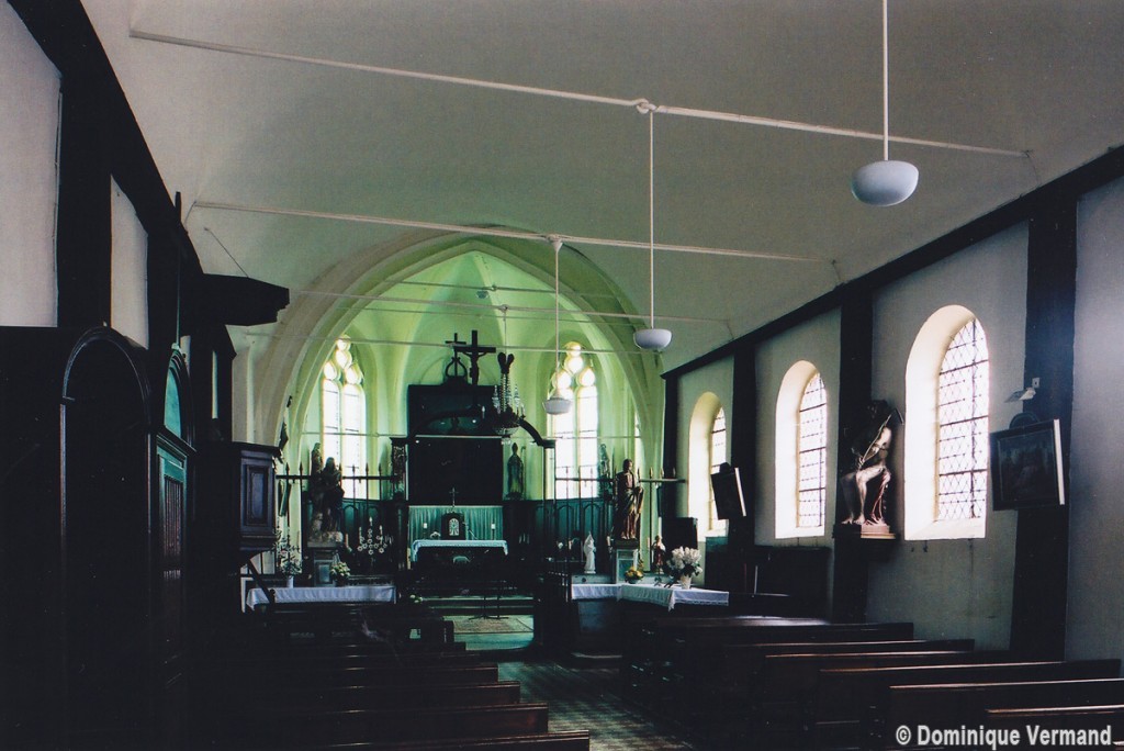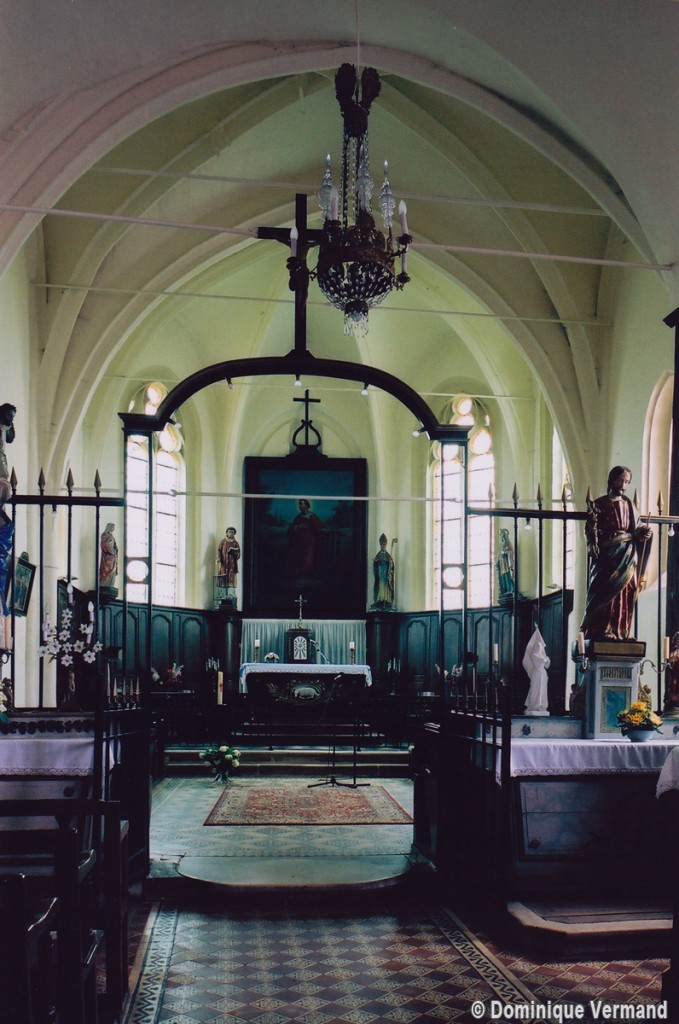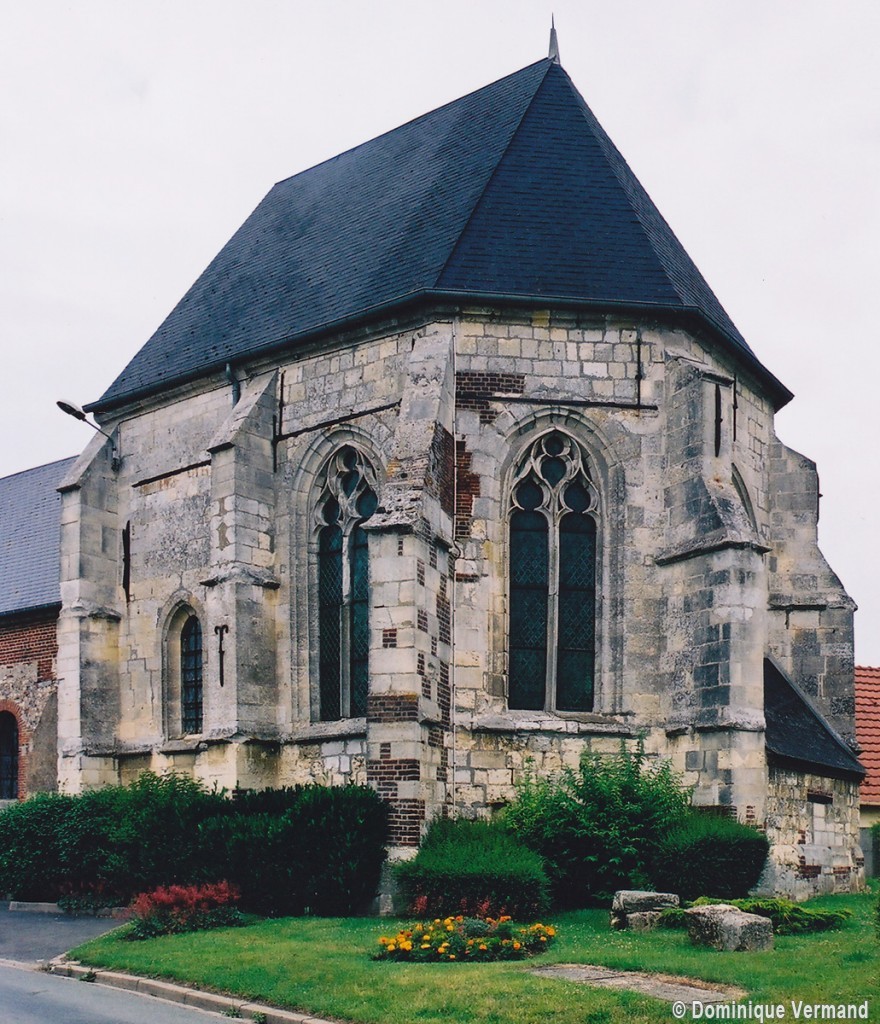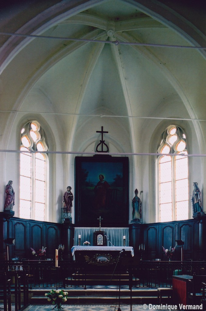 A l’intérieur, la charpente retombe sur des poutres en bois disposées le long des murs afin de ne pas solliciter directement ces derniers. Le chœur est constitué d’une travée droite et d’une abside à cinq côtés. Il est voûté d’ogives qui retombent directement par pénétration dans les murs. Les fenêtres qui l’ajoure sont, soit de simples lancettes, soit constituées d’un réseau flamboyant. Très simple dans sa conception comme dans sa réalisation, ce type de chœur se retrouve à de très nombreux exemplaires dans la région picarde.
