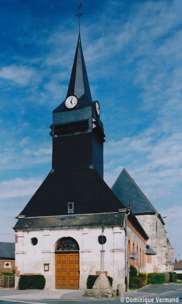 Saint-Laurent montre la silhouette, caractéristique en Picardie, d’un chœur de la fin du gothique dominant la nef. D’origine romane comme le montre encore partiellement le mur nord avec ses petites pierres disposées régulièrement, cette dernière a été réparée à de nombreuses reprises. Mélangeant la pierre, le silex et la brique, le mur méridional appartient principalement aux 18ème et 19ème siècles tandis que la façade est de 1791, une période pourtant peu propice aux constructions religieuses. Surmontée d’un haut clocher en charpente et appareillée avec soin, elle est scandée par quatre pilastres encadrant le portail central et deux oculi.