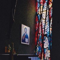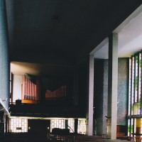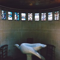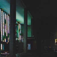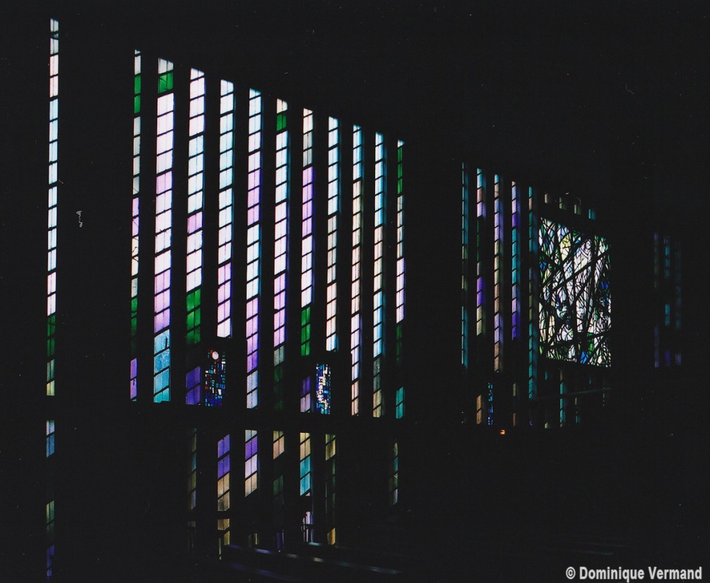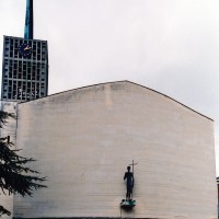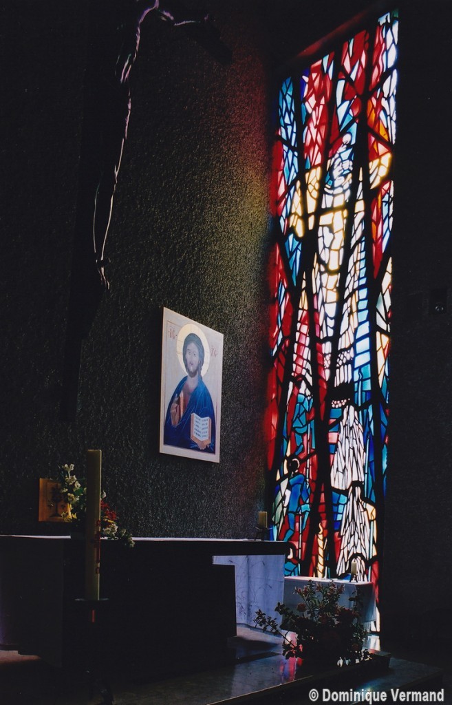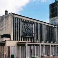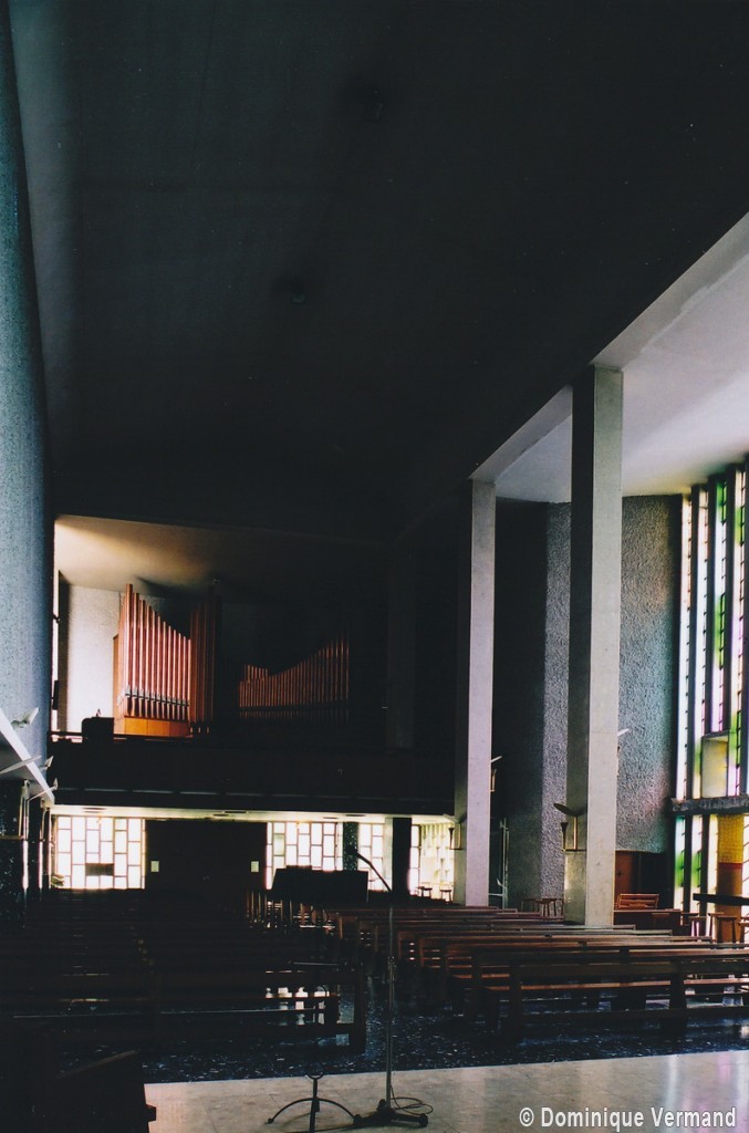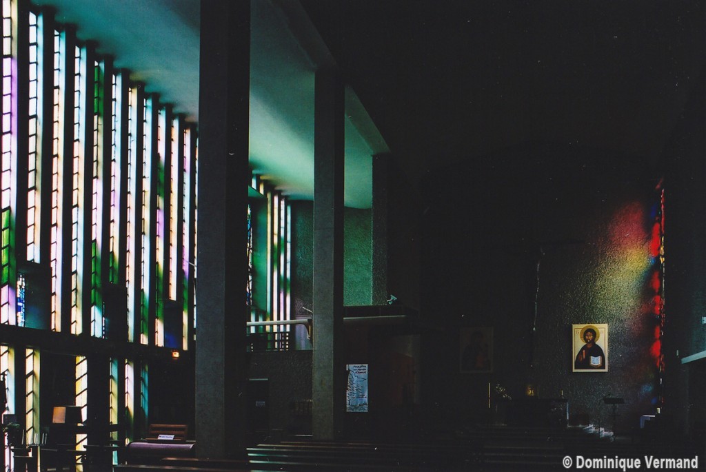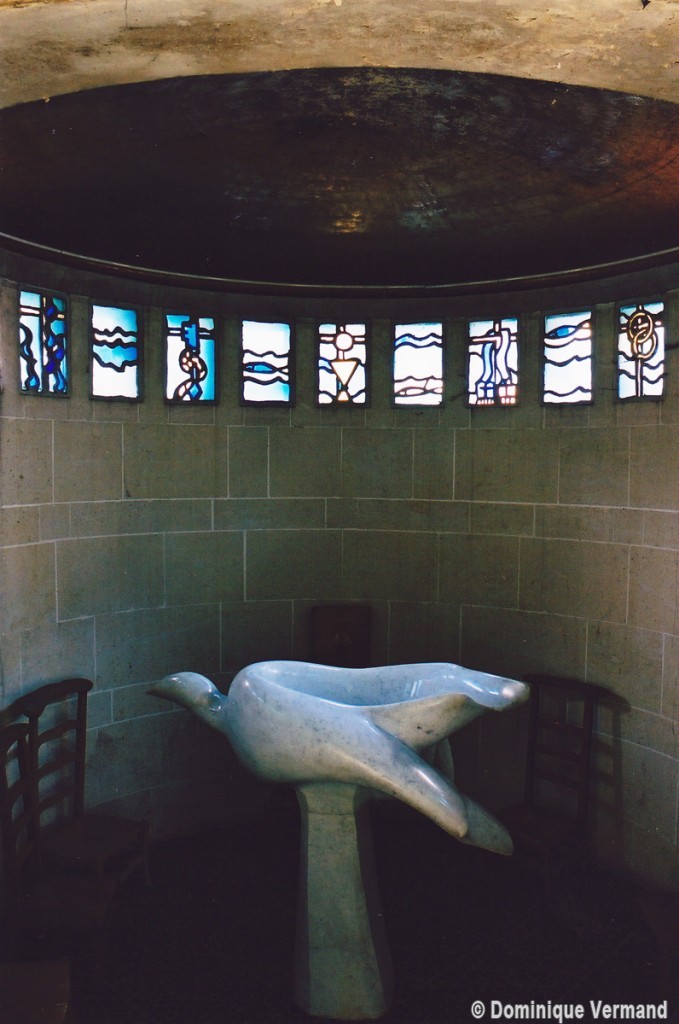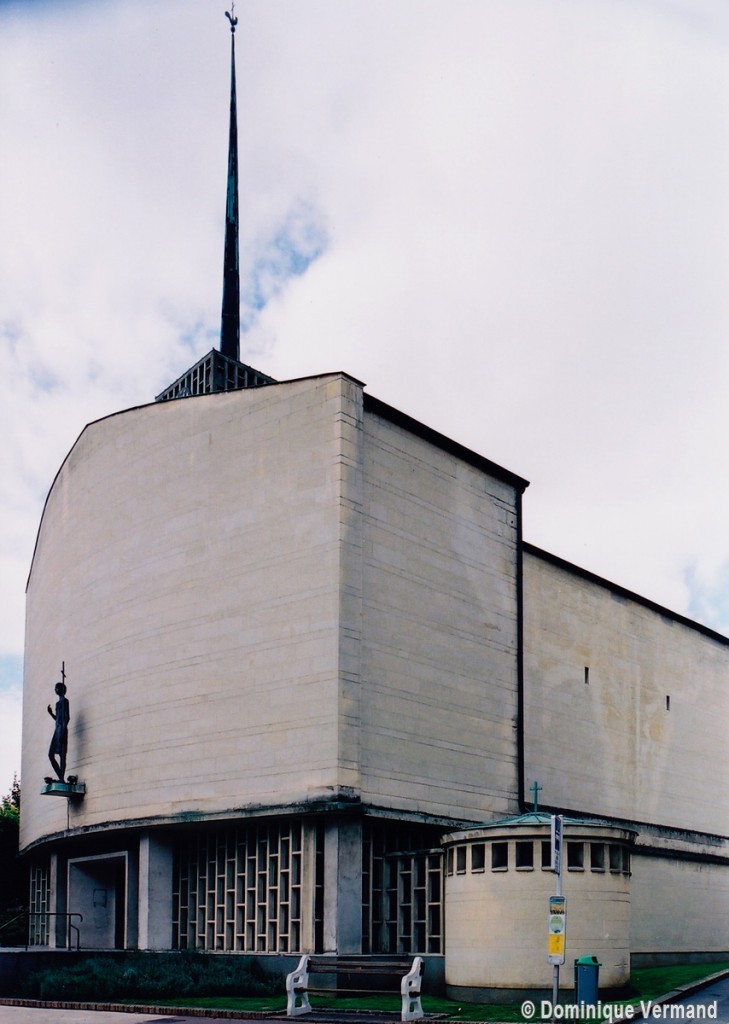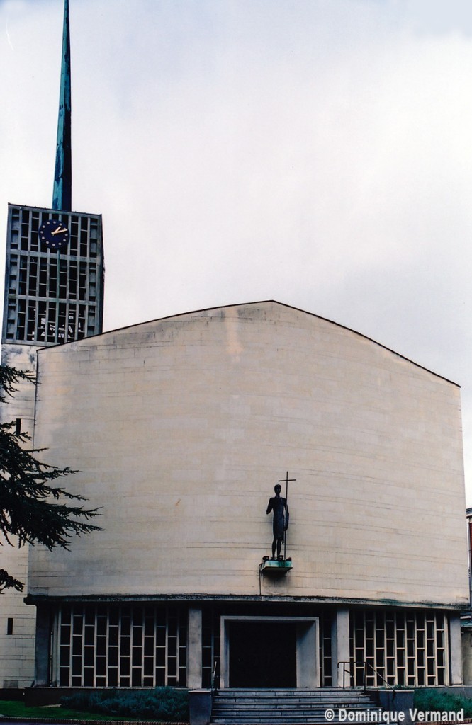 A l’extérieur, la rigueur du volume parallélépipédique de l’édifice est seulement perturbée par le clocher dont le beffroi forme comme une légère résille. Telle une aiguille, une haute flèche en acier le termine. Bâti en hors oeuvre près de la façade et reprenant en cela une tradition très ancienne, le petit baptistère circulaire abrite une remarquable cuve baptismale en marbre prenant la forme d’une colombe, œuvre de Claude Mary (2005).