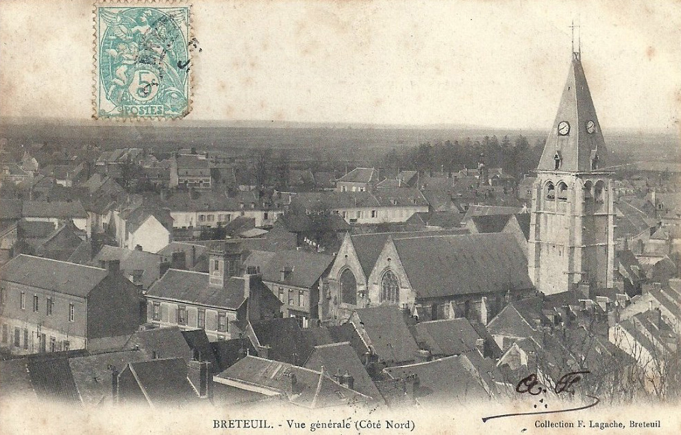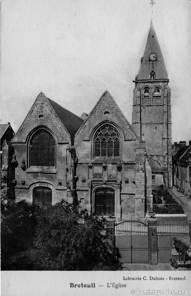 Au soir du 26 mai 1940, après un intense bombardement allemand, Breteuil n’est plus qu’un champ de ruines. L’église Saint-Jean-Baptiste est jugée trop endommagée pour pouvoir être restaurée. C’était un intéressant édifice dont le mur nord de la nef remontait à l’époque romane et comportait une corniche beauvaisine. Le chœur montrait de belles fenêtres rayonnantes dans le style de celles de la chapelle de l’abbé de l’ancienne abbaye Notre-Dame. Mais l’essentiel y compris le clocher, semblable à ceux que l’on peut encore admirer à Vendeuil-Caply, Saint-André-Farivillers ou Paillart, notamment, datait de la fin du gothique (15ème/16ème siècles).