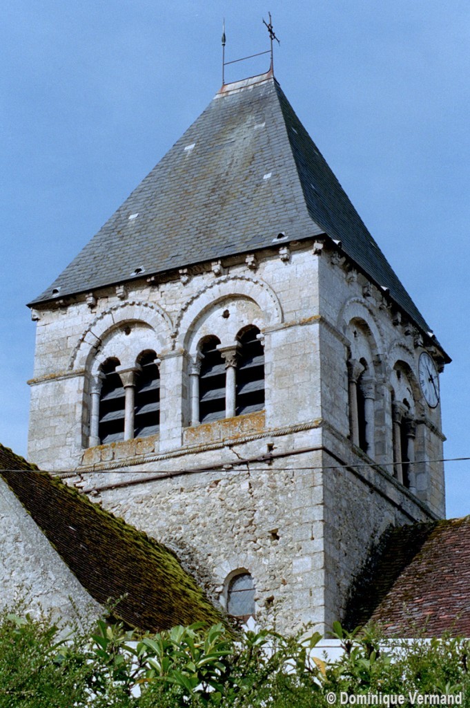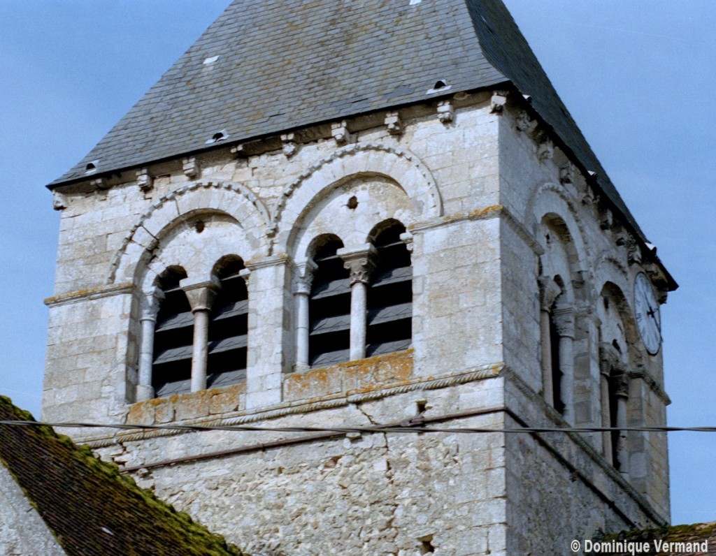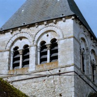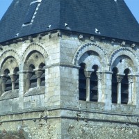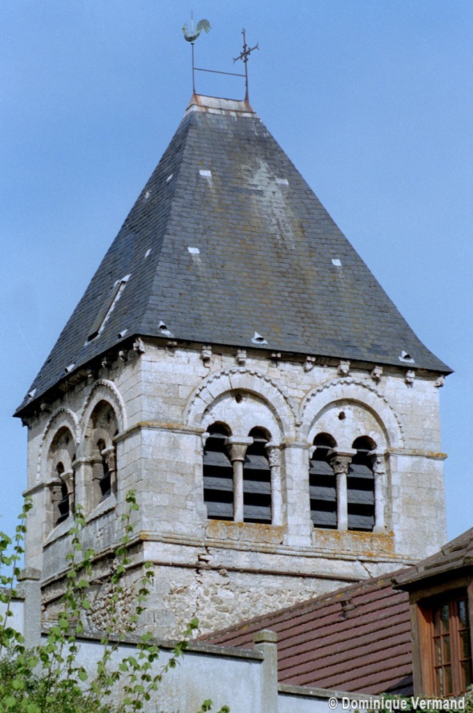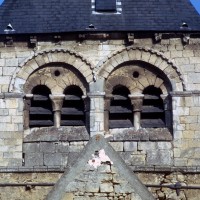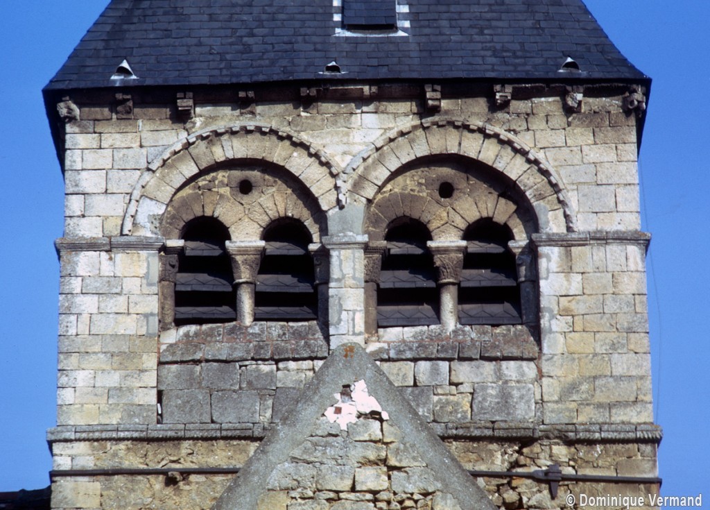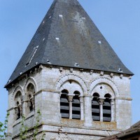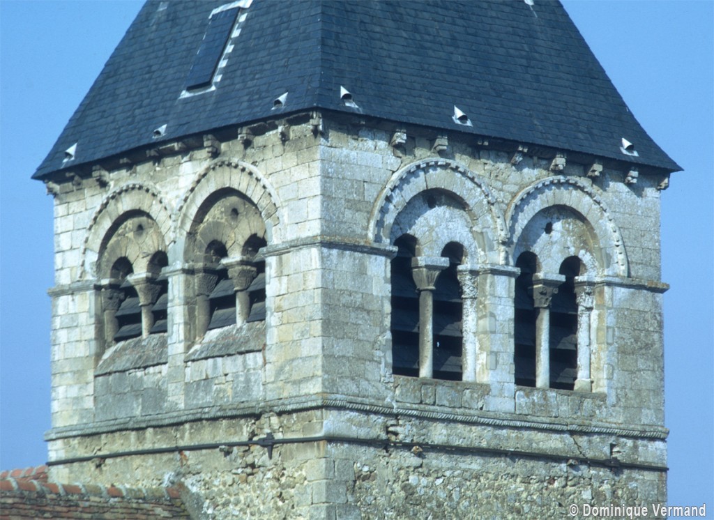 Le clocher comporte un seul étage, percé de baies géminées en plein cintre sur chaque face. Elles sont recoupées par une colonnette intermédiaire et comptent parmi les premiers exemples de cette disposition dans la région.