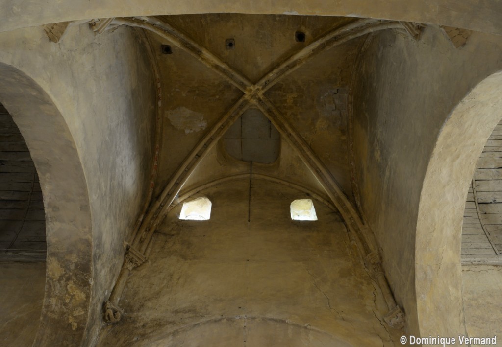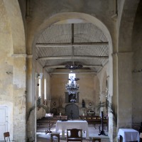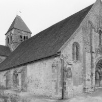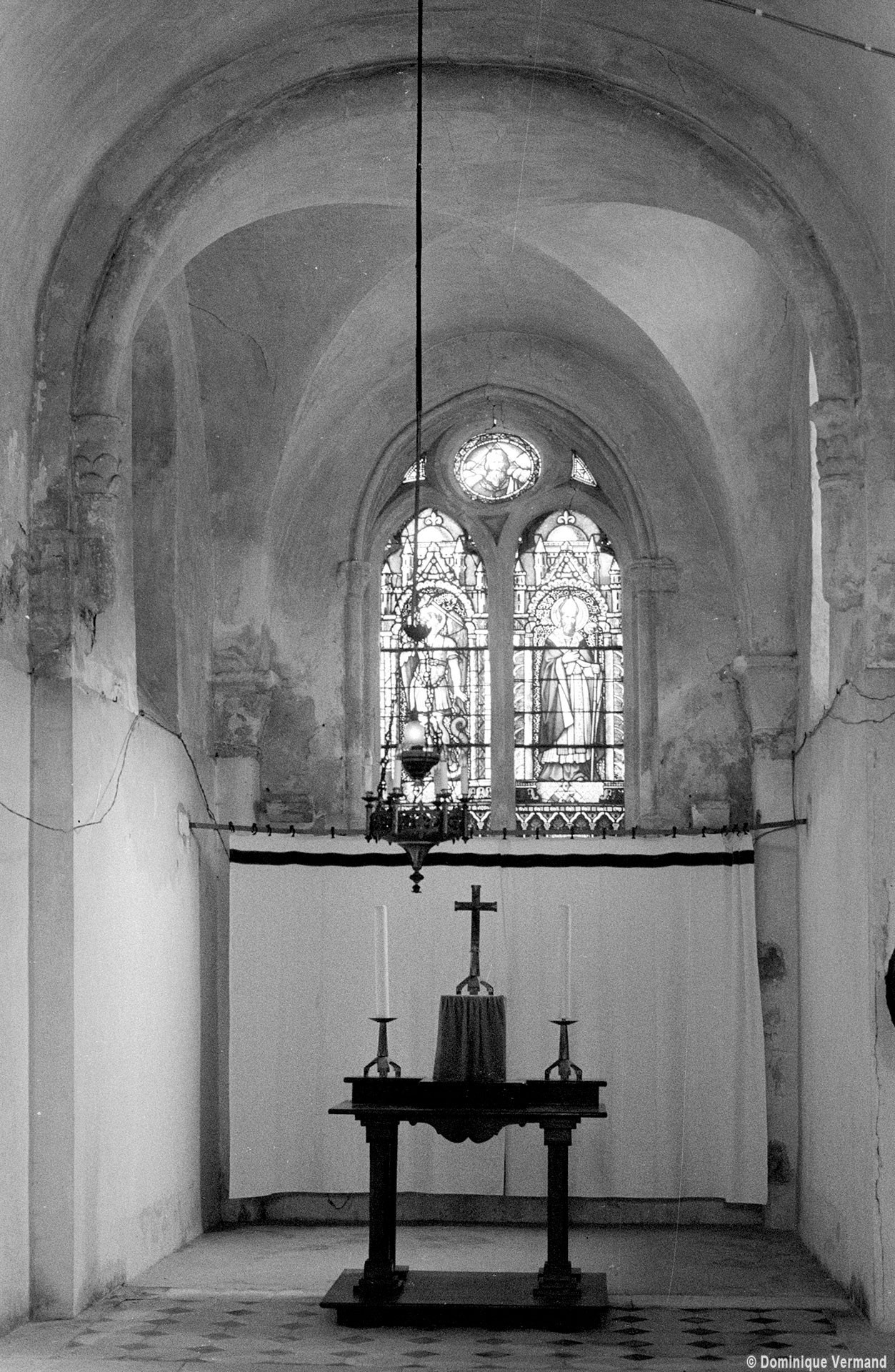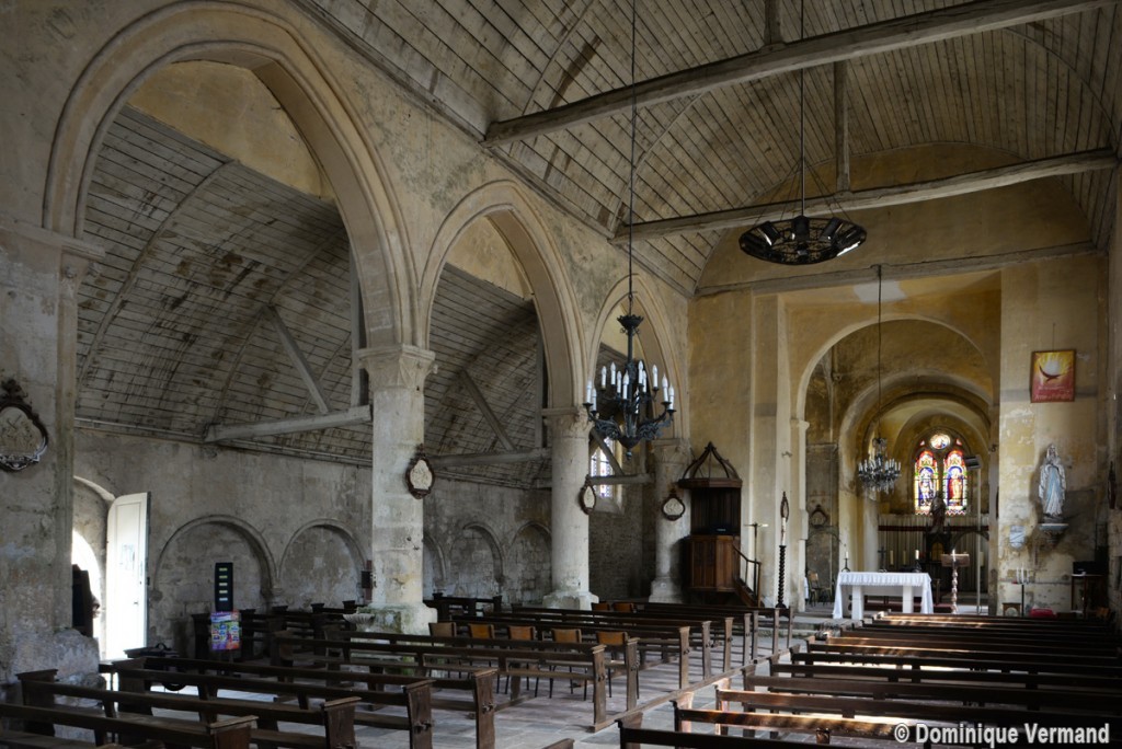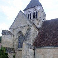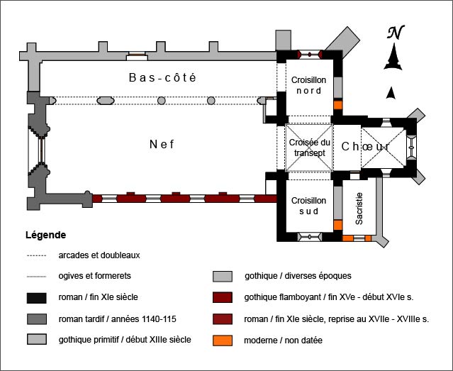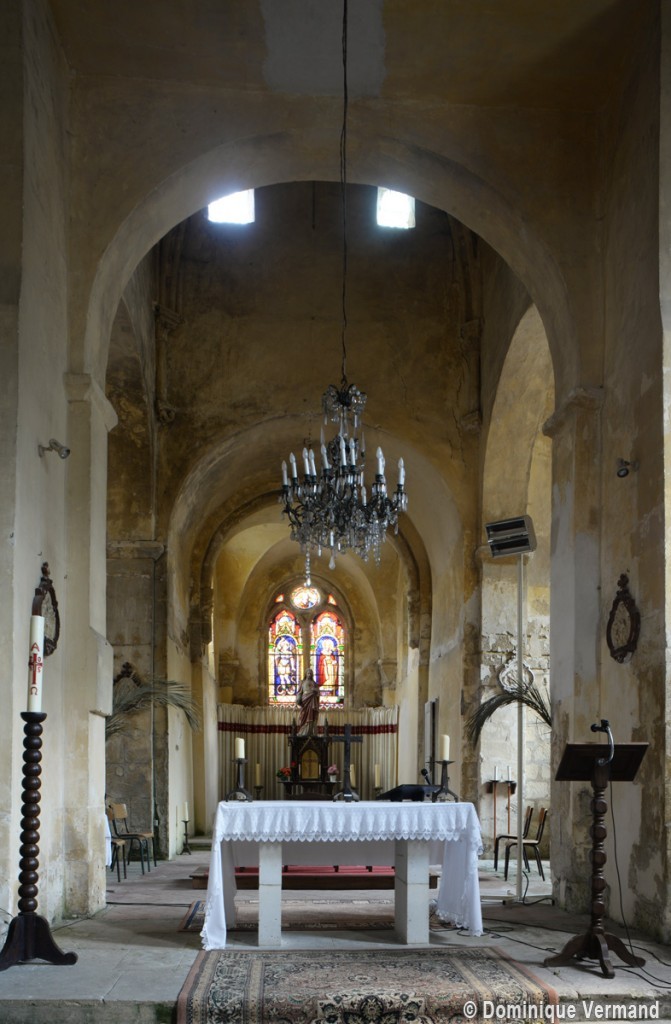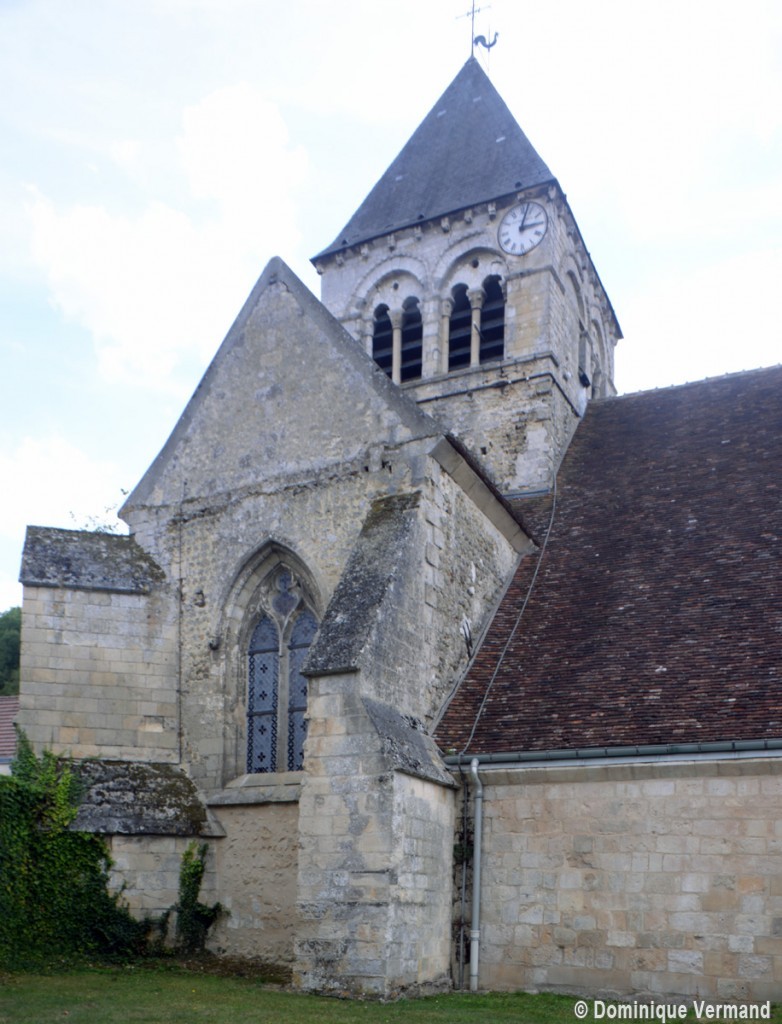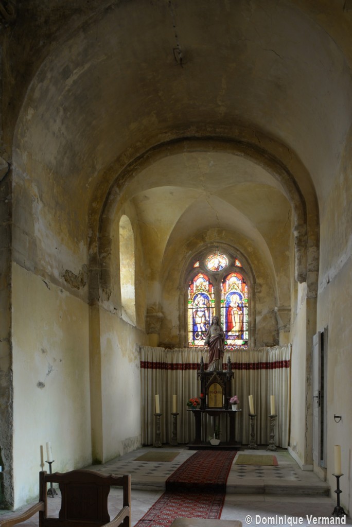De l’édifice bâti à partir de la fin du 11ème siècle subsistent les parties orientales, régulièrement distribuées autour du clocher. Alors que les bras du transept sont simplement charpentés, le chœur comprend une courte travée voûtée d’un berceau en plein cintre que prolonge une seconde travée de plan carré, voûtée d’arêtes. Suivant une disposition fréquente en Normandie, mais que l’on rencontre aussi dans les anciens diocèses de Noyon, Soissons et Laon, la partie inférieure du clocher, communiquant avec le chœur, les bras du transept et la nef par des arcades en plein cintre, forme lanterne grâce à deux petites fenêtres ouvertes vers l’est. Une voûte d’ogives la couvre depuis le milieu du 12ème siècle. Il est possible que des passages latéraux assuraient à l’origine la communication entre les bras du transept et la nef unique, à la manière des « passages berrichons », une disposition que l’on remarque également à Nogent-sur-Oise.