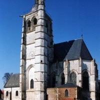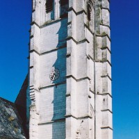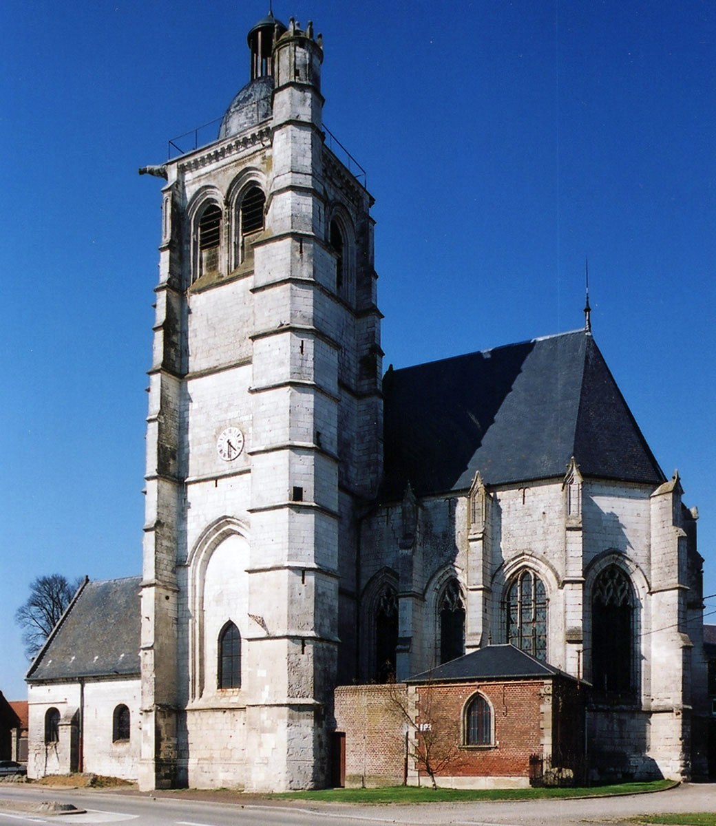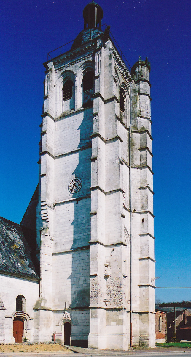 Contemporain du chœur, le clocher est une tour élevée, puissante et à l’aspect quelque peu austère dû à l’absence d’ouverture sur les trois-quarts de son élévation après que la grande fenêtre qui s’ouvrait au rez-de-chaussée ait été bouchée. Une tourelle d’escalier en marque l’angle sud-est. Des larmiers rythment à intervalles réguliers les contreforts et la tourelle. Le beffroi est ajouré par deux baies géminées (jumelles) sur chaque face. Si leur forme et leur mouluration sont encore pleinement gothiques, il n’en est pas de même de la corniche, de la partie supérieure de la tourelle et du dôme avec lanternon qui appartiennent pleinement au style de la Renaissance. Au milieu du 16ème siècle un tel mélange des styles est assez courant en Picardie.