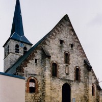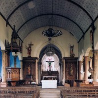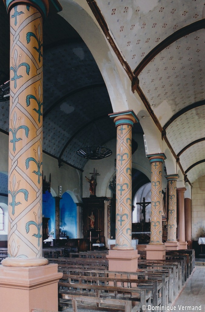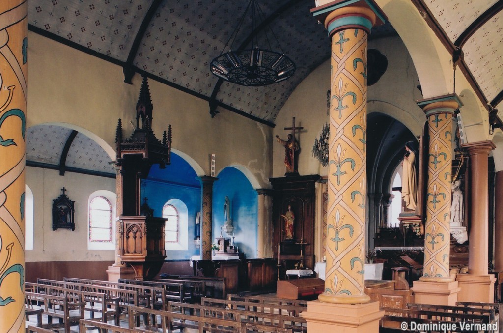 Reconstruite au 18ème siècle, la nef ouvre sur les bas-côtés par des arcades en cintre surbaissé retombant sur des piles circulaires. Tout l’édifice a été décoré au 19ème siècle d’une manière qui, discutable aujourd’hui, constitue cependant un bon exemple de l’idée que l’on se faisait à cette époque du Moyen Age. L’église a conservé plusieurs statues d’art populaire, dont un Saint-Amand avec les dragons et, surtout, une imposante et magnifique Vierge à l’Enfant, en pierre, du 16ème siècle (2005).