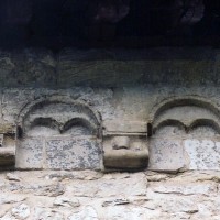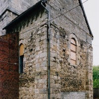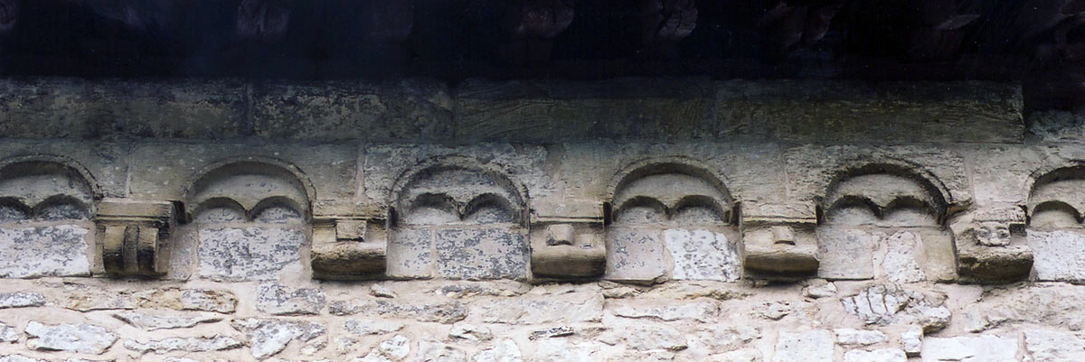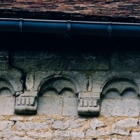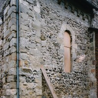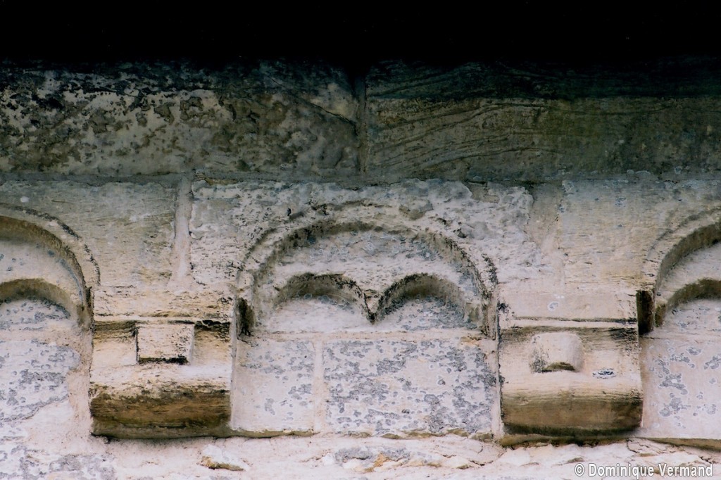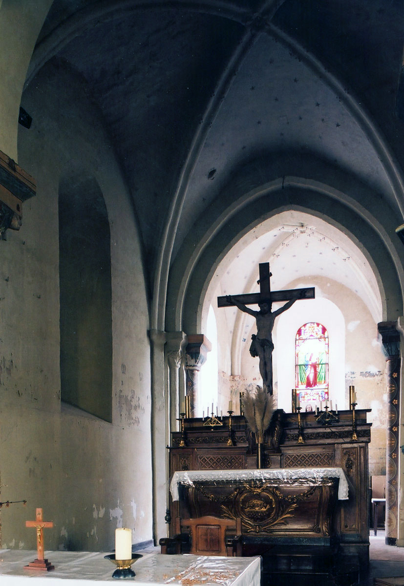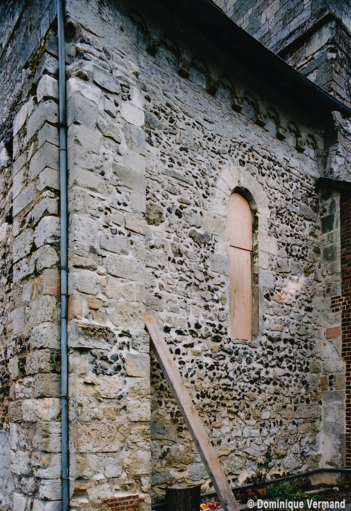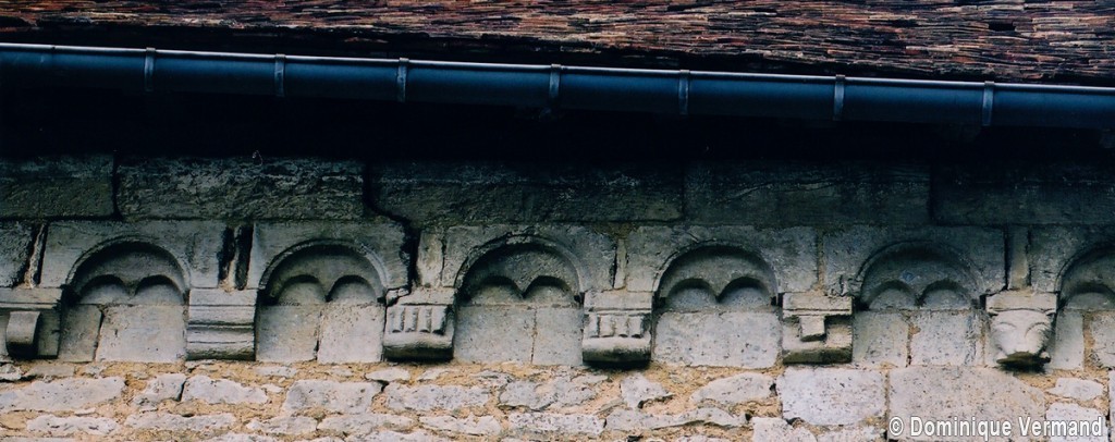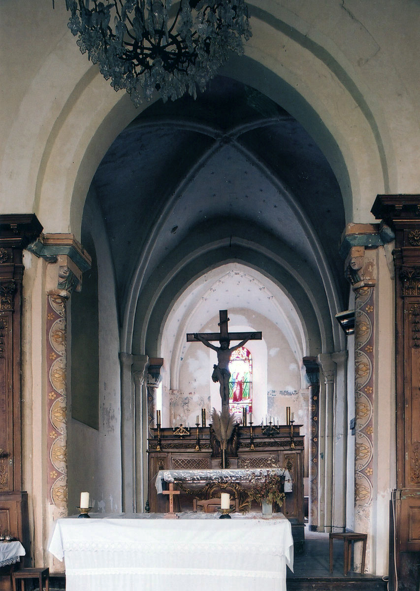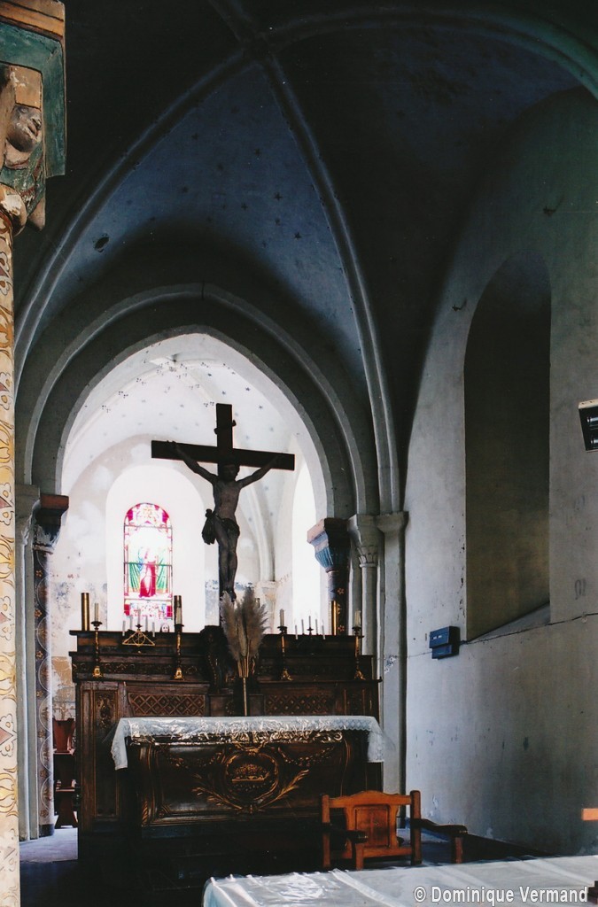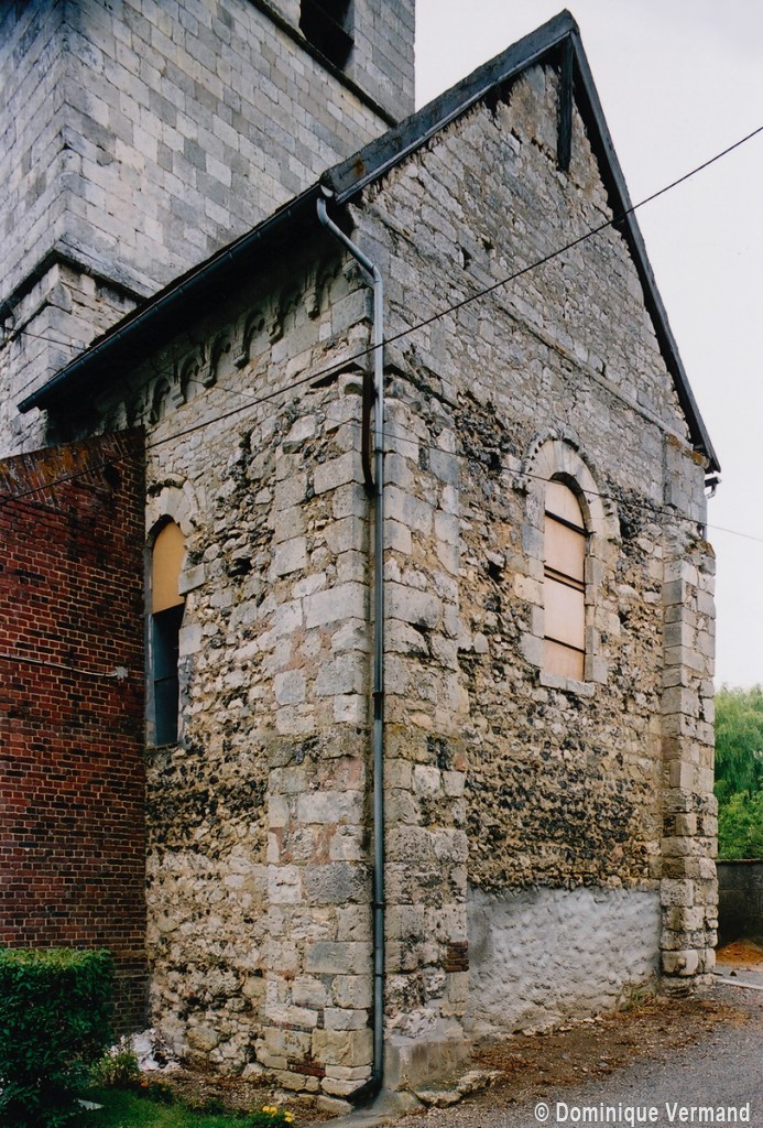 Profilées d’une arête entre deux tores, les ogives retombent, comme les deux arcs doubleaux, sur des chapiteaux au décor assez fruste. L’un représente trois petits personnages sous une gueule monstrueuse, deux autres comportent des têtes assez grotesques aux angles, deux autres encore montrent un décor de godrons (cornets), très répandu en Normandie et en Angleterre à cette époque. A l’extérieur, les murs – bâtis dans un mélange de moellons et de silex – sont épaulés par des contreforts très plats. Les fenêtres sont en plein cintre et celle du chevet est soulignée par un cordon de billettes. Très bien conservée, la corniche est une bonne illustration de la corniche dite » beauvaisine « , très répandue dans l’Oise au 12ème siècle. Elle est constituée d’une suite d’arcatures en plein cintre recoupées par deux petites arcatures secondaires et reposant sur des petits modillons au décor souvent géométrique.