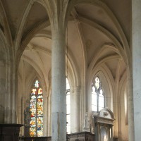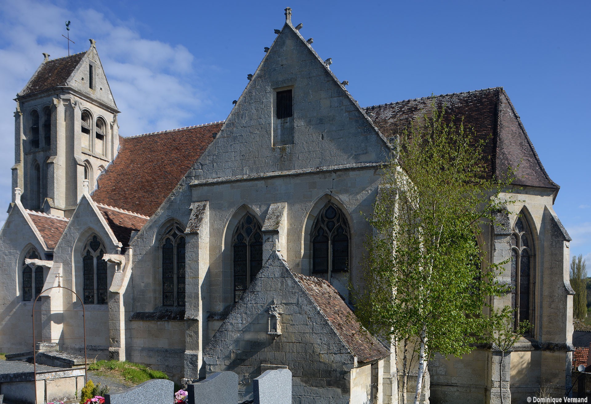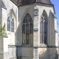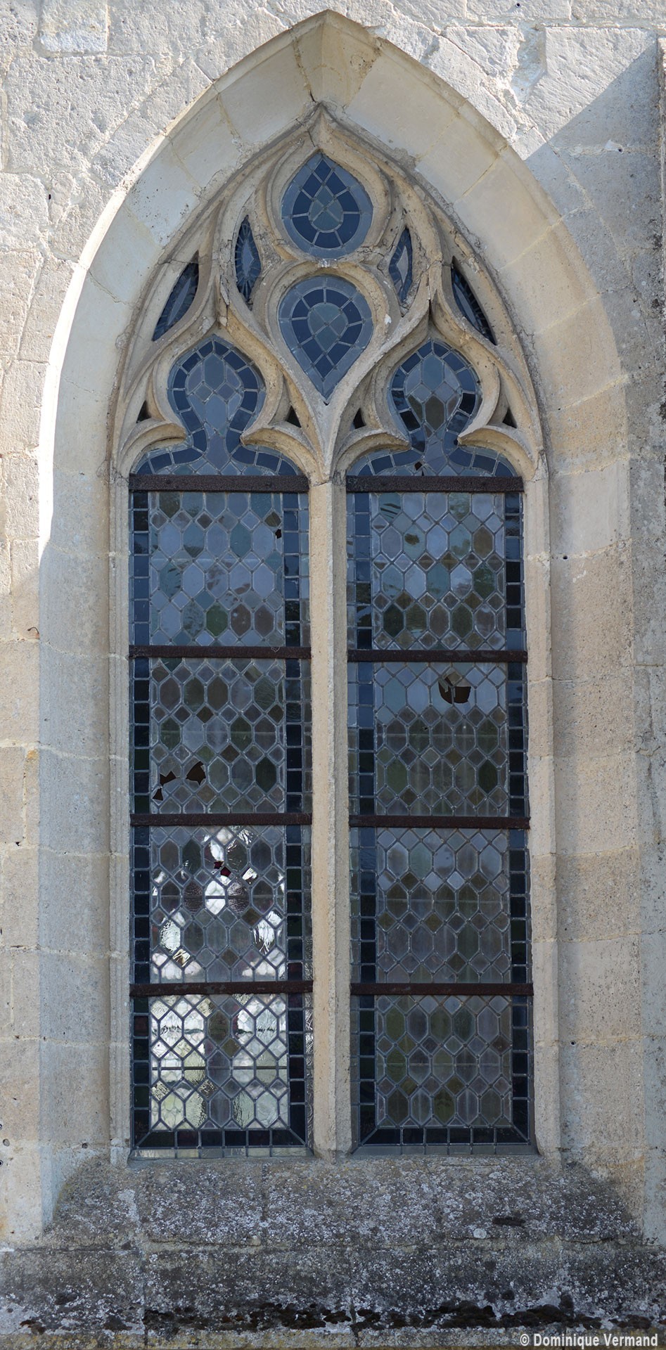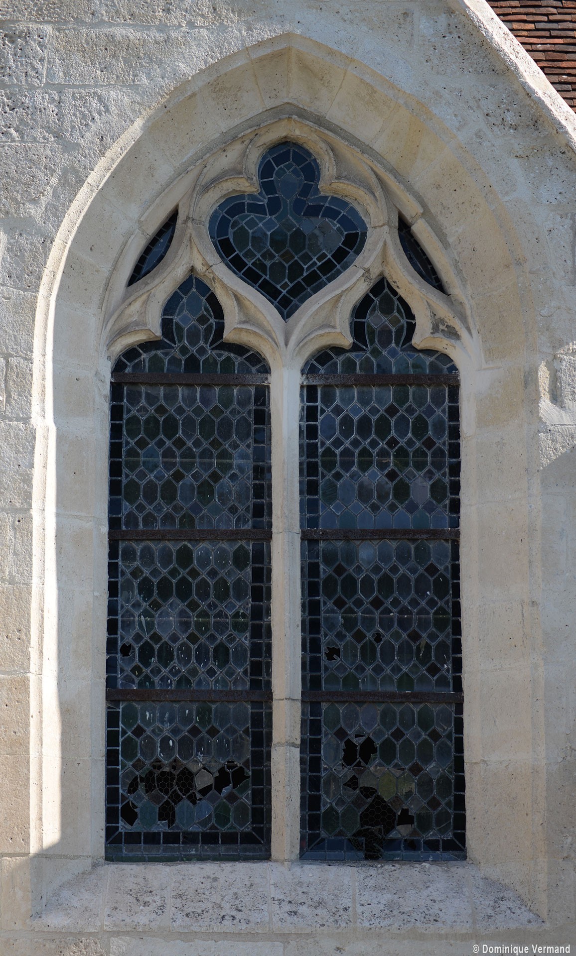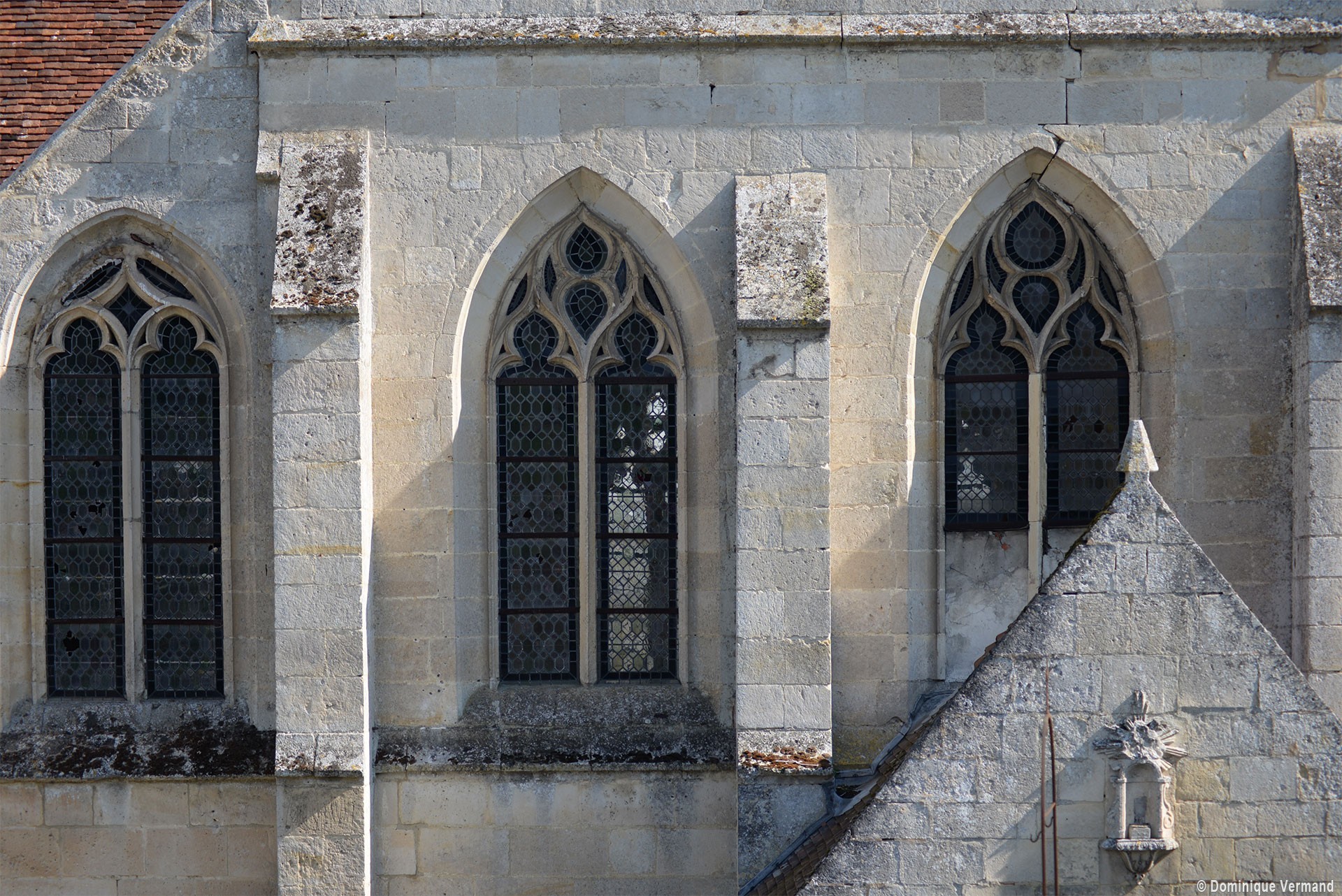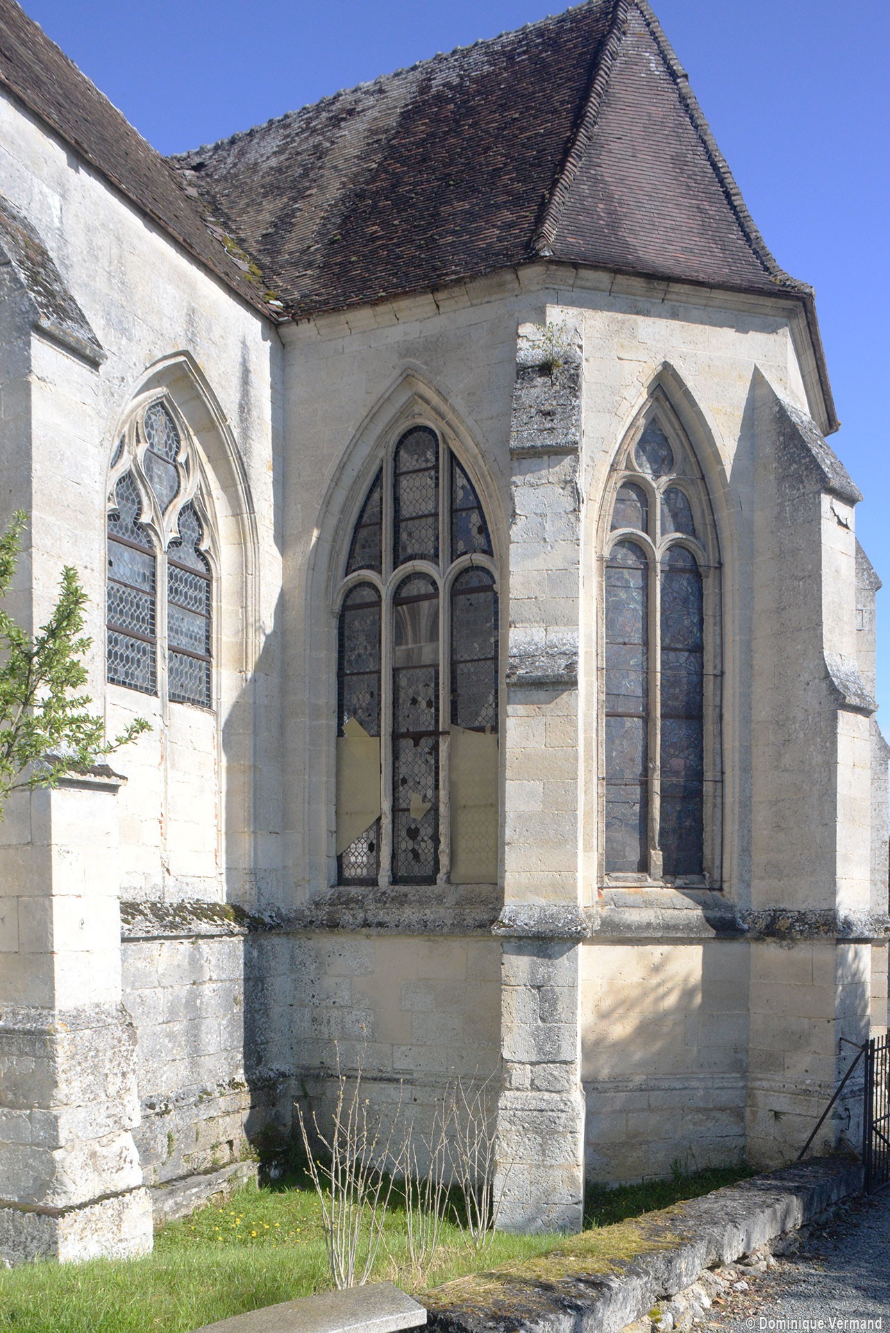 La travée droite de l’abside est également couverte d’une voûte d’ogives tandis que la partie terminale comporte deux nervures qui viennent buter contre le doubleau intermédiaire, réminiscence d’une disposition fréquente au 12ème siècle dans le Soissonnais. Si toutes les fenêtres sont en arc brisé, le réseau de celles du choeur est en plein cintre et montre l’influence des formes de la Renaissance, contrairement aux autres fenêtres, qui sont de style gothique flamboyant.