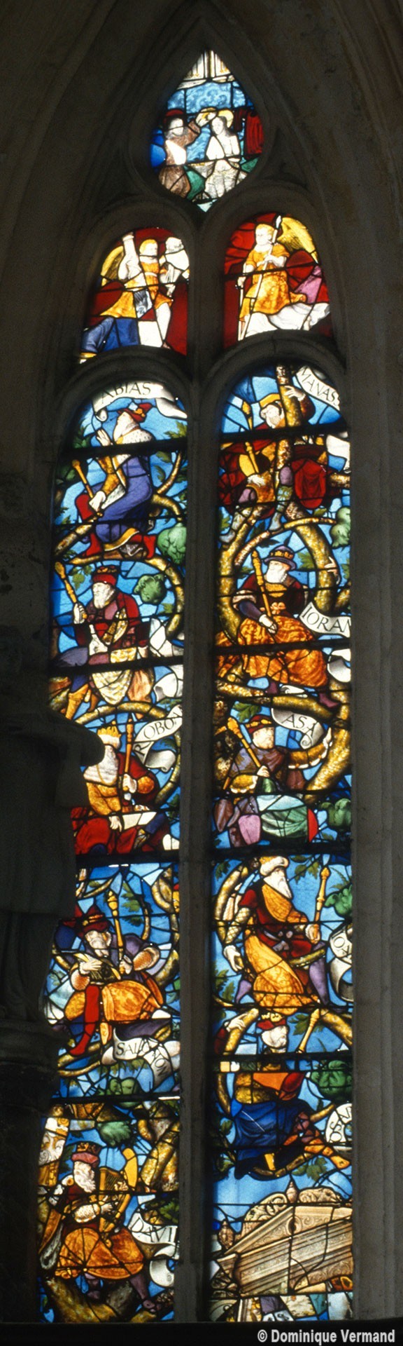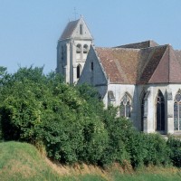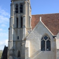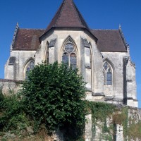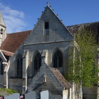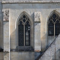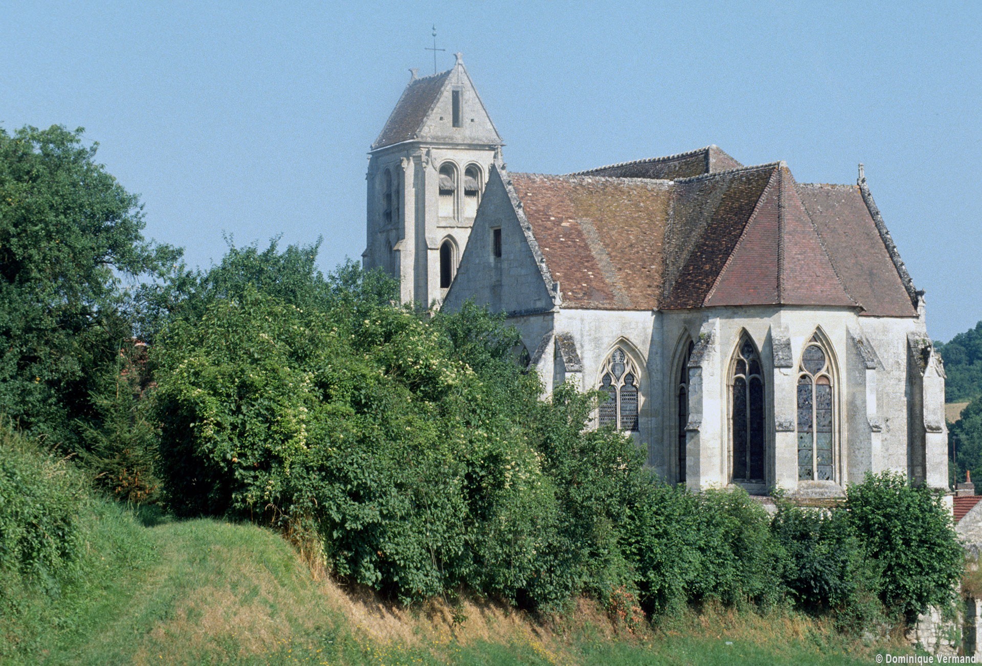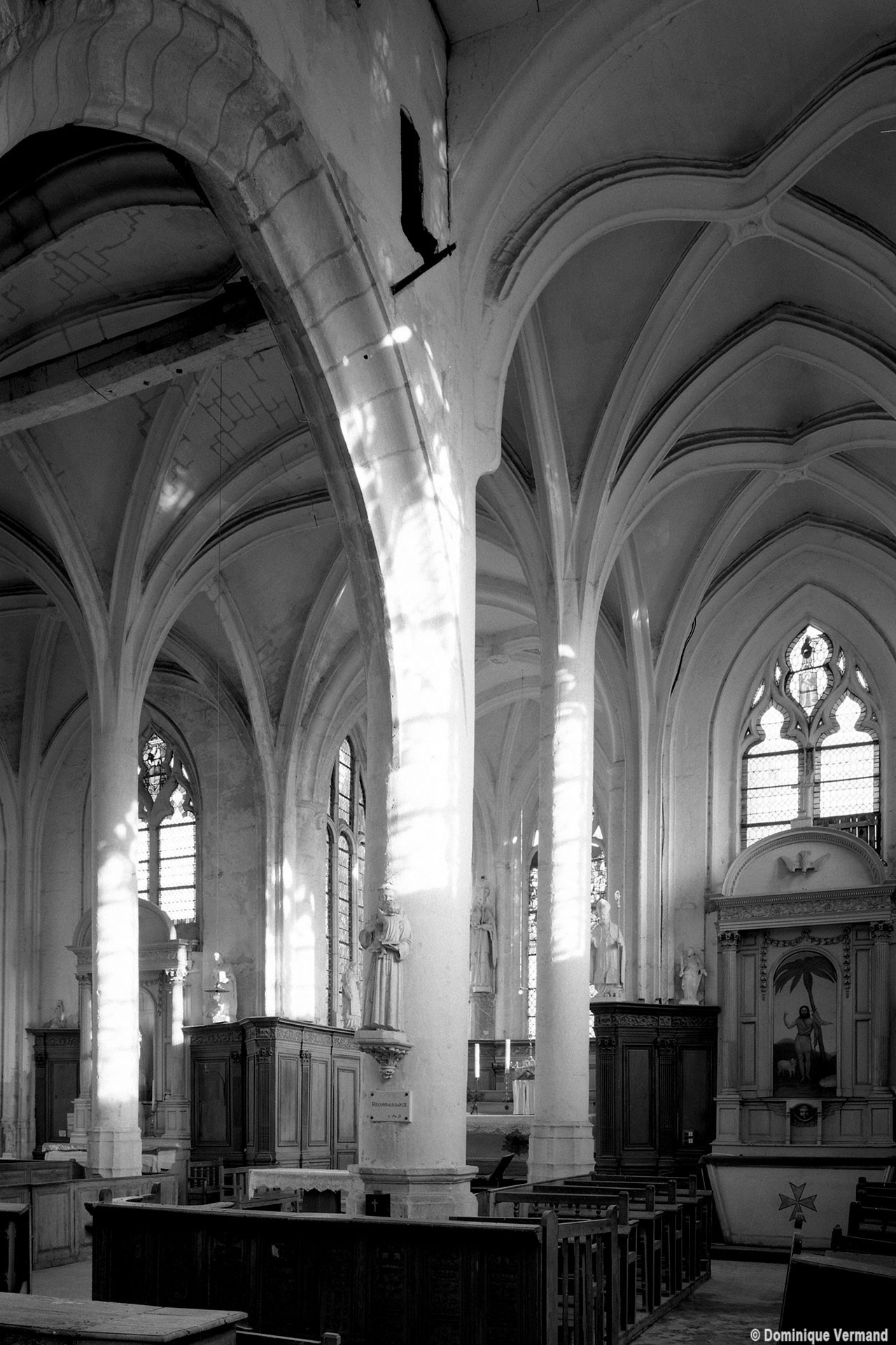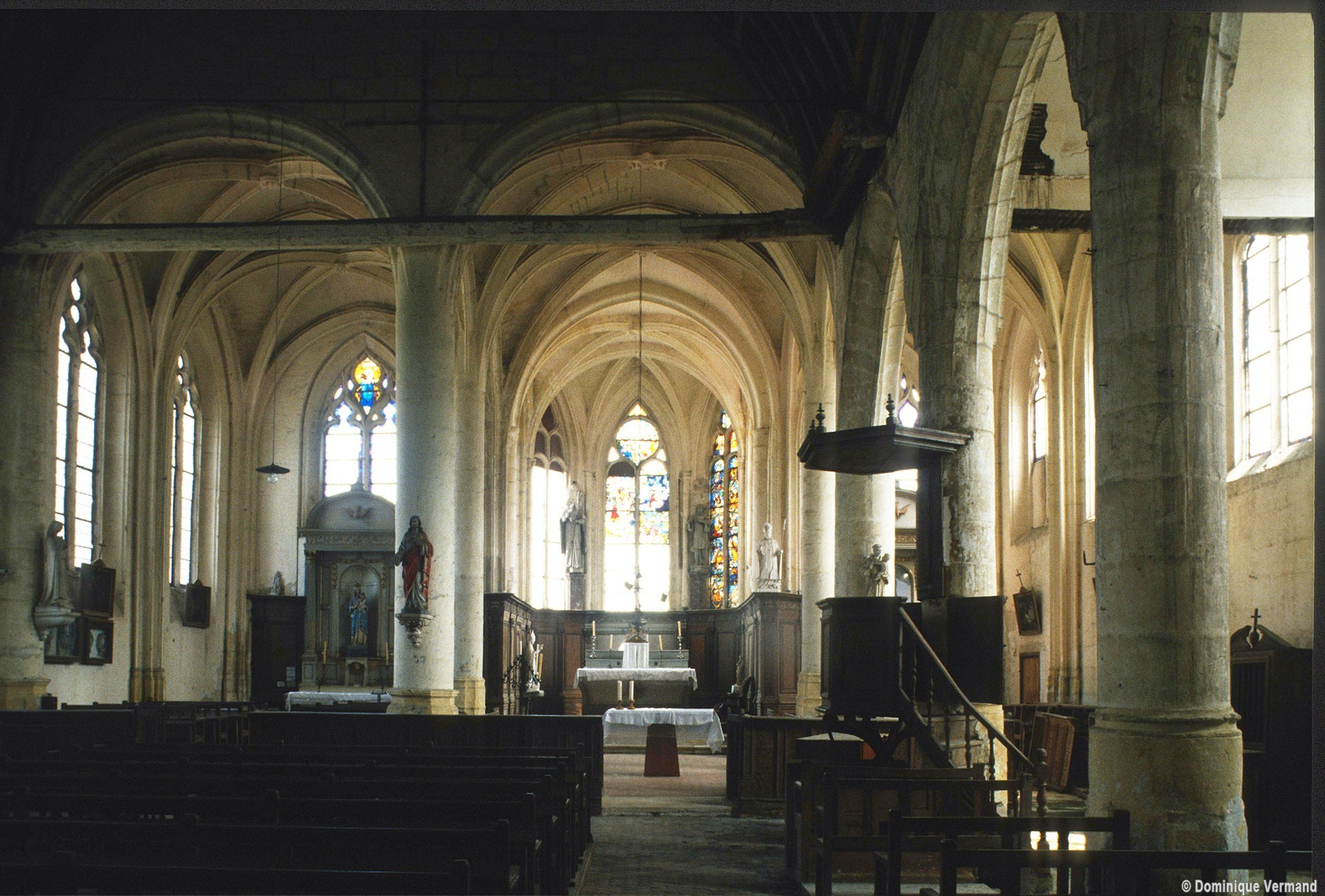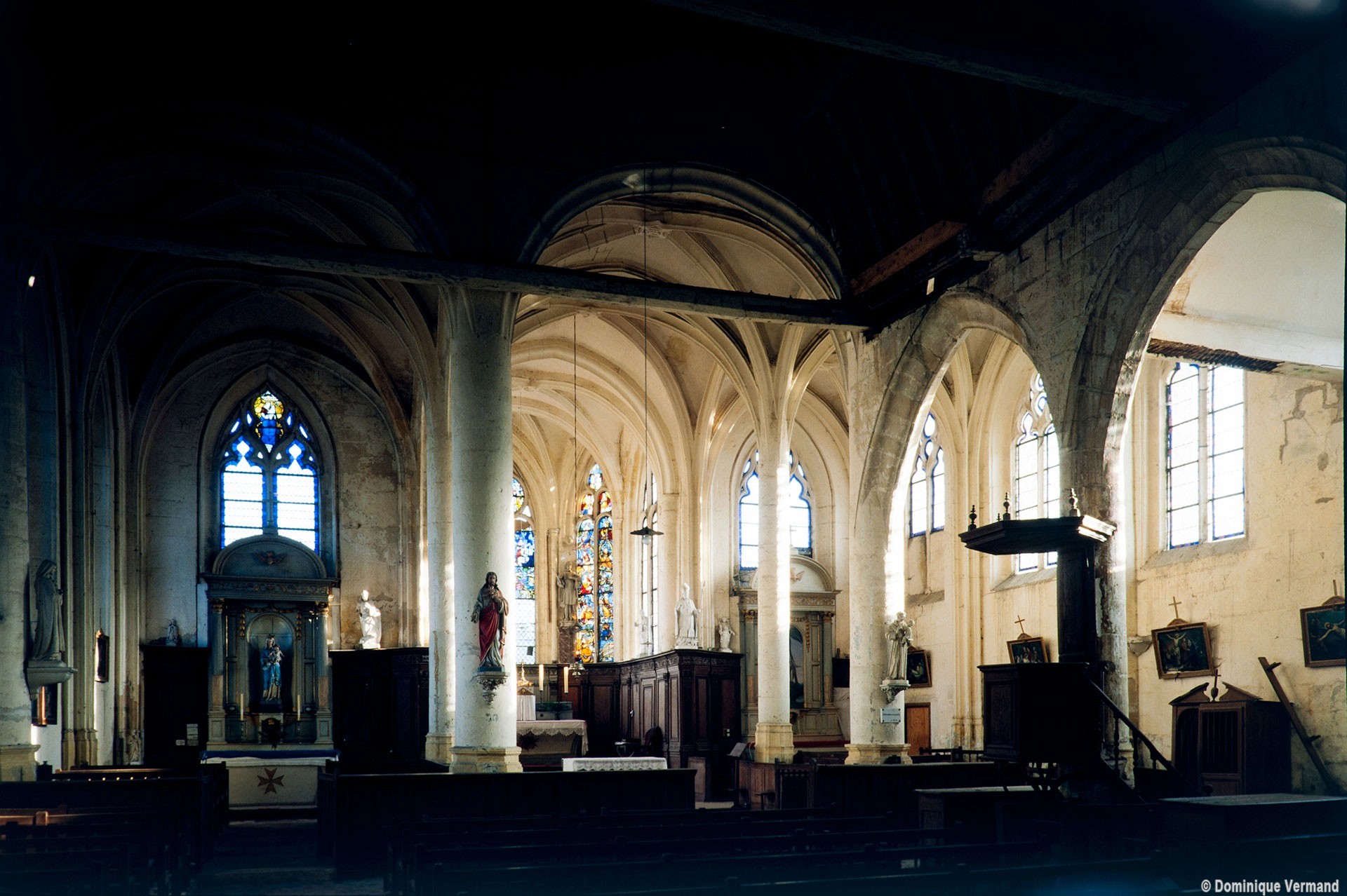 La travée droite de l’abside est également couverte d’une voûte d’ogives tandis que la partie terminale comporte deux nervures qui viennent buter contre le doubleau intermédiaire, réminiscence d’une disposition fréquente au 12ème siècle dans le Soissonnais. Si toutes les fenêtres sont en arc brisé, le réseau de celles du choeur est en plein cintre et montre l’influence des formes de la Renaissance, contrairement aux autres fenêtres, qui sont de style gothique flamboyant.