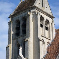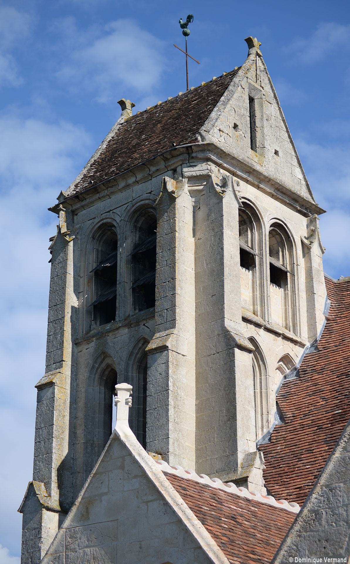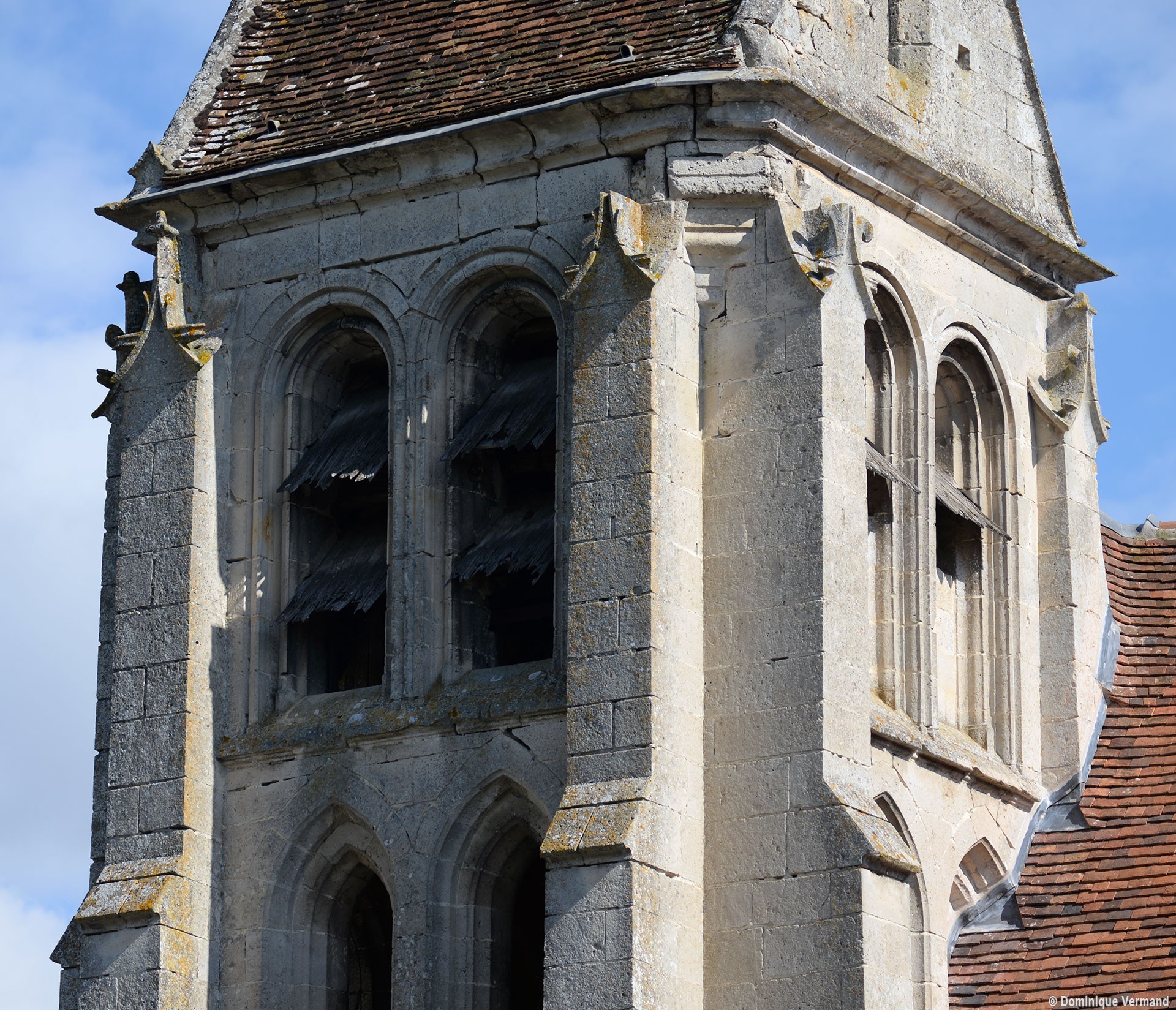 Construite en façade, la tour, qui a conservé son toit en bâtière du 16ème siècle, ne manque pas d’allure. Elle comporte deux étages de baies – en arc brisé, puis en plein cintre – et ses contreforts se terminent en larmiers ouvragés. Elle a sans doute servi de modèle à celle de Morcourt, aujourd’hui réduite à un seul côté.
