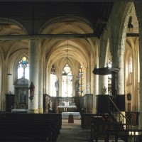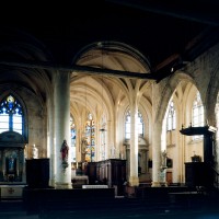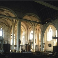 Le côté nord de la nef a conservé une fenêtre associant deux lancettes et un trilobe non inscrit qui date de la fin du 13ème siècle et représente le seul vestige marquant d’une église antérieure. Très large, la nef réunit en fait, dans un même espace, l’ancien bas-côté nord et le vaisseau central. Elle est couverte d’une intéressante charpente en carène dont les entraits se terminent par des engoulants à tête de monstre qui alternent avec des blochets. La communication avec le bas-côté sud se fait par trois arcades brisées retombant sur des piles circulaires.