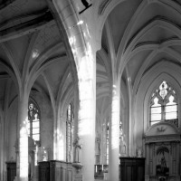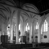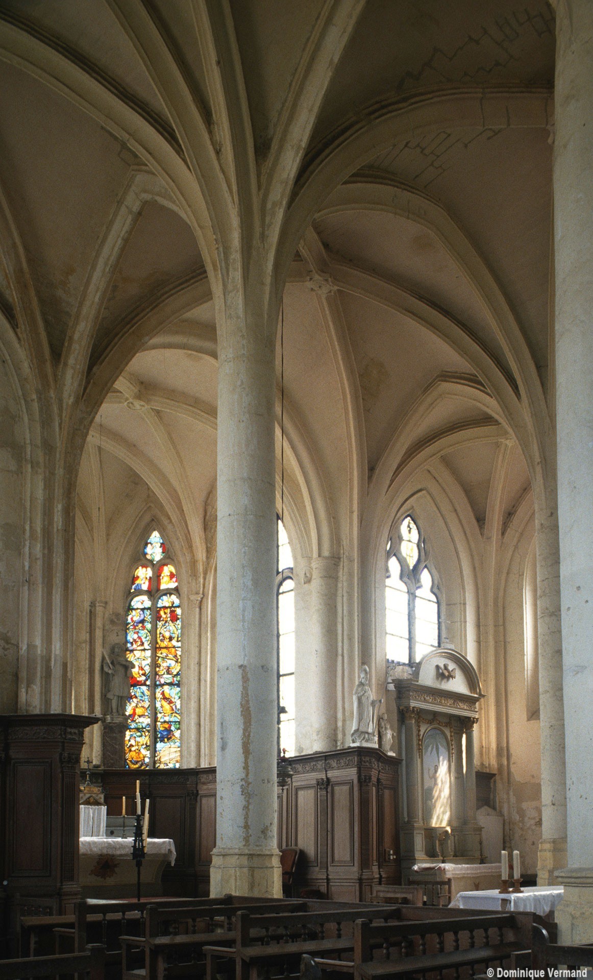 Le choeur forme un ensemble d’une rare qualité, très ouvert et d’une grande élégance, auquel on ne peut manquer d’être sensible dès l’entrée de l’église. Suivant un parti inauguré au 13ème siècle à Saint-Jean-aux-Bois et, davantage encore, à Nogent-sur-Oise, l’espace qui précède l’abside forme comme un transept et est partagée en trois vaisseaux dont les voûtes d’ogives retombent vers le centre, telles les feuilles d’un palmier, sur deux colonnes isolées, très minces. Cette structure de choeur-halle se retrouve, parmi bien d’autres exemples, à Saint-Denis de Crépy-en-Valois.