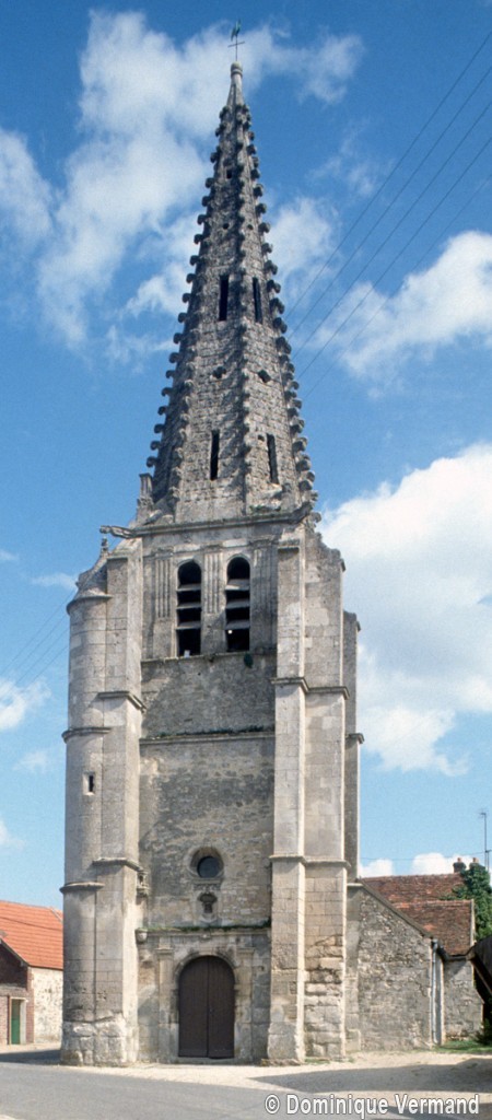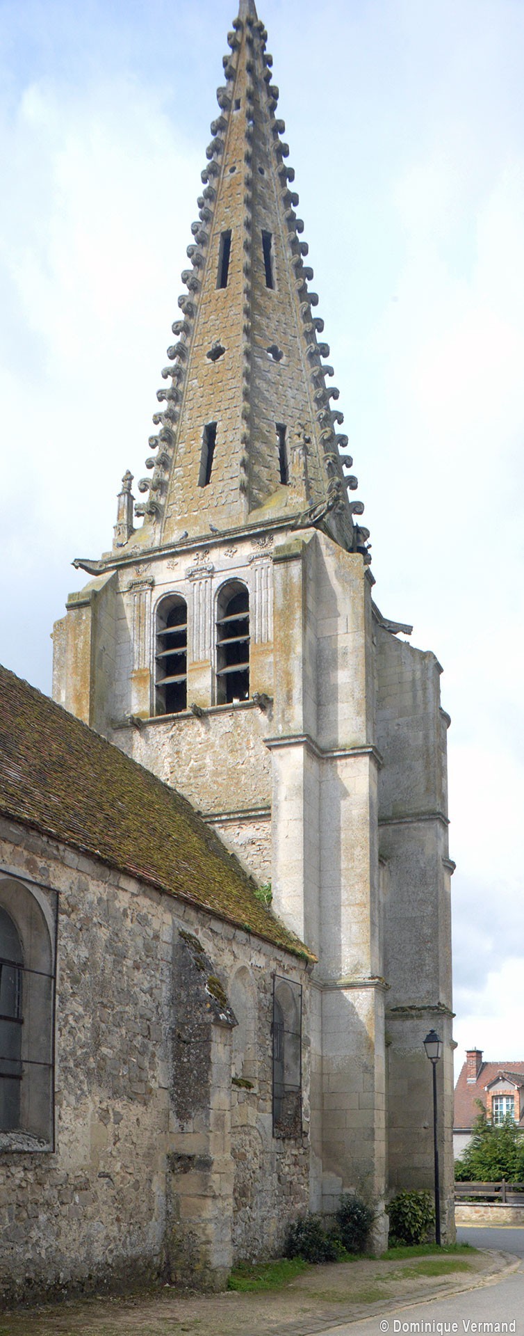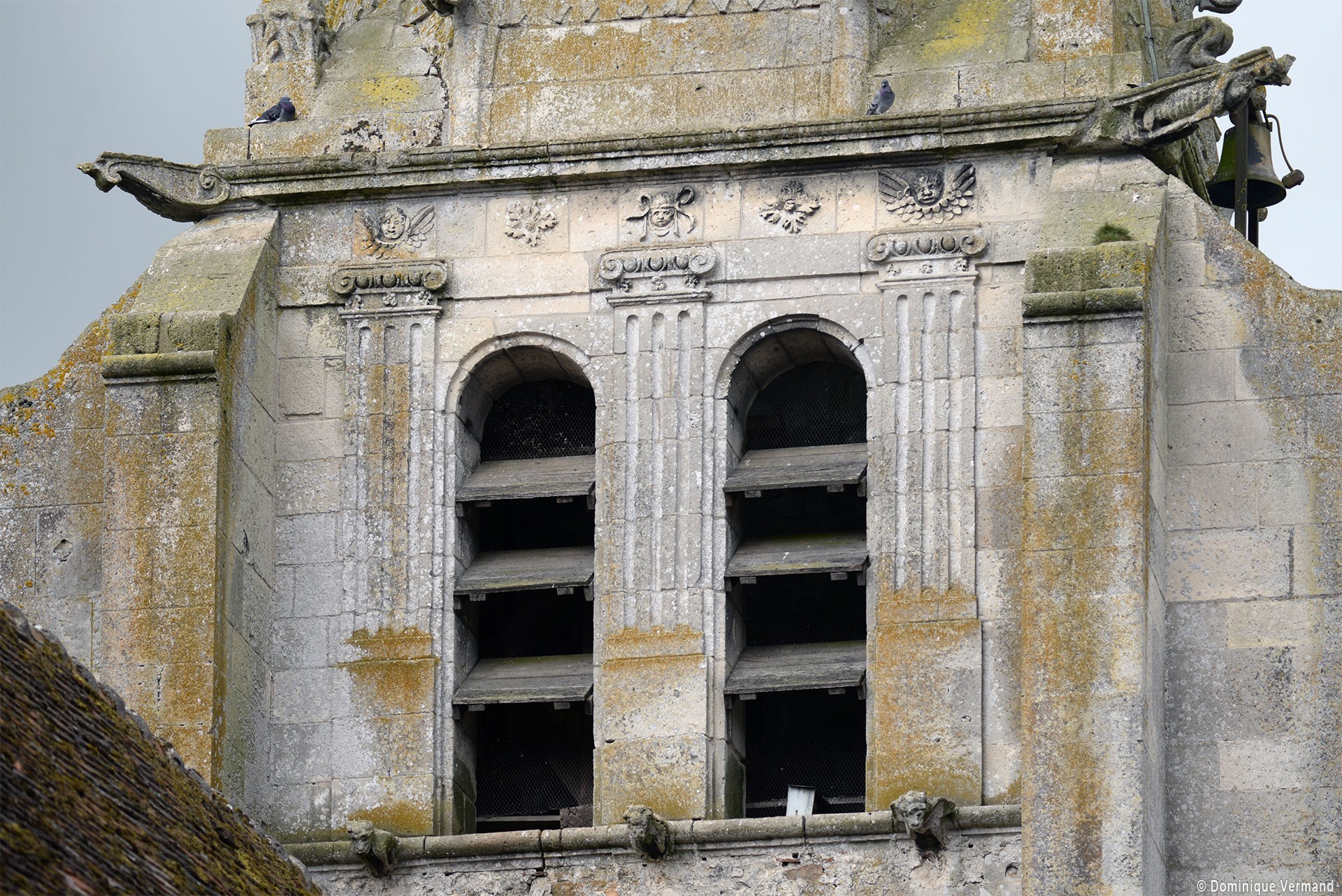 Un clocher porche, d’exécution soignée, vient compléter ces transformations. Le portail, très simple, est encadré par des pilastres lisses et surmonté d’une petite niche et d’un oculus. Au-dessus d’une importante portion de mur nu, l’étage du beffroi se signale par les pilastres cannelés à chapiteaux ioniques qui encadrent les baies en plein cintre et la délicate frise décorée de masques et de choux frisés qui tient lieu de corniche. Surmontant cette tour de style pleinement renaissance, la flèche octogonale en pierre aux arêtes garnies de crochets continue la tradition des flèches romanes et gothiques du Valois dont celle de la cathédrale de Senlis constitue le plus beau fleuron. Aux angles, une gargouille et des petits pinacles se substituent, avec moins de bonheur cependant, aux traditionnelles petites pyramides.