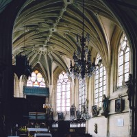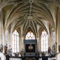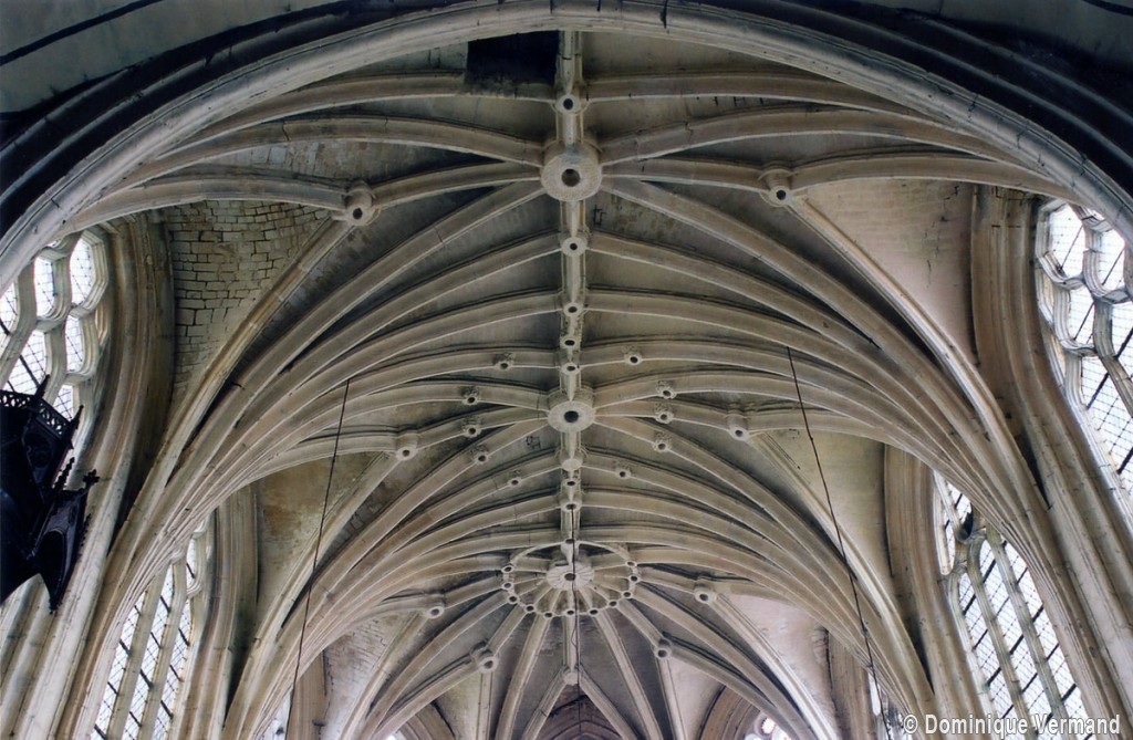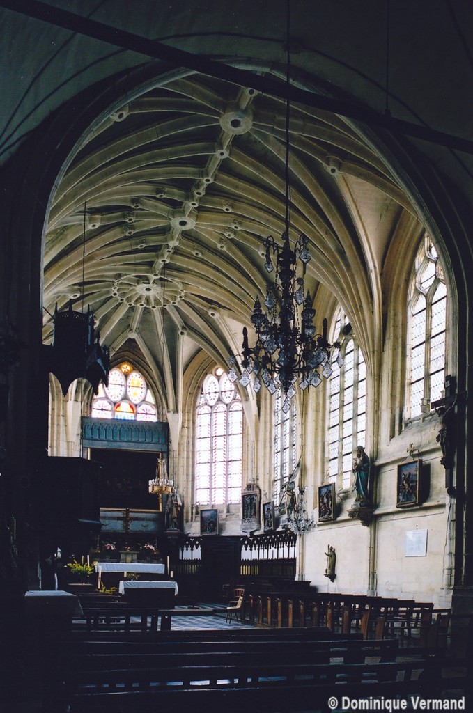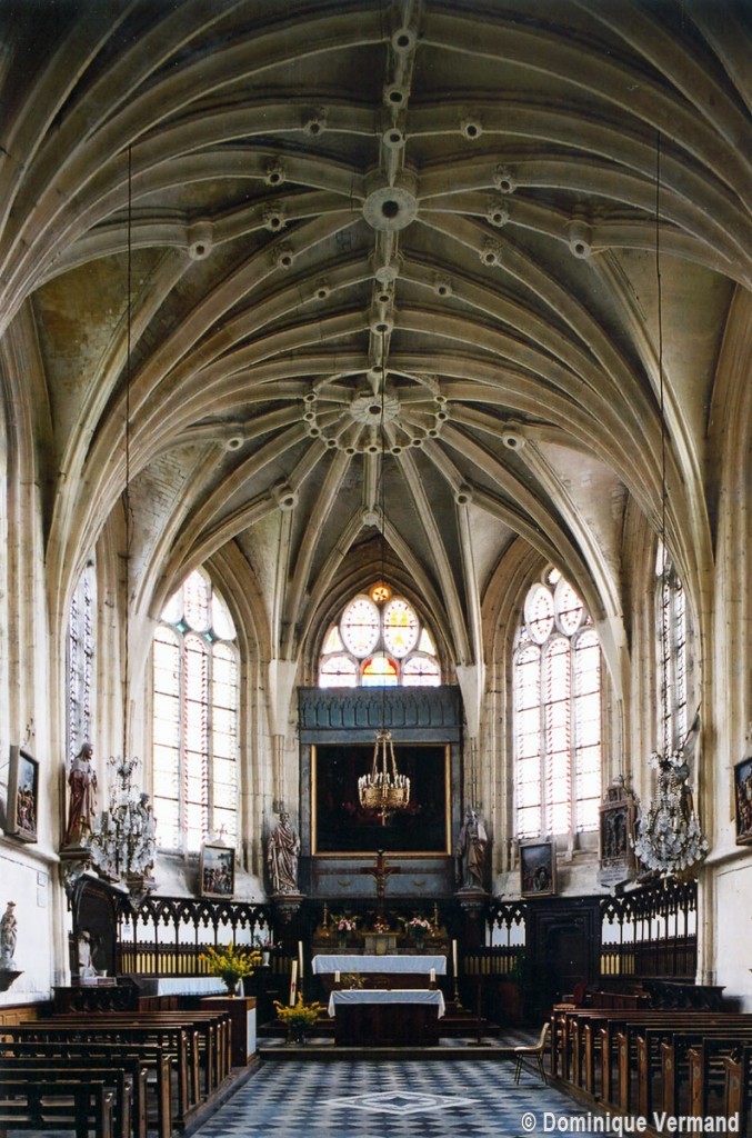 Ce dernier est incontestablement la partie la plus remarquable de l’édifice et doit sans doute sa richesse à la générosité de la famille de Barentin, titulaire de la seigneurie du lieu. Très homogène, il comprend deux travées droites et une abside pentagonale. C’est, bien sûr, le magnifique réseau des voûtes qui frappe d’emblée. A la croisée d’ogives s’ajoutent ici, et systématiquement, des liernes et des tiercerons (nervures secondaires) qui en font un exemple particulièrement représentatif des voûtes de la fin du gothique. De très nombreuses clefs pendantes ou garnies d’écussons, dessinant notamment des couronnes dans la seconde travée et l’abside, enrichissaient autrefois le réseau.