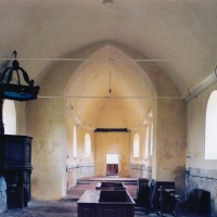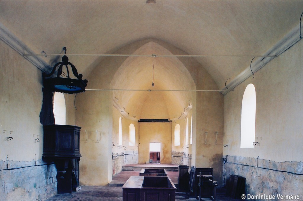 Saint-Jacques est un édifice à la silhouette très allongée dont le plan comprend une nef unique (sans bas-côtés) et un chœur beaucoup plus étroit terminé par une abside à trois côtés. C’est un édifice relativement homogène qui doit remonter, pour l’essentiel, au 17ème siècle. Un simple lambris, à la pente marquée dans le chœur et, au contraire, surbaissé dans la nef, le couvre. Au revers de la façade, un ouvrage en charpente indépendant des murs supporte le petit clocher couvert d’ardoises.