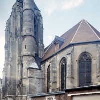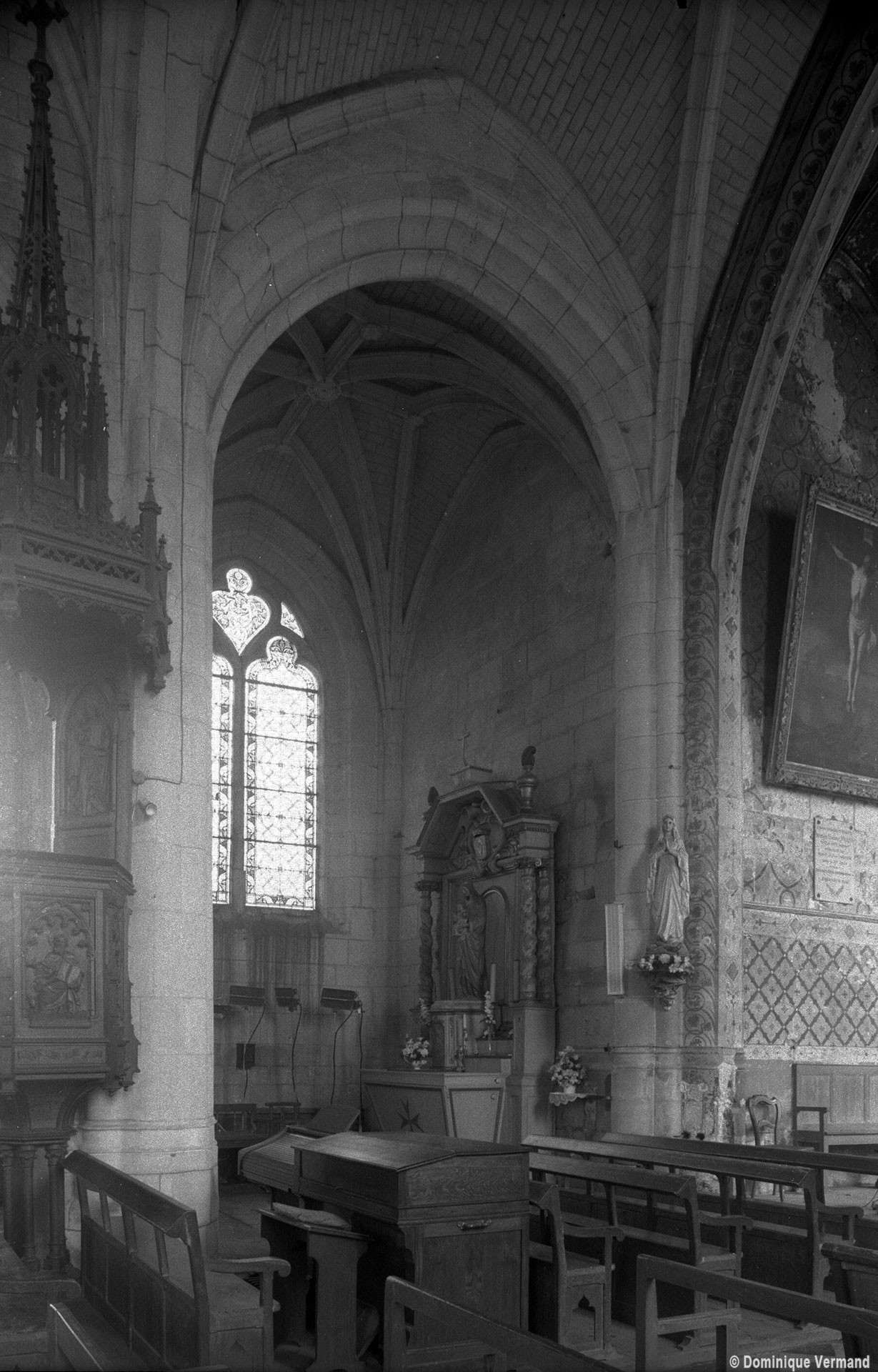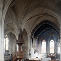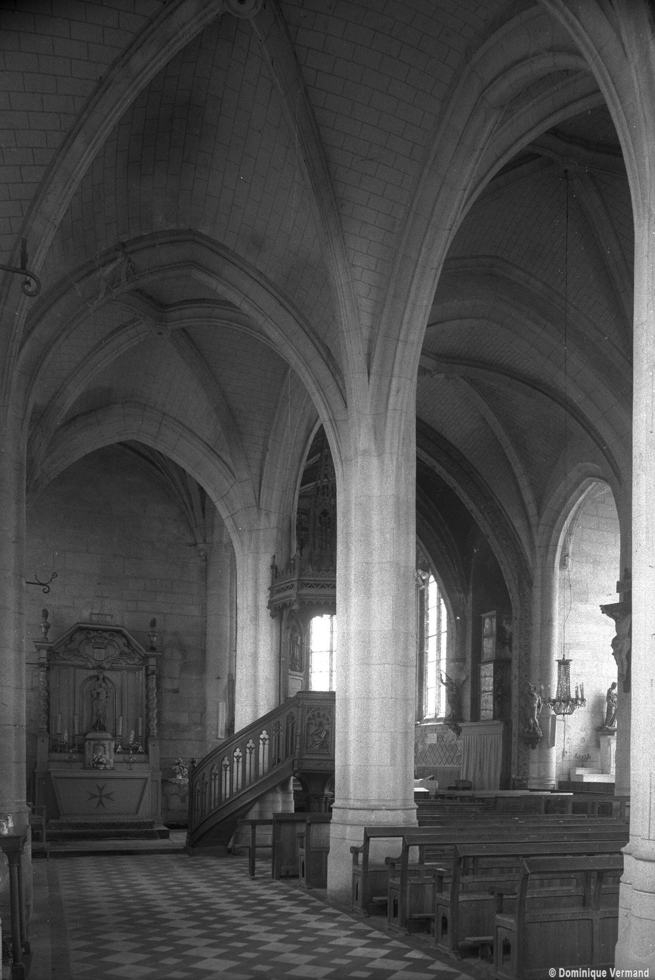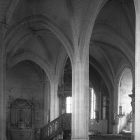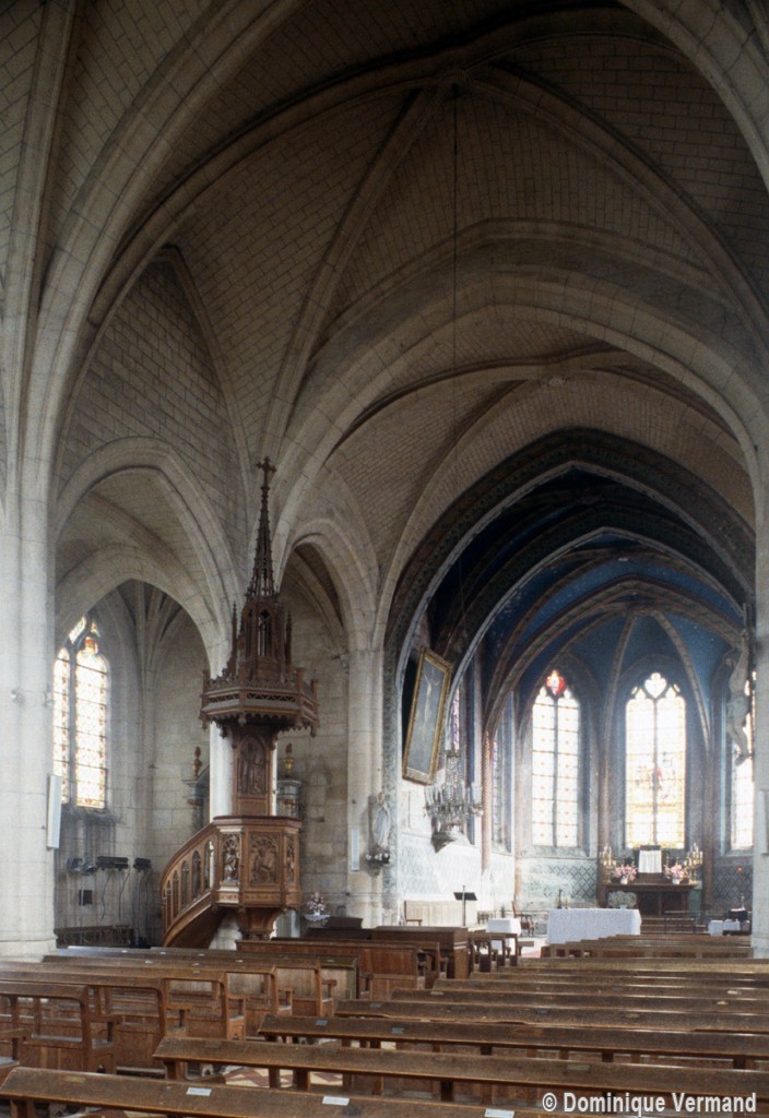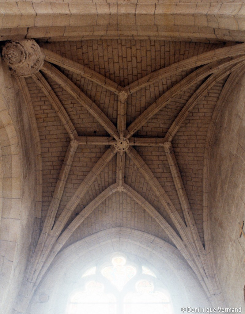 A cette nef romane faisait suite un transept saillant, maintenant confondu avec la nef actuelle, dont il constitue la quatrième travée et qui a servi de modèle à la reconstruction du 19ème siècle. Les ogives et arcades retombent directement dans les piles, sans l’intermédiaire de chapiteaux. Si l’ancienne croisée est couverte d’une simple voûte d’ogives, les voûtes des croisillons se compliquent de liernes et de tiercerons (ogives intermédiaires), dont l’emploi fréquent durant la période dite flamboyante de l’architecture gothique répondait davantage à un souci décoratif qu’à une réelle utilité technique, surtout sur d’aussi petites surfaces.