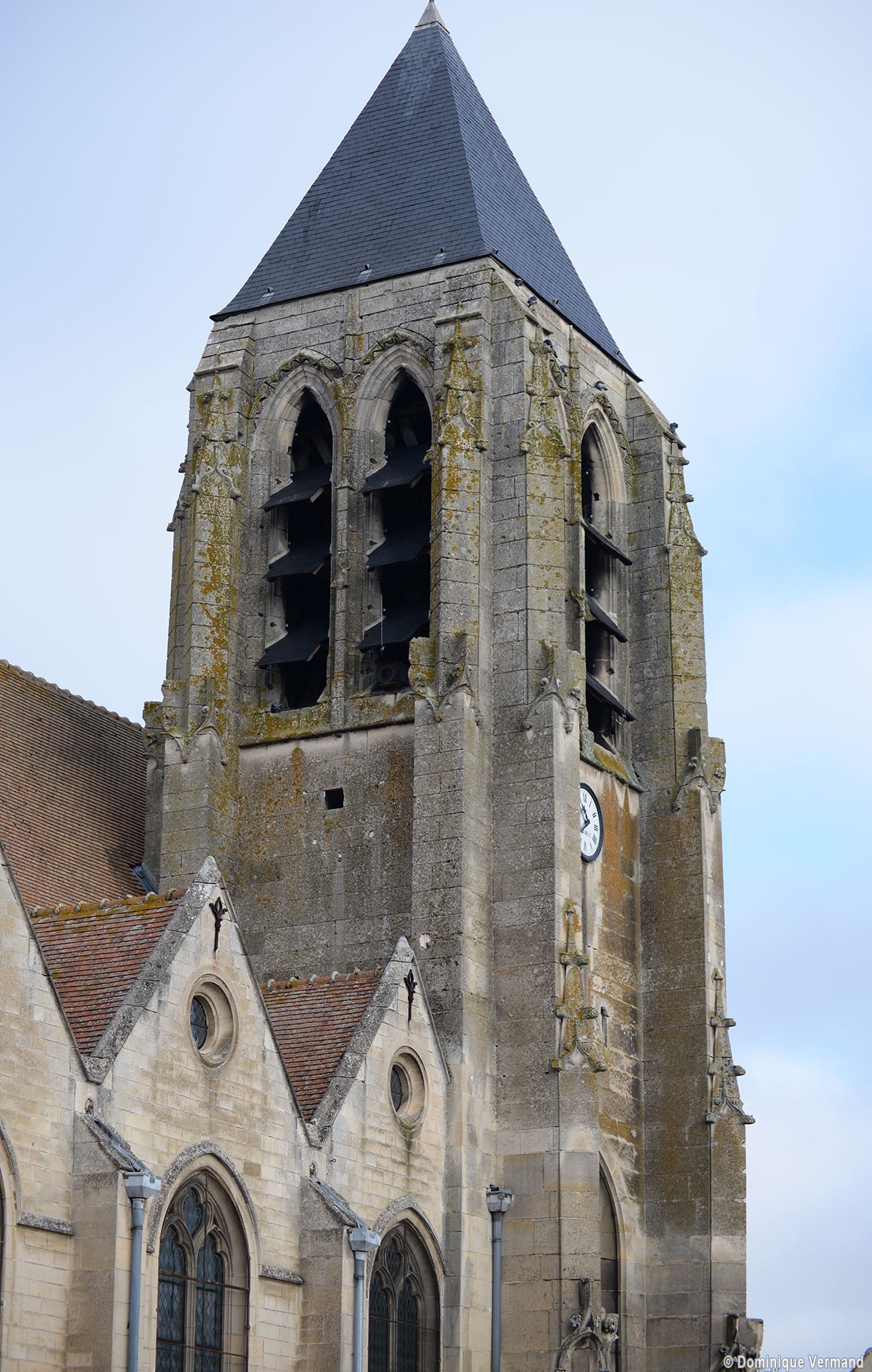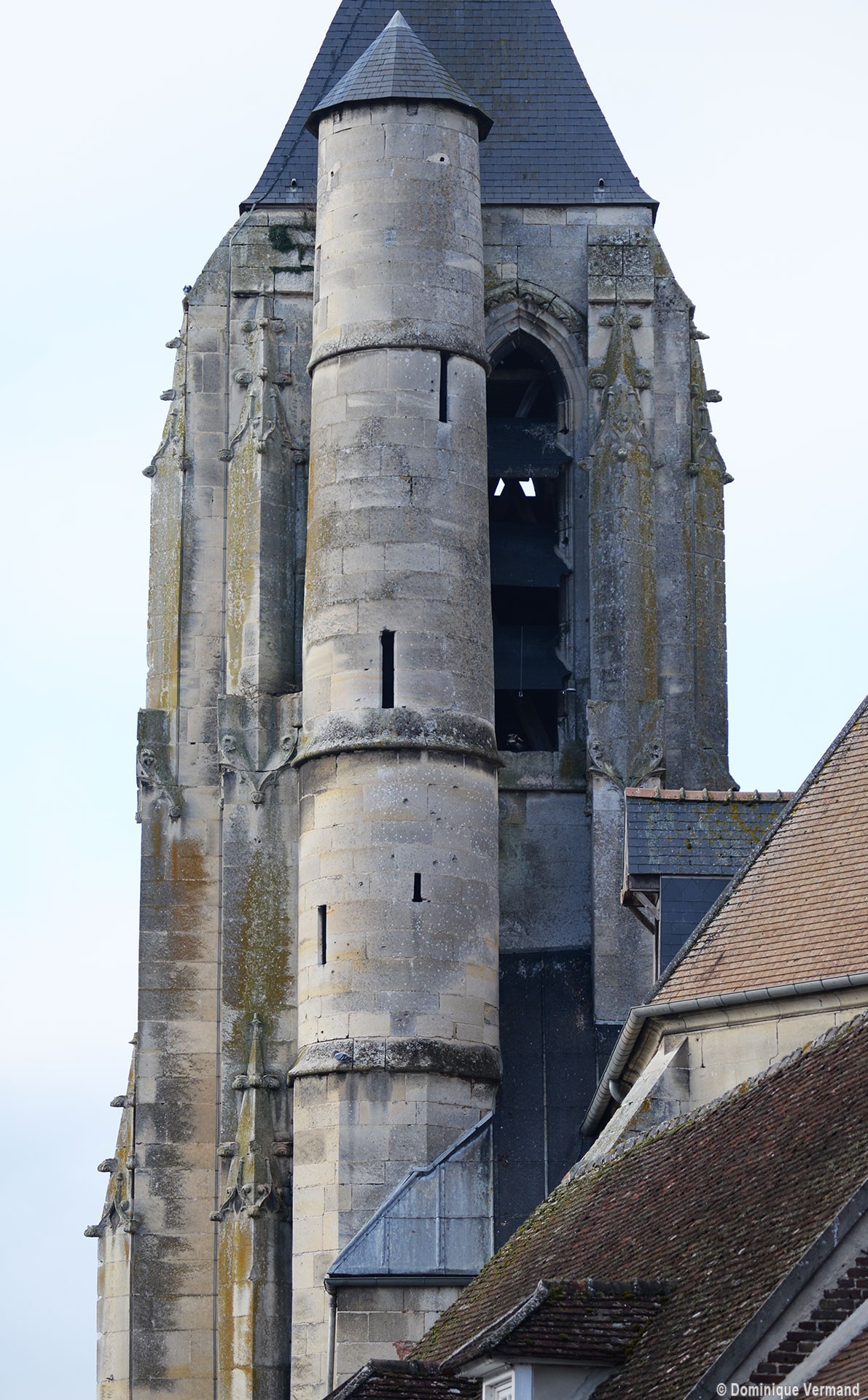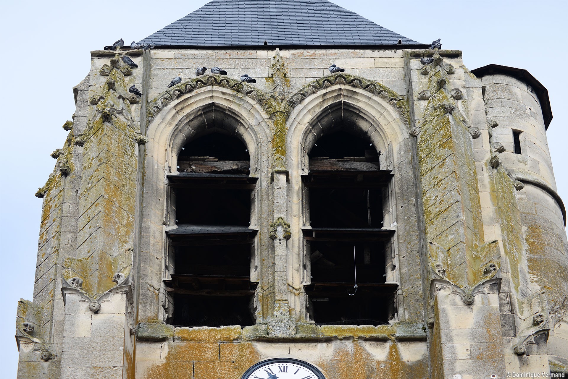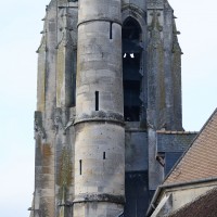 L’extérieur est dominé par la masse imposante du clocher flanqué, sur toute la hauteur de sa face est, d’une tourelle d’escalier. Au-dessus d’un haut soubassement sans ouvertures, l’étage du beffroi s’ajoure de deux longues baies géminées sur chaque face. Montant d’un seul jet, les contreforts sont délicatement sculptés de pinacles à crochets (2001).