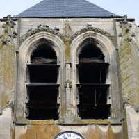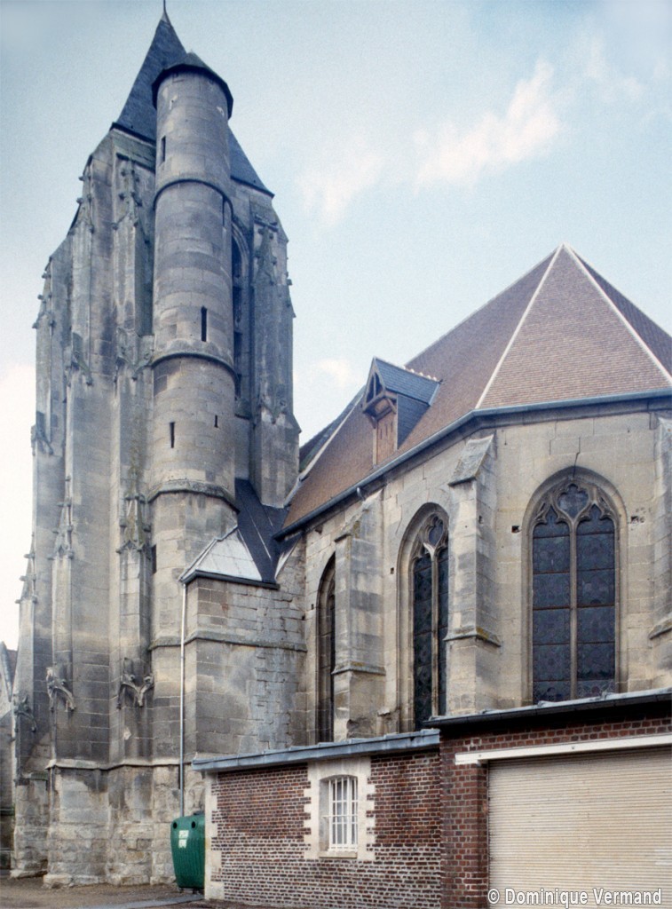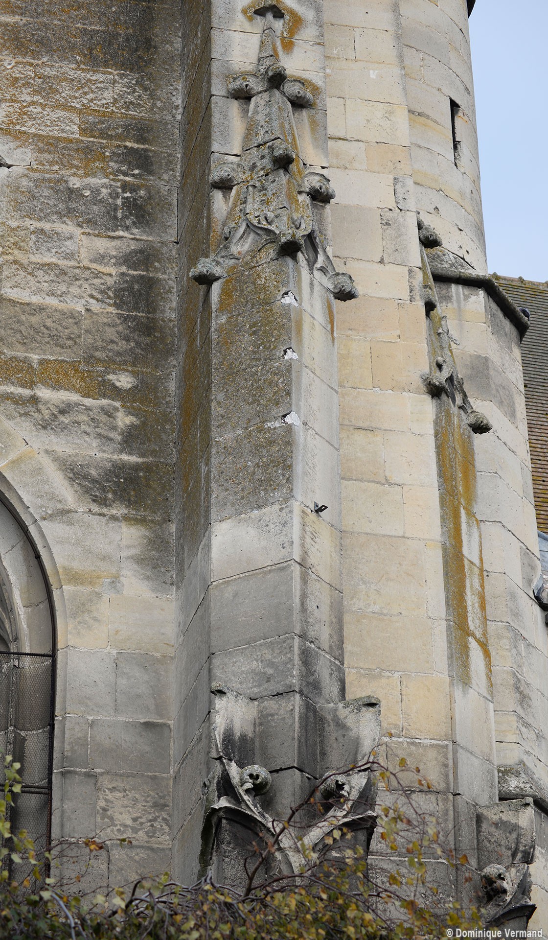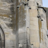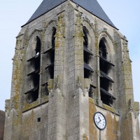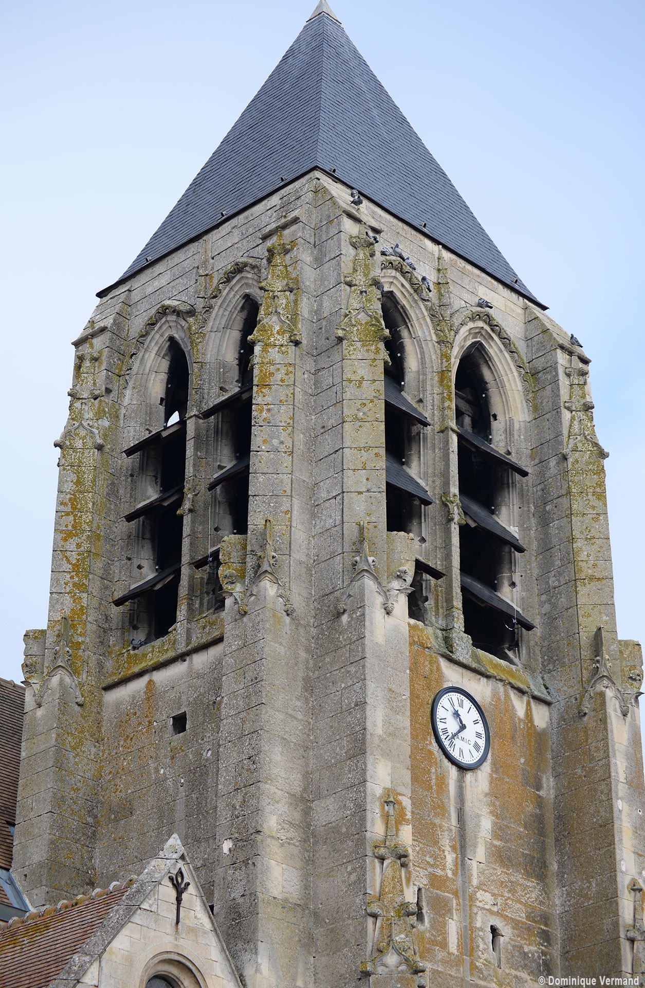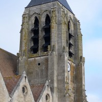 L’extérieur est dominé par la masse imposante du clocher flanqué, sur toute la hauteur de sa face est, d’une tourelle d’escalier. Au-dessus d’un haut soubassement sans ouvertures, l’étage du beffroi s’ajoure de deux longues baies géminées sur chaque face. Montant d’un seul jet, les contreforts sont délicatement sculptés de pinacles à crochets (2001).