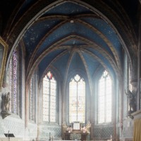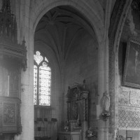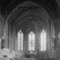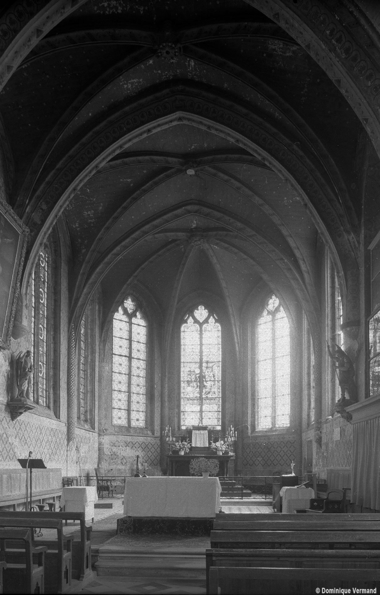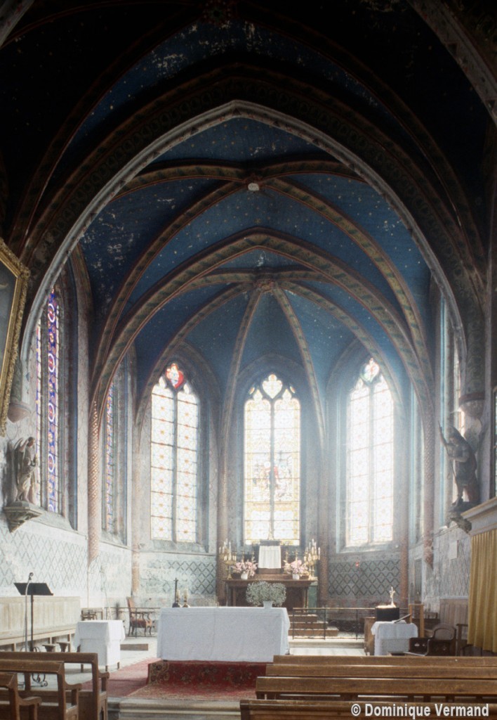 Très simple, le choeur vaut principalement pour les clefs armoriées de ses voûtes et ses fenêtres à réseau flamboyant. Quelques restes de vitraux du 16ème siècle se remarquent dans les soufflets de trois des fenêtres de l’abside. Entièrement peint de motifs néo-gothiques à la fin du 19ème siècle, ce choeur témoigne du goût – jugé aujourd’hui discutable – qui prévalait alors en matière de restauration de monuments médiévaux. Dans le même registre, l’église possède une chaire et un banc d’oeuvre qui ne sont pas sans qualités. Un petit autel classique avec retable est conservé dans l’ancien croisillon sud et un chapiteau du 13ème siècle a été reconverti en bénitier.