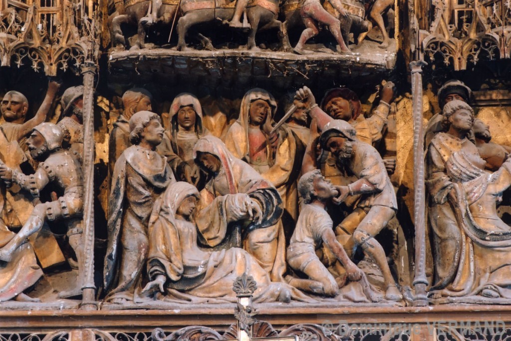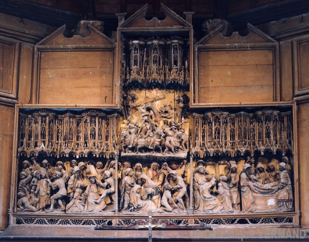 L’église est riche d’un mobilier aussi varié qu’exceptionnel, au premier rang duquel on retiendra le superbe retable en bois sculpté et doré du 16ème siècle. Représentant la Passion du Christ, il est vraisemblablement issu du même atelier que celui de Sérifontaine. Il faut également signaler la balustrade du début de la Renaissance de la tribune de la nef et le rare petit orgue Cavaillé-Coll du 19ème siècle qui y est installé. De nombreuses statues d’art populaire principalement du 16ème siècle, une poutre de gloire du 18ème siècle, un aigle lutrin du 17ème siècle ajoutent à l’intérêt de cette attachante église (2006).
