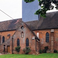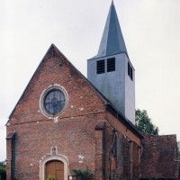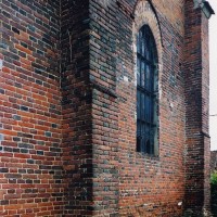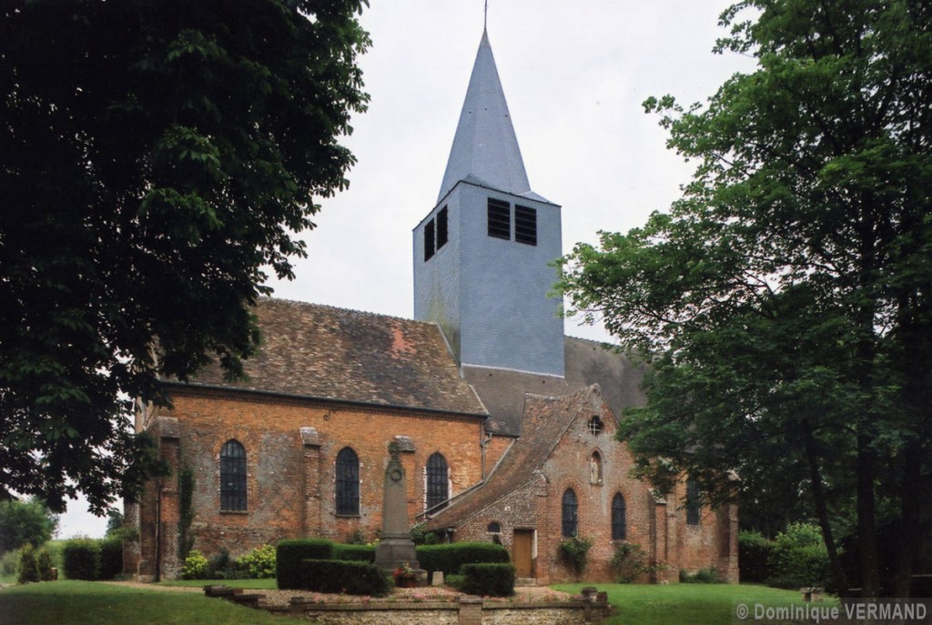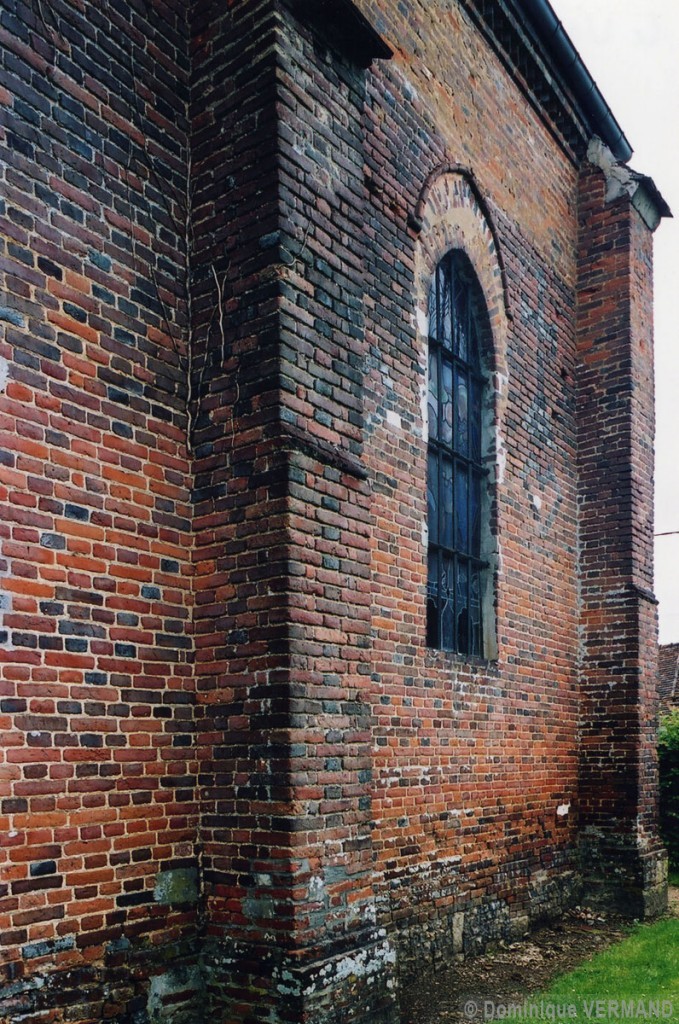 Tout l’édifice est construit en briques, très répandues dans cette région où la pierre est absente. La cuisson au feu de bois utilisée jusqu’au milieu du 19ème siècle pour leur fabrication ne permettant pas d’obtenir des briques homogènes, la couleur variant du rose clair au noir, ce défaut fut souvent mis à profit pour obtenir des effets décoratifs. C’est le cas ici où des motifs géométriques se remarquent à la façade de même qu’une croix de saint André et un coeur au mur nord de la nef. Toutes les fenêtres sont en arc brisé et celles de la nef étaient soulignées à l’origine par une petite moulure, toujours en briques.