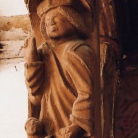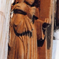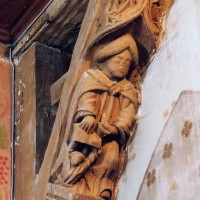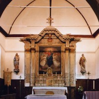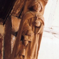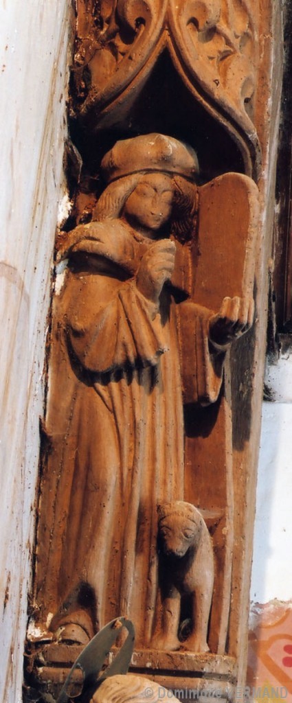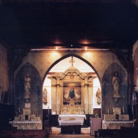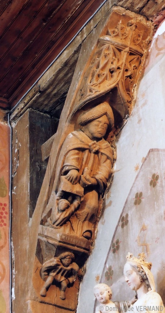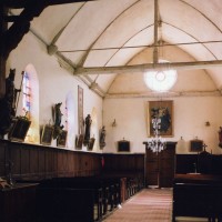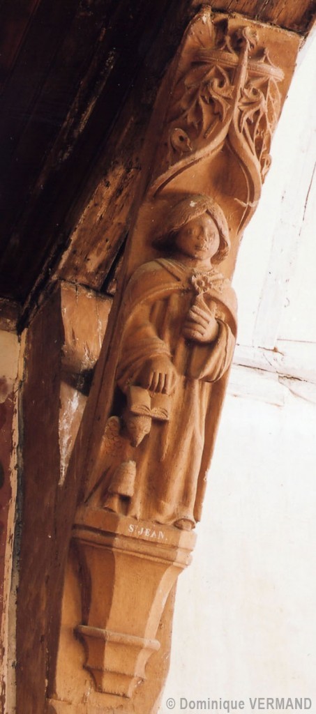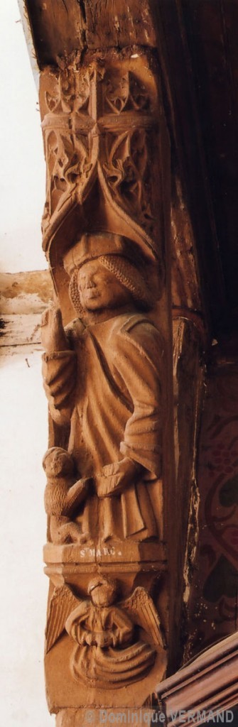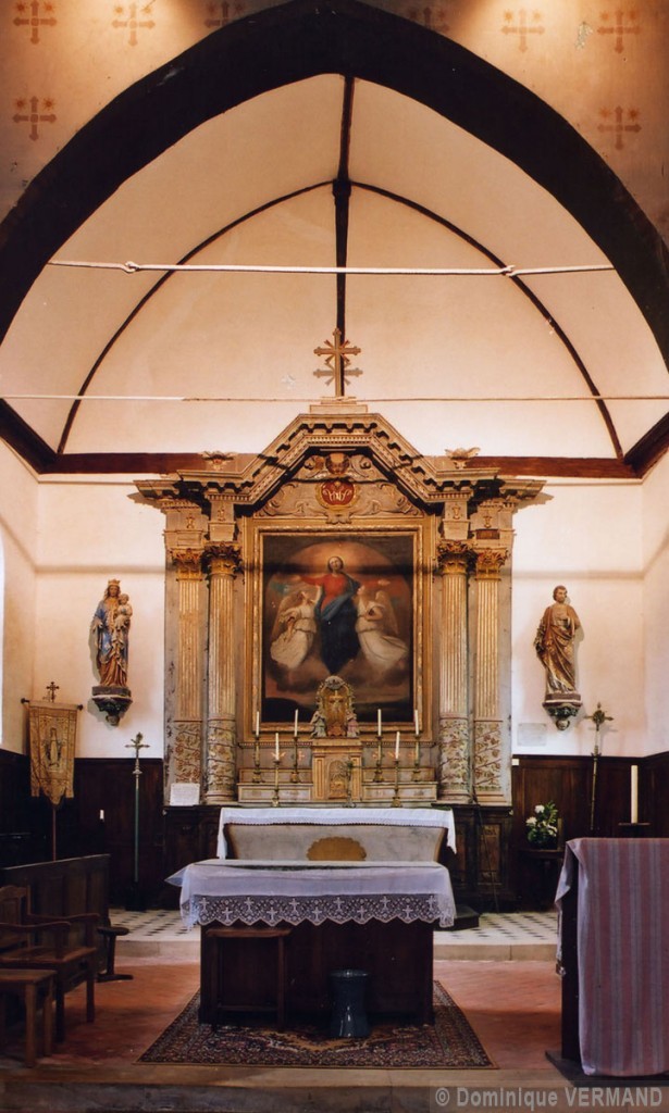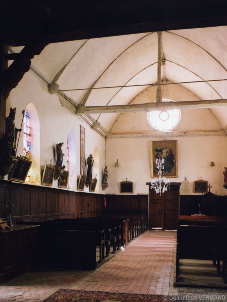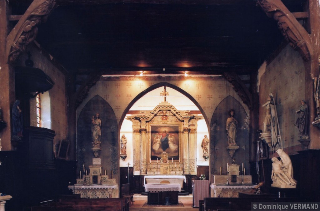 A l’intérieur, la nef est couverte par une charpente en carène renversée contemporaine de la construction. Un dispositif classique avec entrait et poinçon la soulage à mi-longueur. La première travée du choeur, qui reçoit le clocher, est renforcée par un mur percé d’une arcade en tiers-point. Ce dispositif est complété par une structure en bois remarquable par son décor sculpté. Les quatre jambettes qui la renforcent accueillent en effet, entre un dais de style flamboyant et une console sculptée d’un ange, la représentation des quatre évangélistes avec leurs attributs : au nord, saint Marc avec le lion et saint Mathieu avec l’ange ; au sud, saint Jean avec l’aigle et saint Luc avec le taureau. On détaillera également le très beau retable du maître-autel (18ème siècle) ainsi qu’une rare cuve baptismale en pierre de style renaissance, du milieu du 16ème siècle (2006).