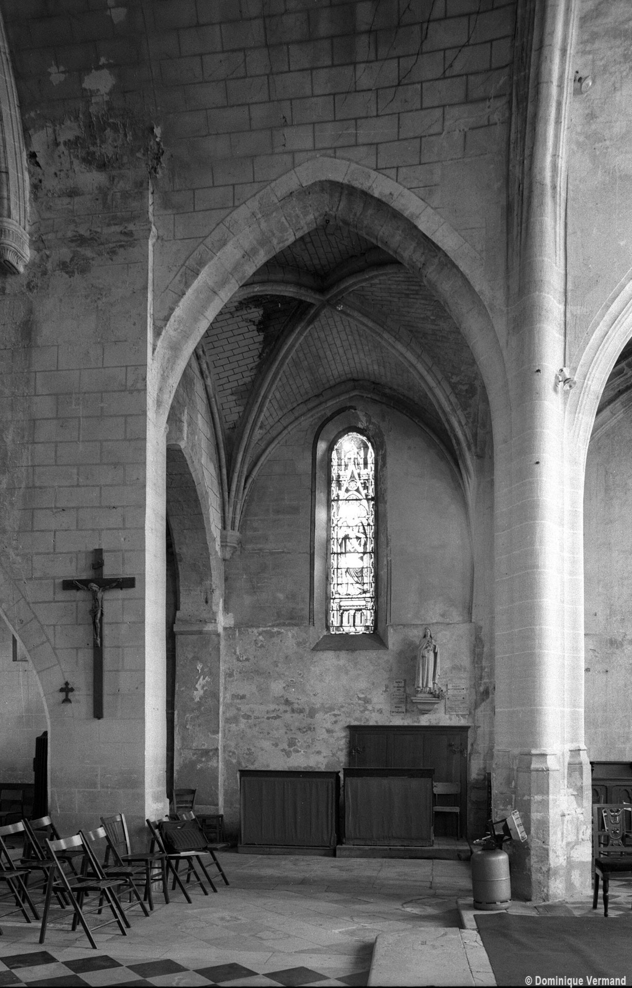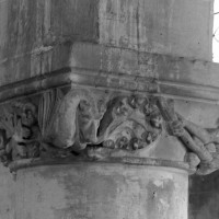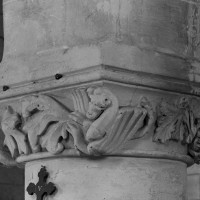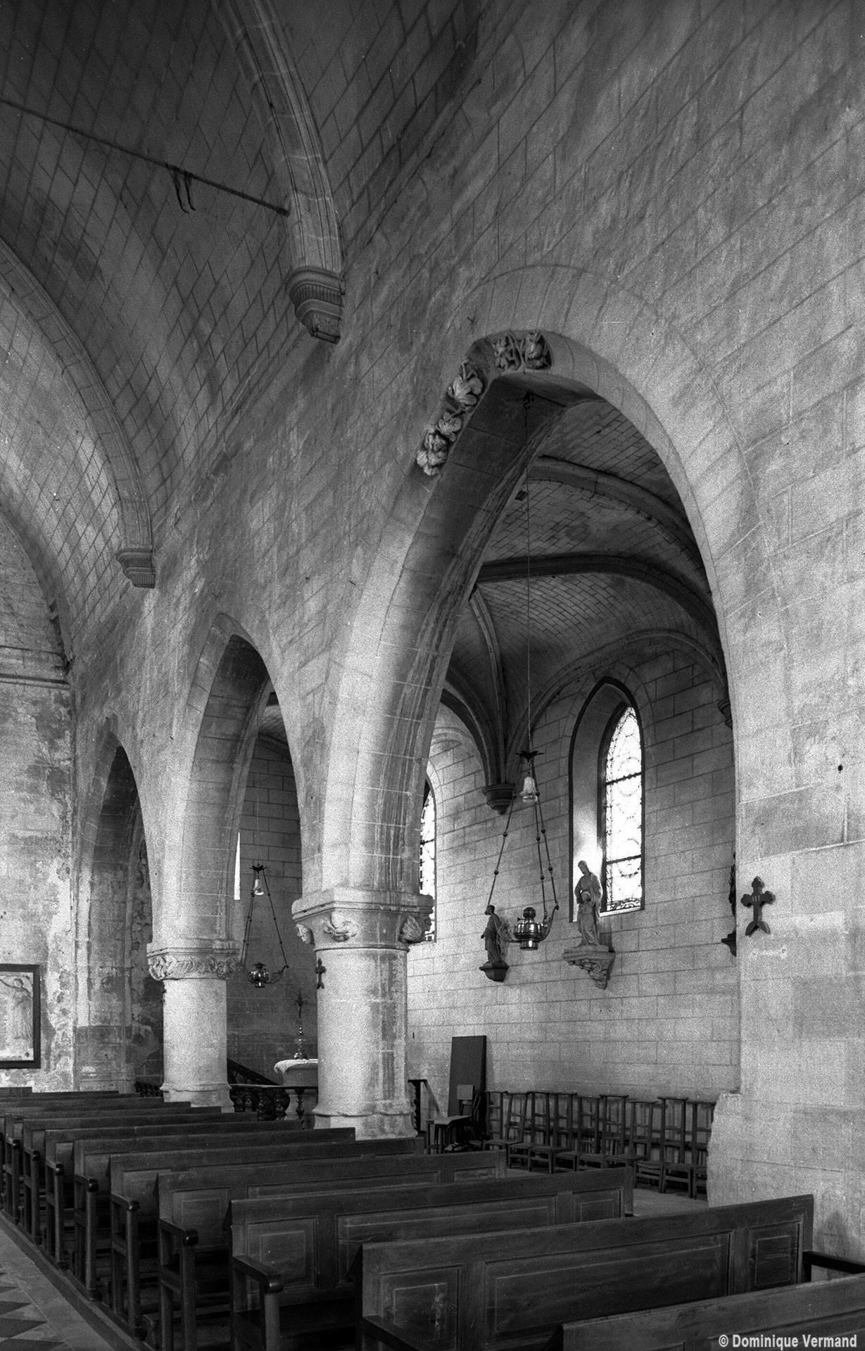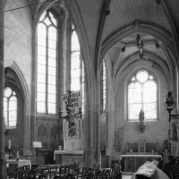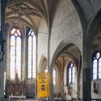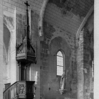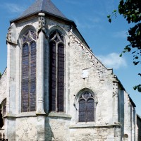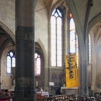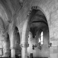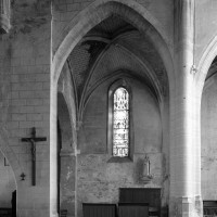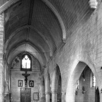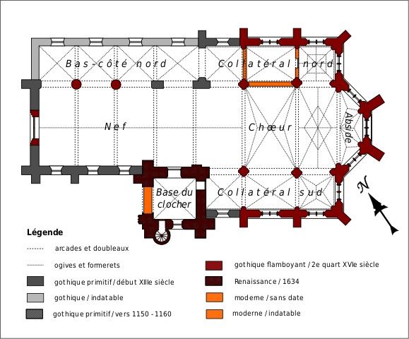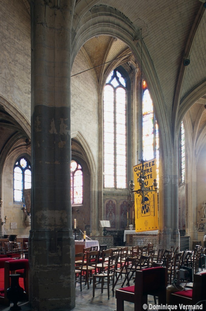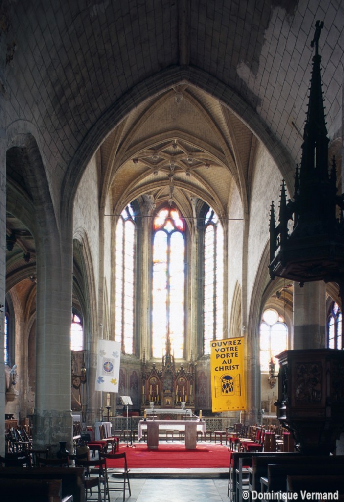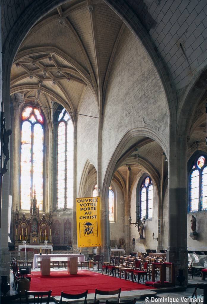 Très touchée durant la Guerre de Cent Ans, l’église sera presque totalement rebâtie au 16ème siècle. Outre le bas-côté construit au nord de la nef et communiquant avec celle-ci par des arcades dont les chapiteaux méritent d’être détaillés, c’est bien évidemment le choeur qui attire l’attention. Beaucoup plus élevé que la nef, il présente le plan classique de l’époque : un vaisseau central aveugle prolongé par une abside à trois pans et flanqué de bas-côtés terminés carrément. Les voûtes retombent par pénétration directe dans des piliers de plan ondulé, très minces, qui contribuent à ouvrir largement l’espace.