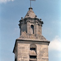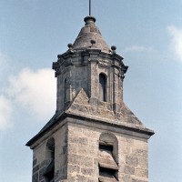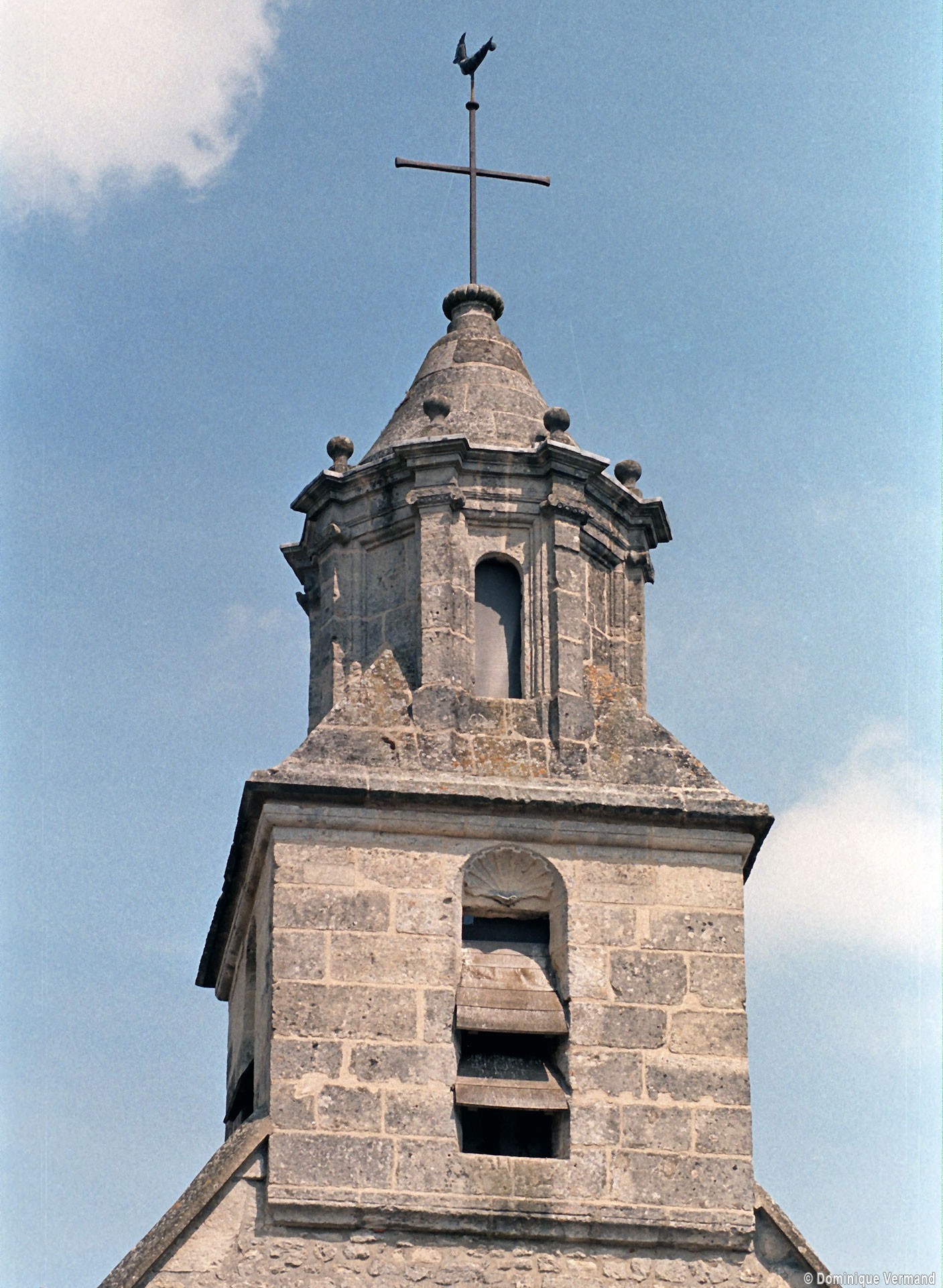 A l’extérieur, la partie la plus intéressante est sans conteste la façade, couronnée par un petit clocheton d’une extrême élégance et qui appartient pleinement au style de la Renaissance. Il n’est pas impossible qu’il ait été ajouté peu après l’achèvement de l’église. Le premier étage, carré, est simplement percé sur chaque face d’une petite baie en plein cintre décorée d’une coquille Saint-Jacques en partie supérieure. Le second étage est constitué d’un minuscule lanternon octogonal coiffé d’une pyramide circulaire. Les arêtes sont soulignées par des pilastres couronnés de chapiteaux ioniques.