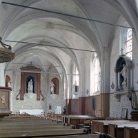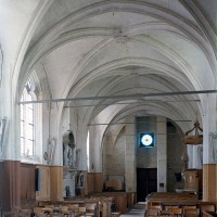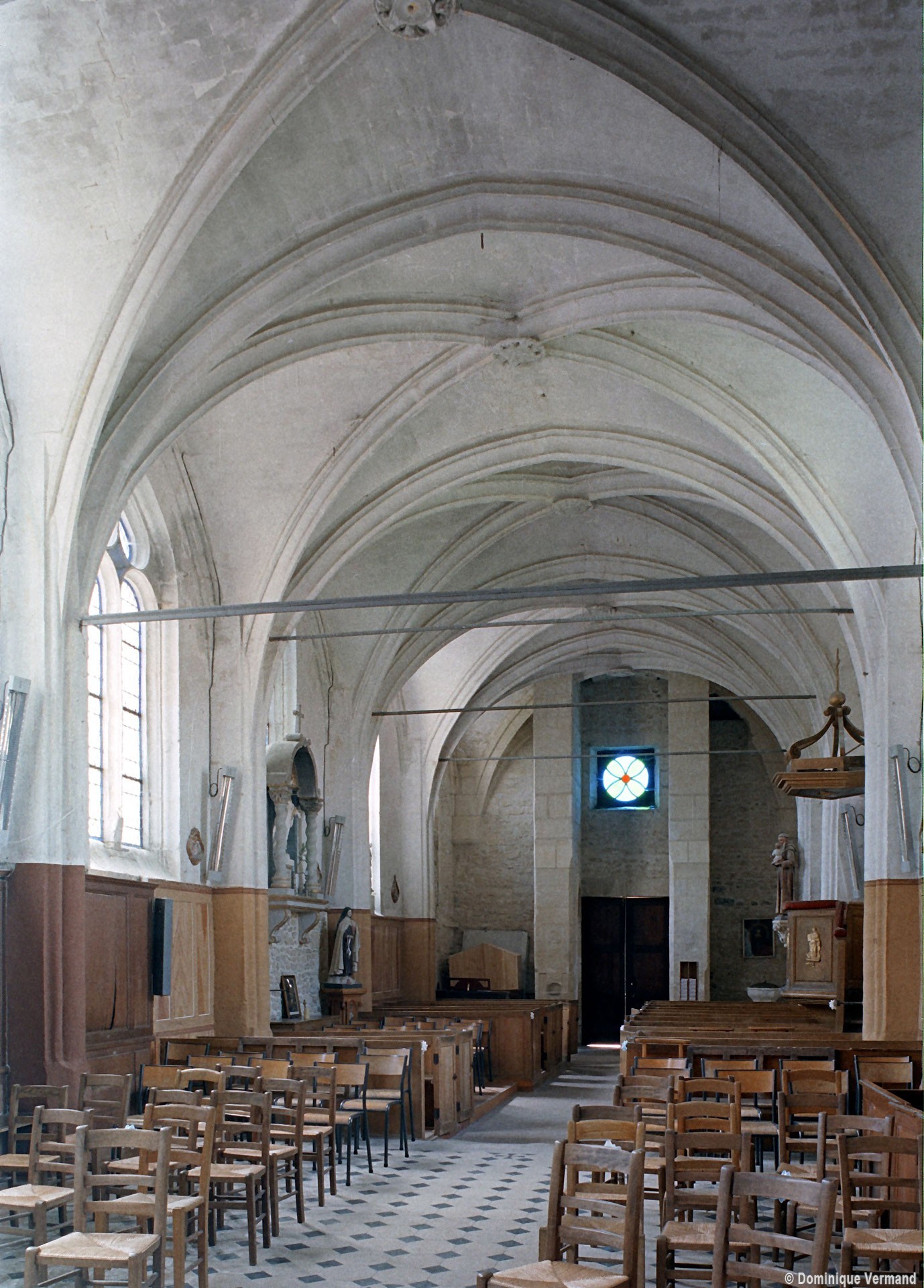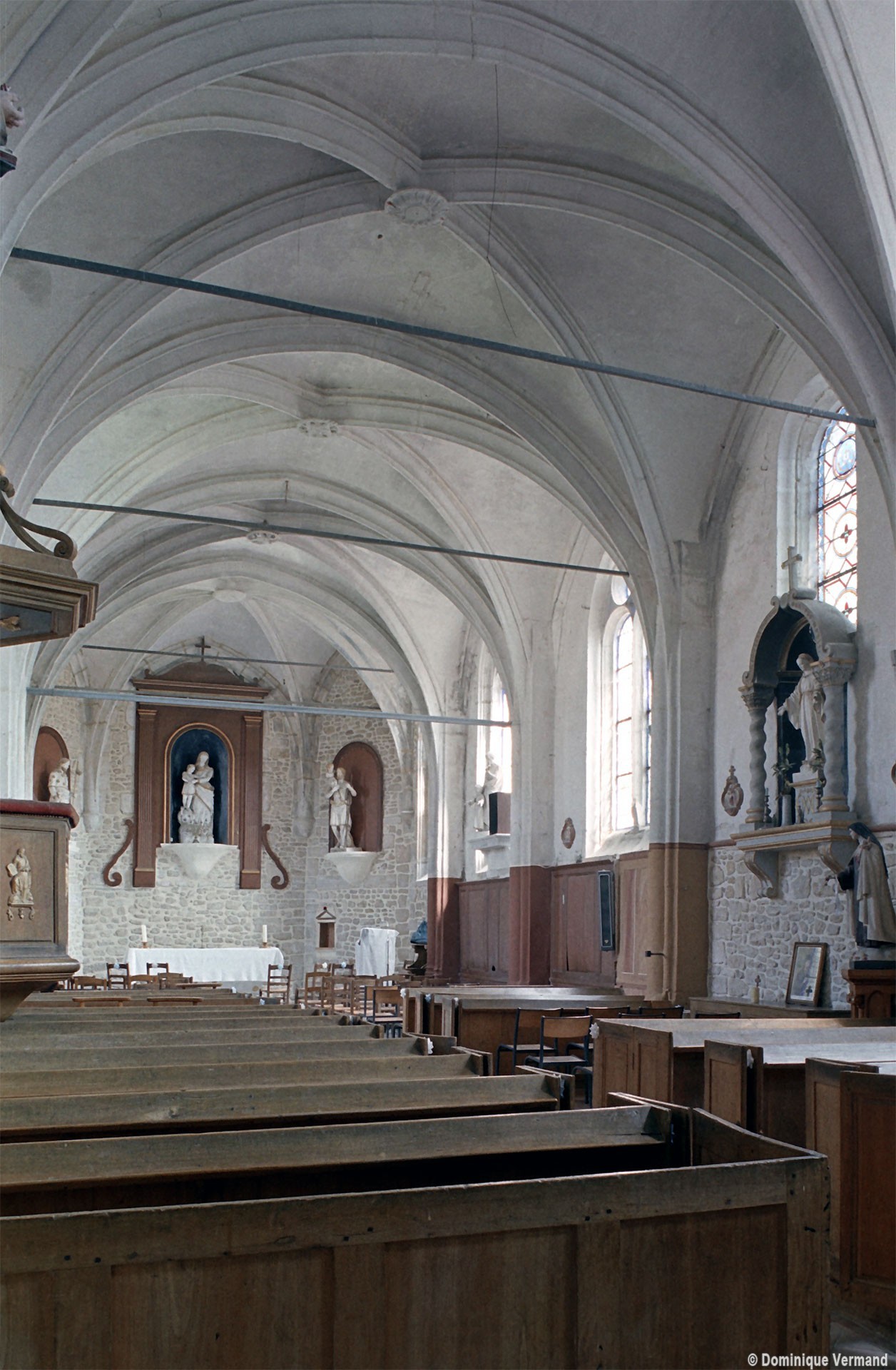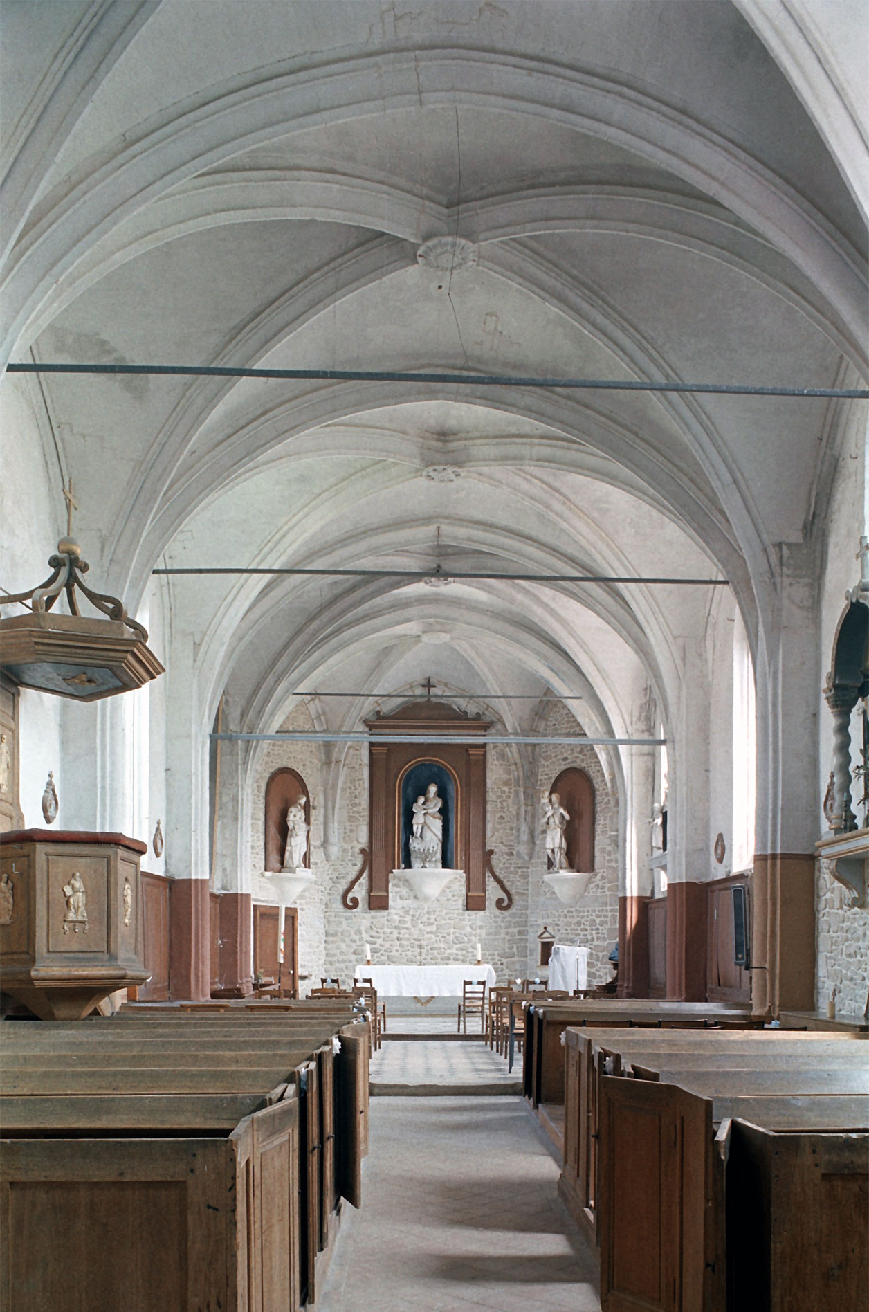 C’est un édifice homogène du 16ème siècle, très simple mais soigneusement construit, composé d’une nef unique de cinq travées que termine une abside pentagonale. Les voûtes, qui toutes comportent une petite clef ornée, sont formées d’ogives à profil prismatique retombant par pénétration directe sur des pilastres en forte saillie. Les fenêtres sont, soit de simples ouvertures en plein cintre, soit à remplage mélangeant les formes en plein cintre et flamboyantes. Les soufflets de deux d’entre elles ont gardé des éléments de vitraux du 16ème siècle dont la qualité fait regretter la disparition de l’essentiel des verrières.