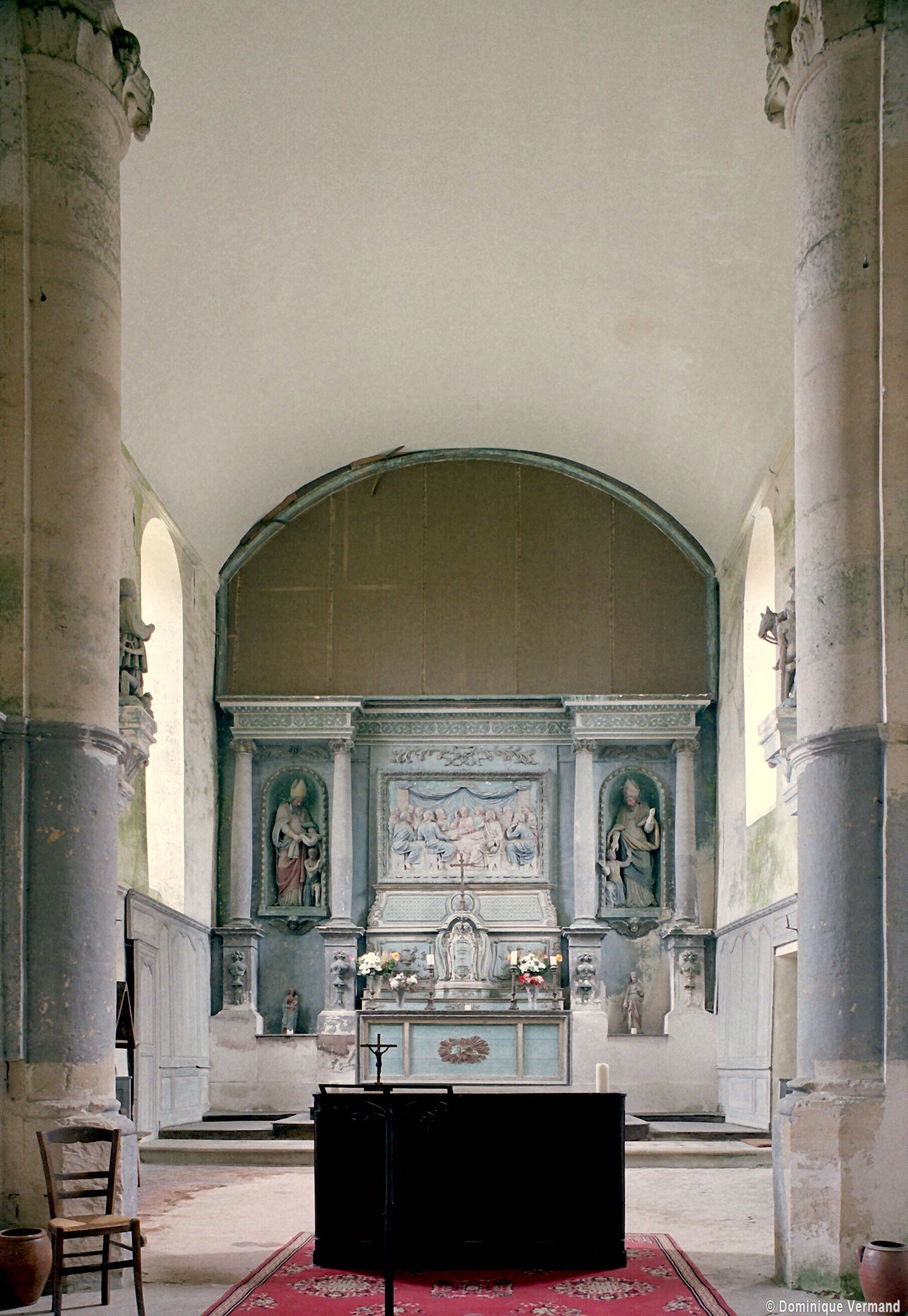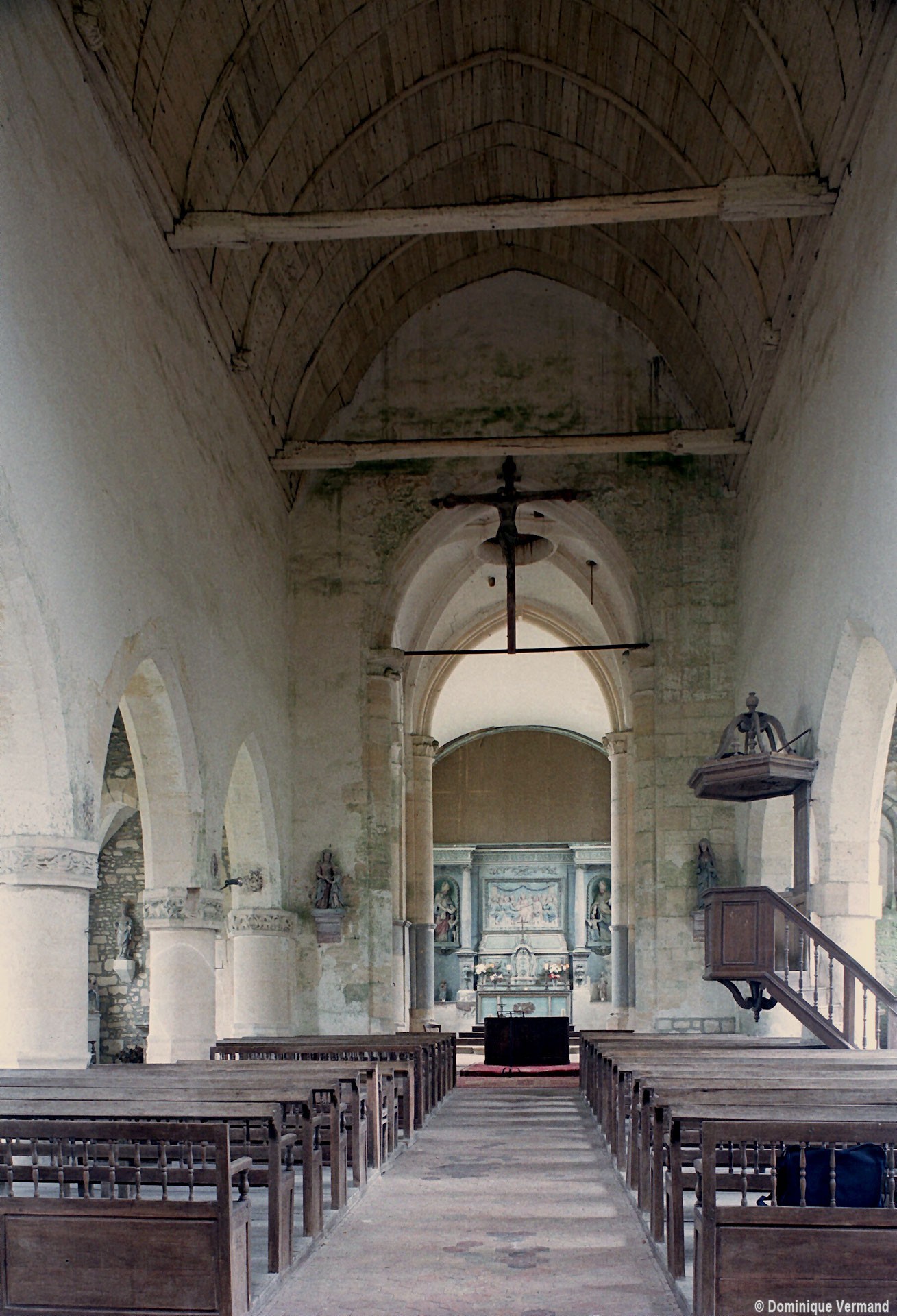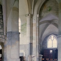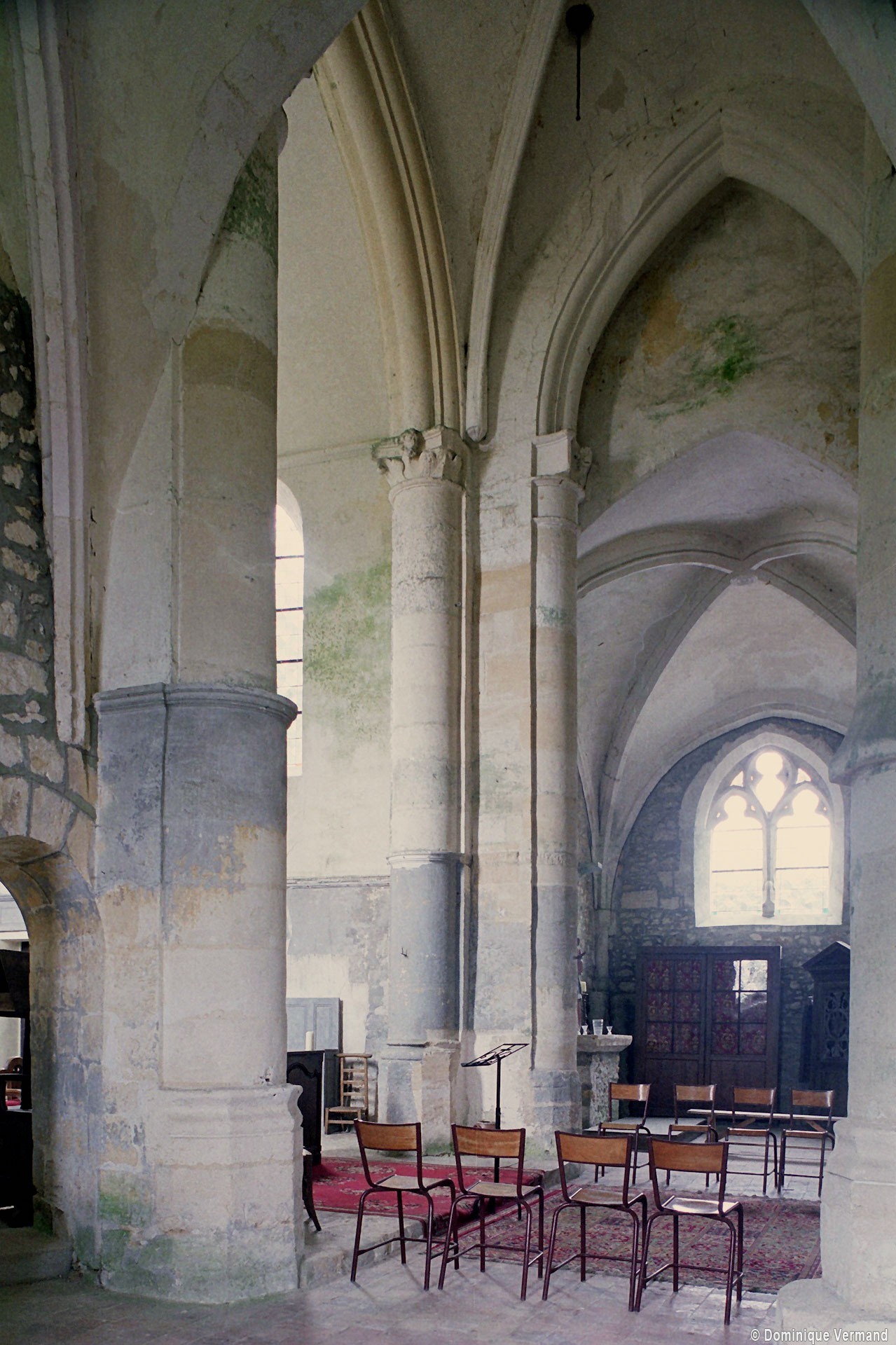 Mais la partie la plus ancienne identifiable avec certitude est le chœur. Long de deux travées, il est percé de lancettes au tracé aigu (regroupées en triplet au chevet) que souligne une moulure de billettes. A l’intérieur, les voûtes ont disparu mais des chapiteaux à crochets, modifiés par la suite, permettent d’en faire remonter l’édification vers 1200.