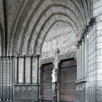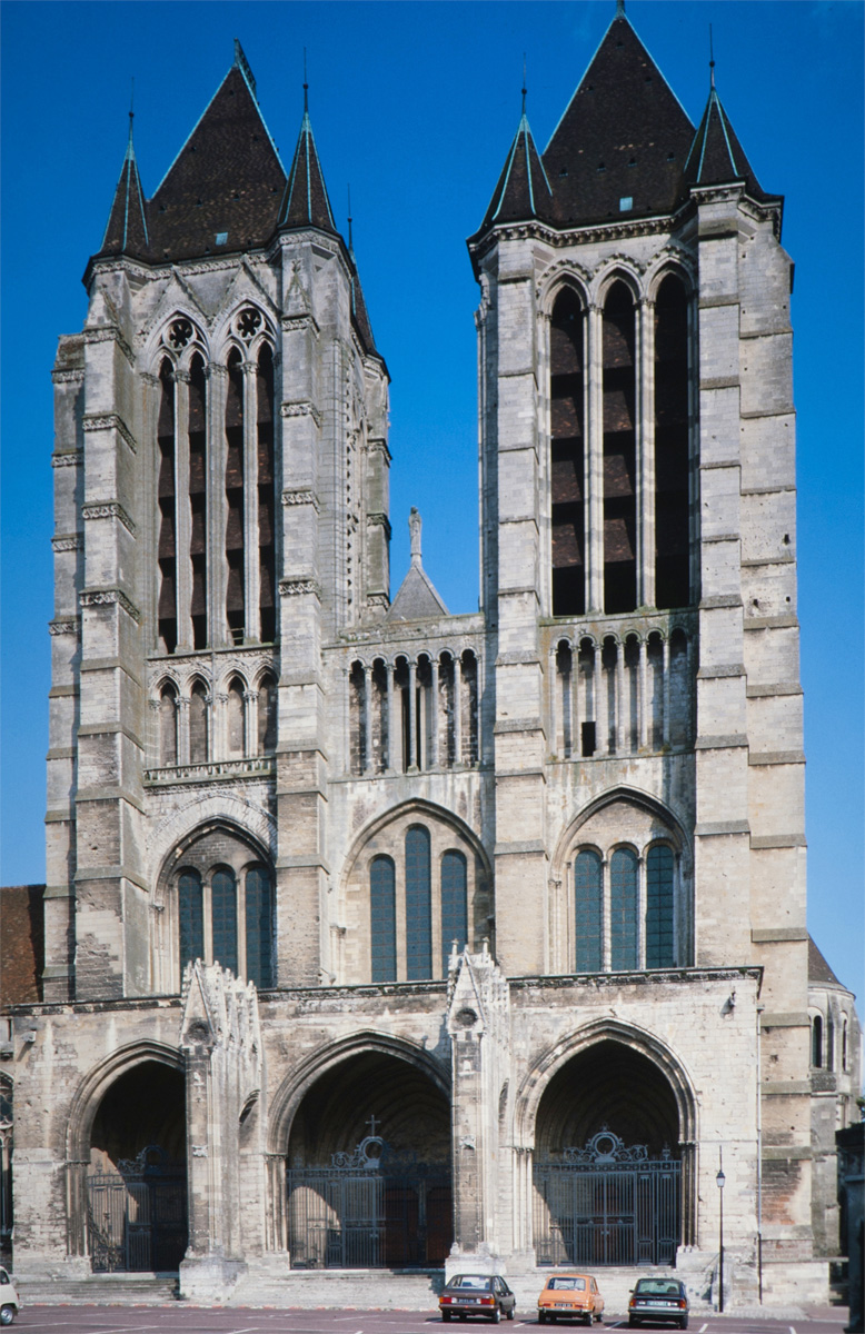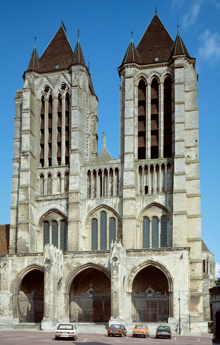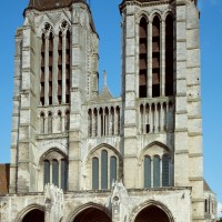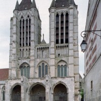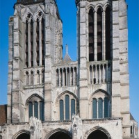 Classique, dans sa conception à deux tours d’égale importance, la façade de la cathédrale – réalisée entre 1200 et 1235 environ – est, en revanche, originale dans ses dispositions intérieures. Totalement évidée jusqu’au niveau de la voûte du vaisseau central de la nef, elle se présente, en effet, comme un second transept. A l’étage des tribunes de la nef, un triforium passage fait le tour de ce massif occidental (à l’ouest, il débouche sur la terrasse du porche qui abrite les portails) et permet une communication continue entre les diverses parties de l’édifice.