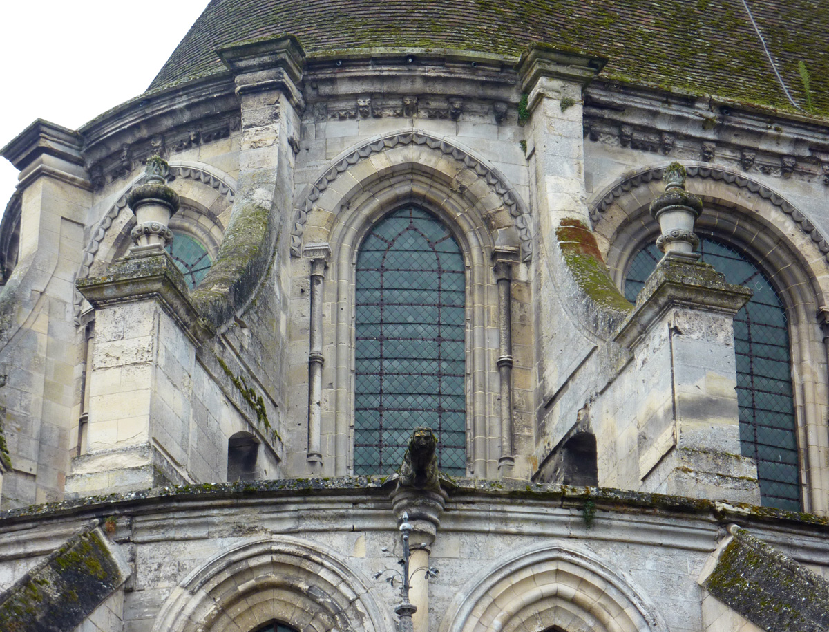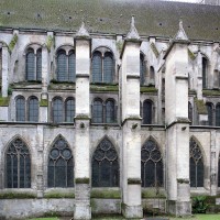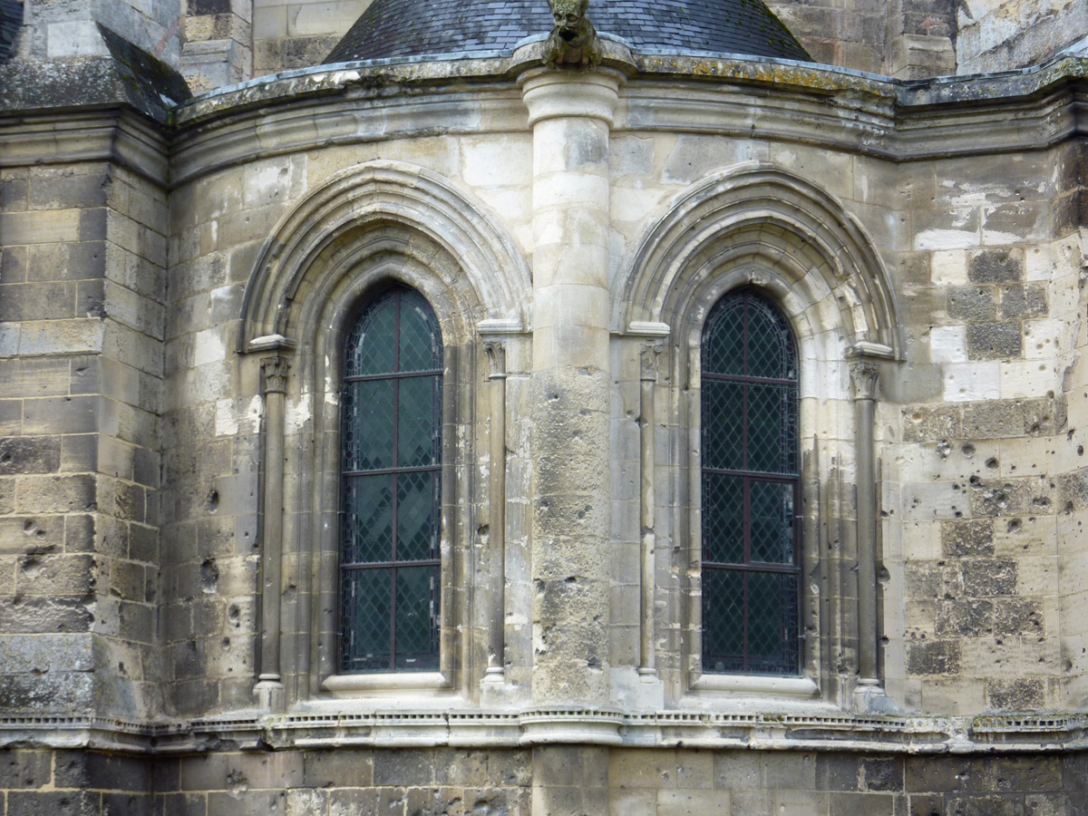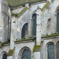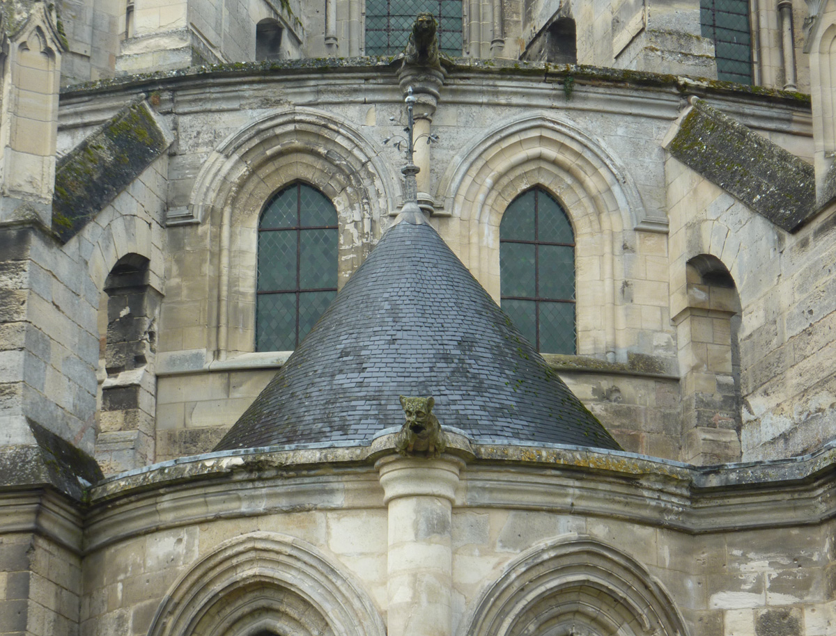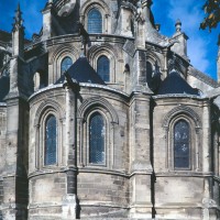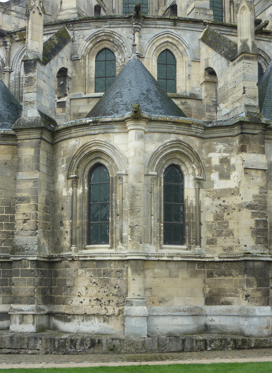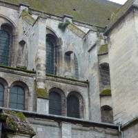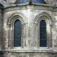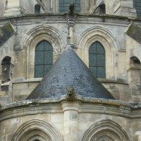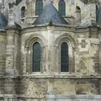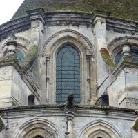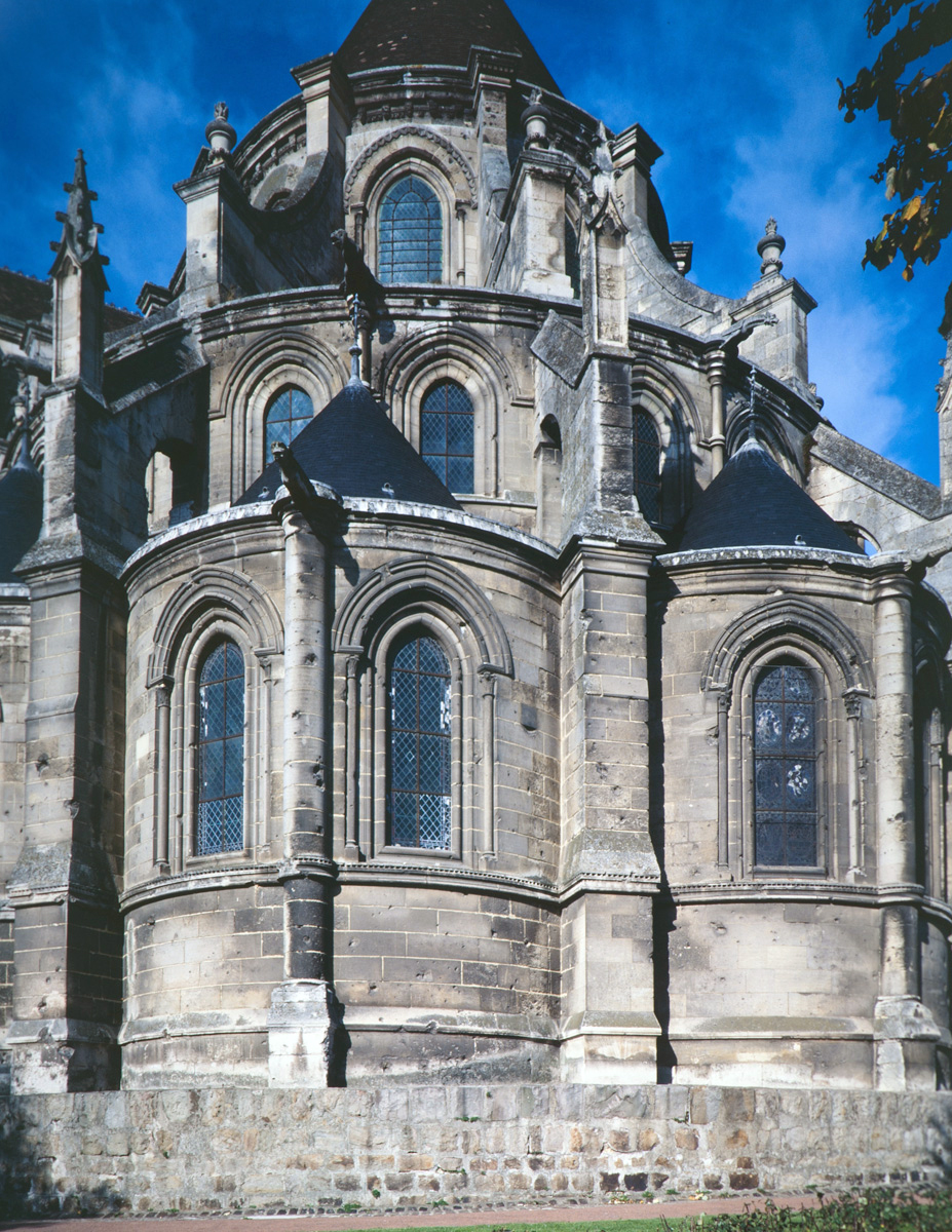 Tout le vaisseau central du choeur se caractérise ainsi par son extrême richesse décorative, par sa plastique généreuse qui font écho, là encore, à l’architecture anglo-normande comme à celle du Laonnois et du Soissonnais. Tout aussi riche dans sa décoration, le chevet est remarquable par l’équilibre de sa composition et l’étagement de ses volumes, altérés, cependant, par les modifications et les réfections dont il fut très souvent l’objet. La disparition de la toiture unique des chapelles – son appui se voit encore à la base des fenêtres des tribunes – au profit de toitures individualisées ; la réfection des arcs-boutants des tribunes au 15ème siècle et mise en place, au 18ème siècle, de nouveaux arcs-boutants dans les parties hautes ne permettent plus de définir avec certitude le système de contrebutement mis en place à l’origine.