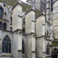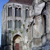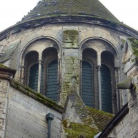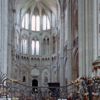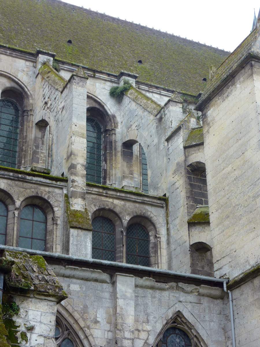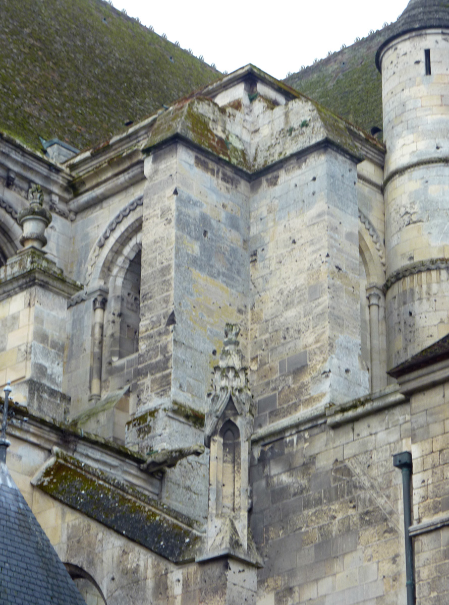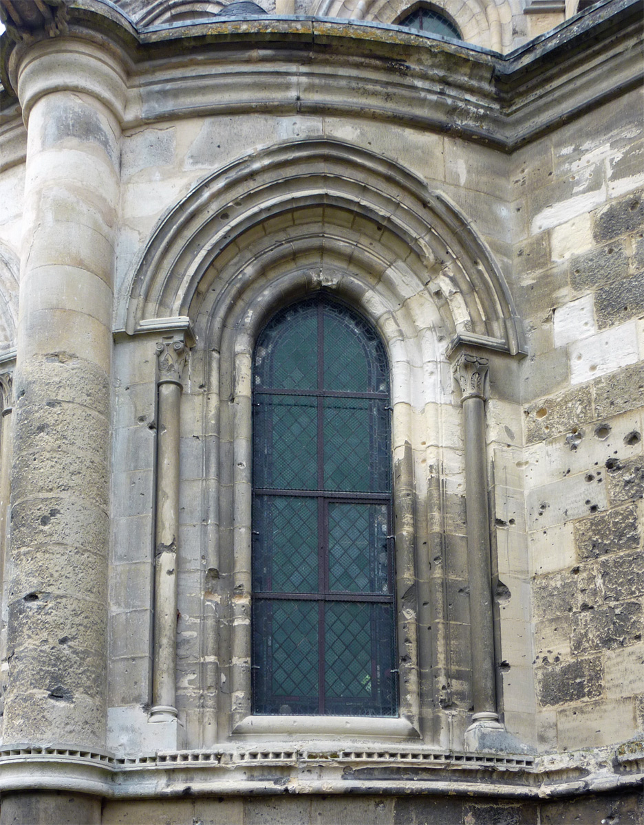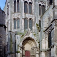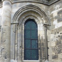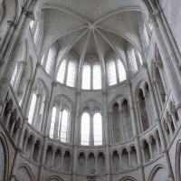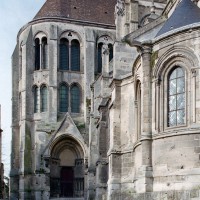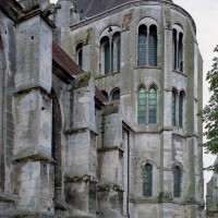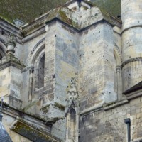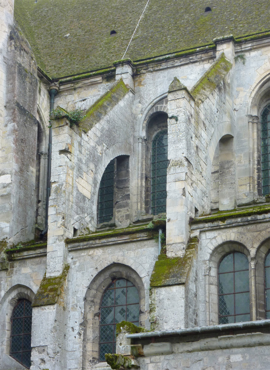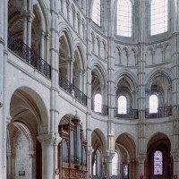 Tout le vaisseau central du choeur se caractérise ainsi par son extrême richesse décorative, par sa plastique généreuse qui font écho, là encore, à l’architecture anglo-normande comme à celle du Laonnois et du Soissonnais. Tout aussi riche dans sa décoration, le chevet est remarquable par l’équilibre de sa composition et l’étagement de ses volumes, altérés, cependant, par les modifications et les réfections dont il fut très souvent l’objet. La disparition de la toiture unique des chapelles – son appui se voit encore à la base des fenêtres des tribunes – au profit de toitures individualisées ; la réfection des arcs-boutants des tribunes au 15ème siècle et mise en place, au 18ème siècle, de nouveaux arcs-boutants dans les parties hautes ne permettent plus de définir avec certitude le système de contrebutement mis en place à l’origine.