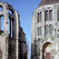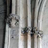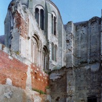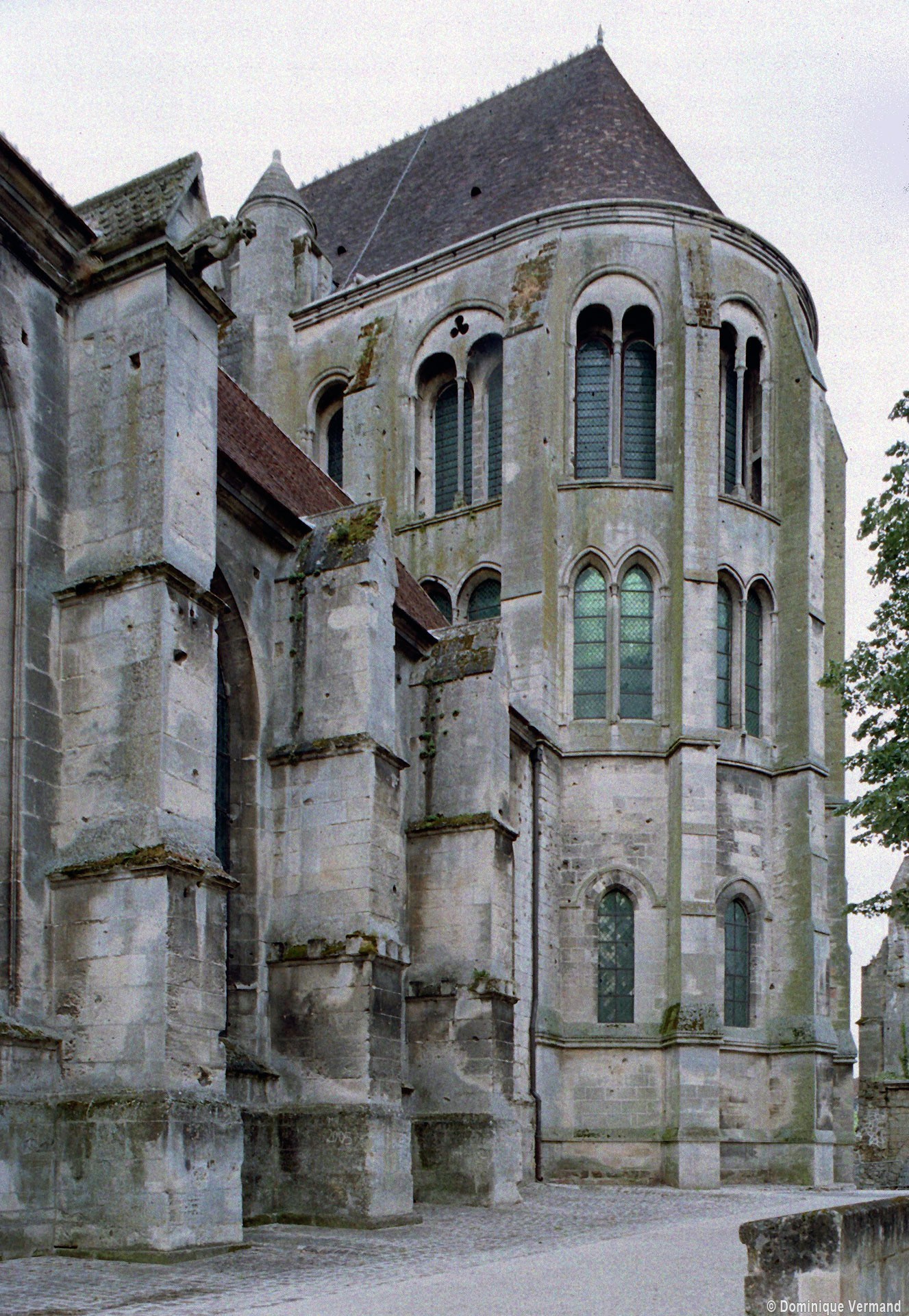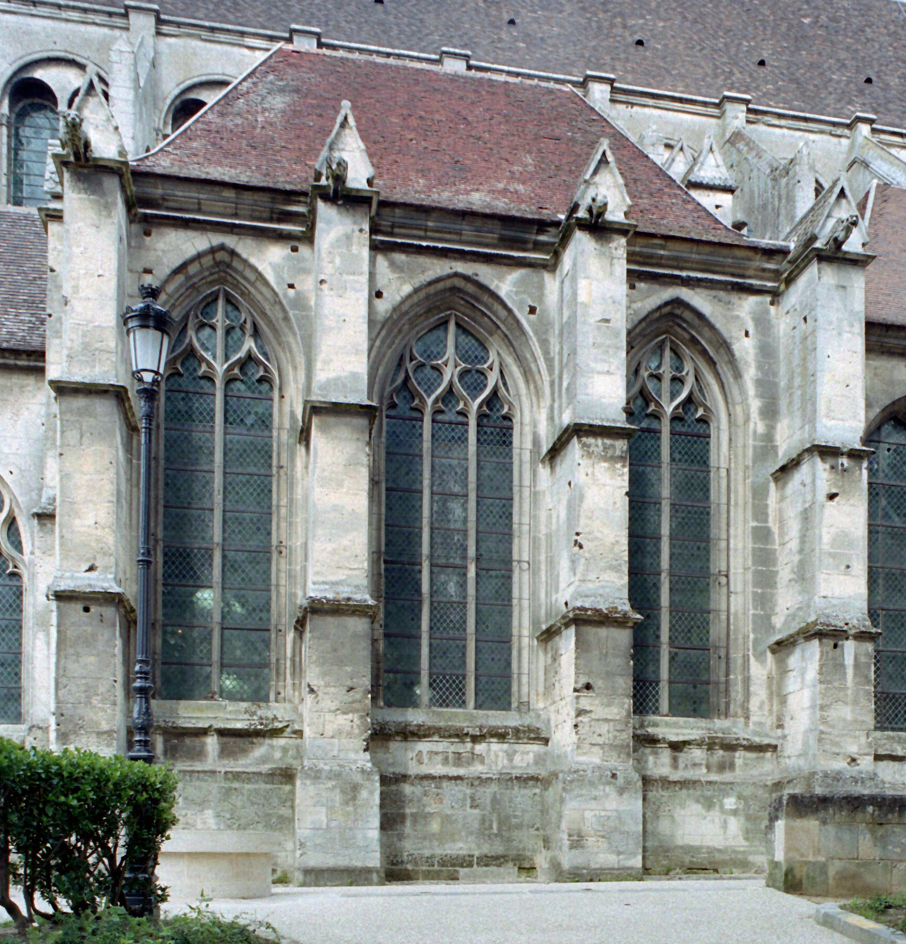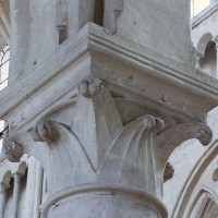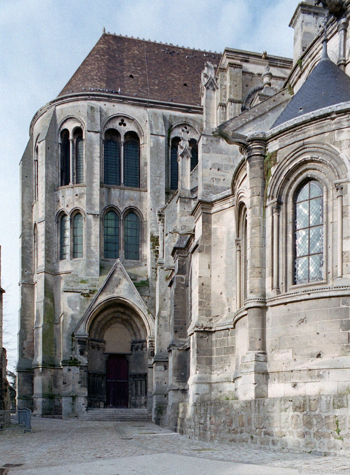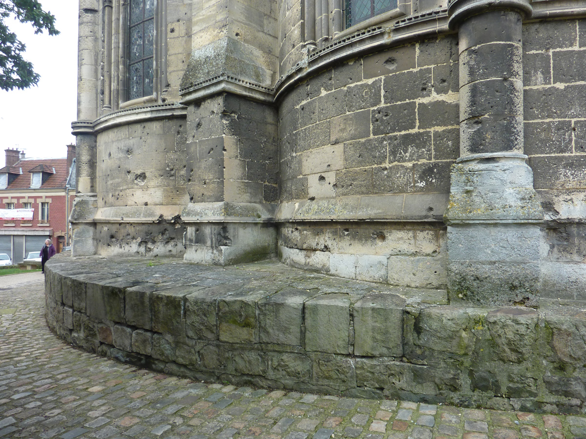 Tout le vaisseau central du choeur se caractérise ainsi par son extrême richesse décorative, par sa plastique généreuse qui font écho, là encore, à l’architecture anglo-normande comme à celle du Laonnois et du Soissonnais. Tout aussi riche dans sa décoration, le chevet est remarquable par l’équilibre de sa composition et l’étagement de ses volumes, altérés, cependant, par les modifications et les réfections dont il fut très souvent l’objet. La disparition de la toiture unique des chapelles – son appui se voit encore à la base des fenêtres des tribunes – au profit de toitures individualisées ; la réfection des arcs-boutants des tribunes au 15ème siècle et mise en place, au 18ème siècle, de nouveaux arcs-boutants dans les parties hautes ne permettent plus de définir avec certitude le système de contrebutement mis en place à l’origine.