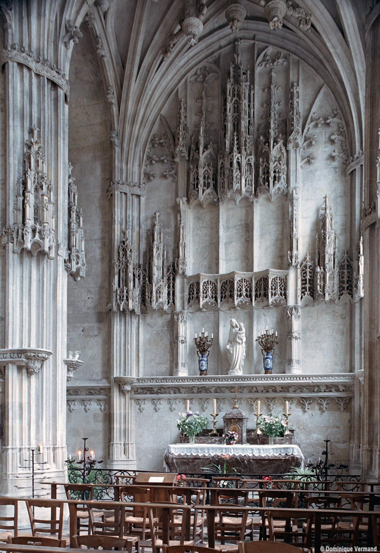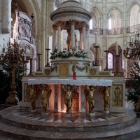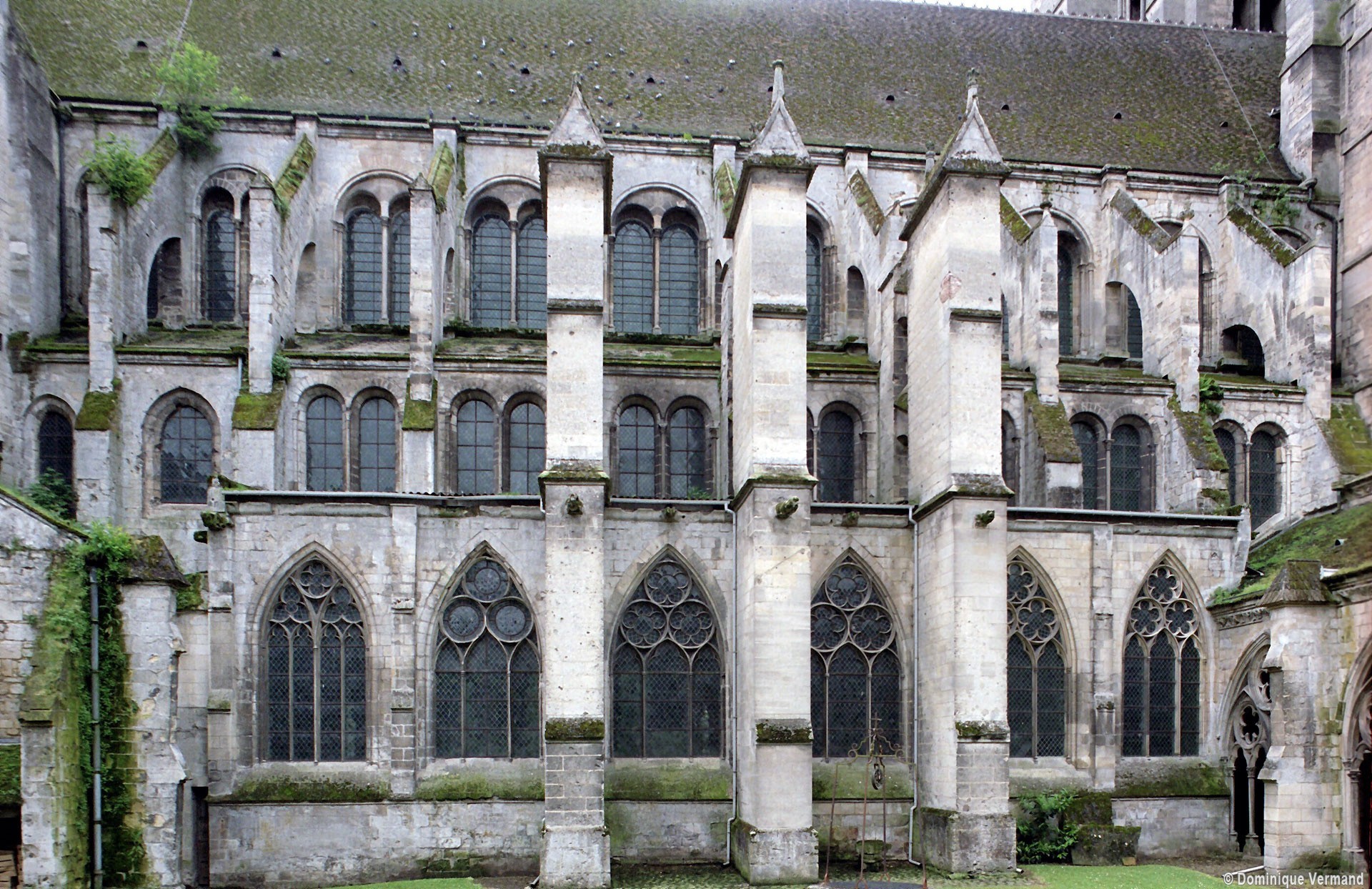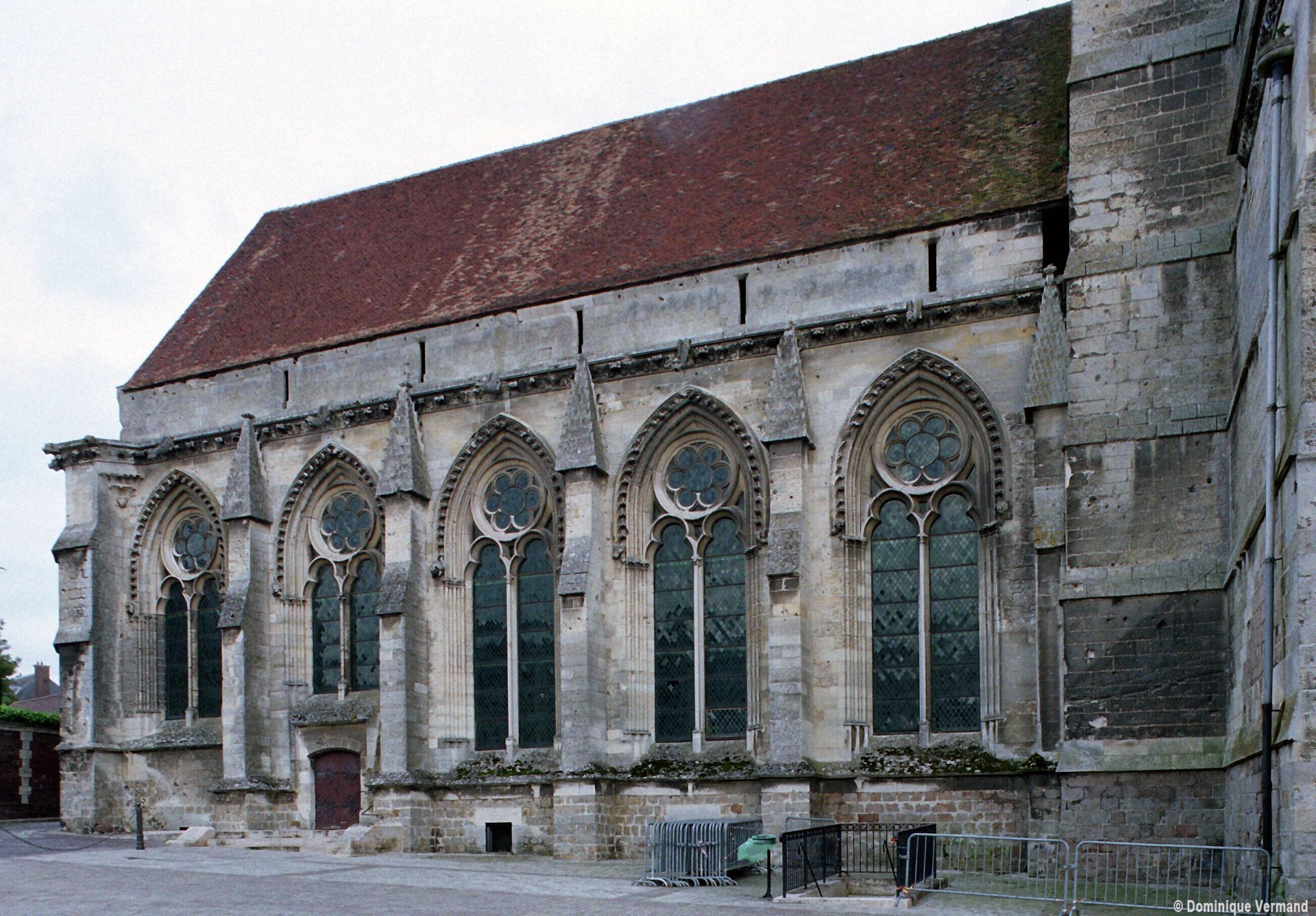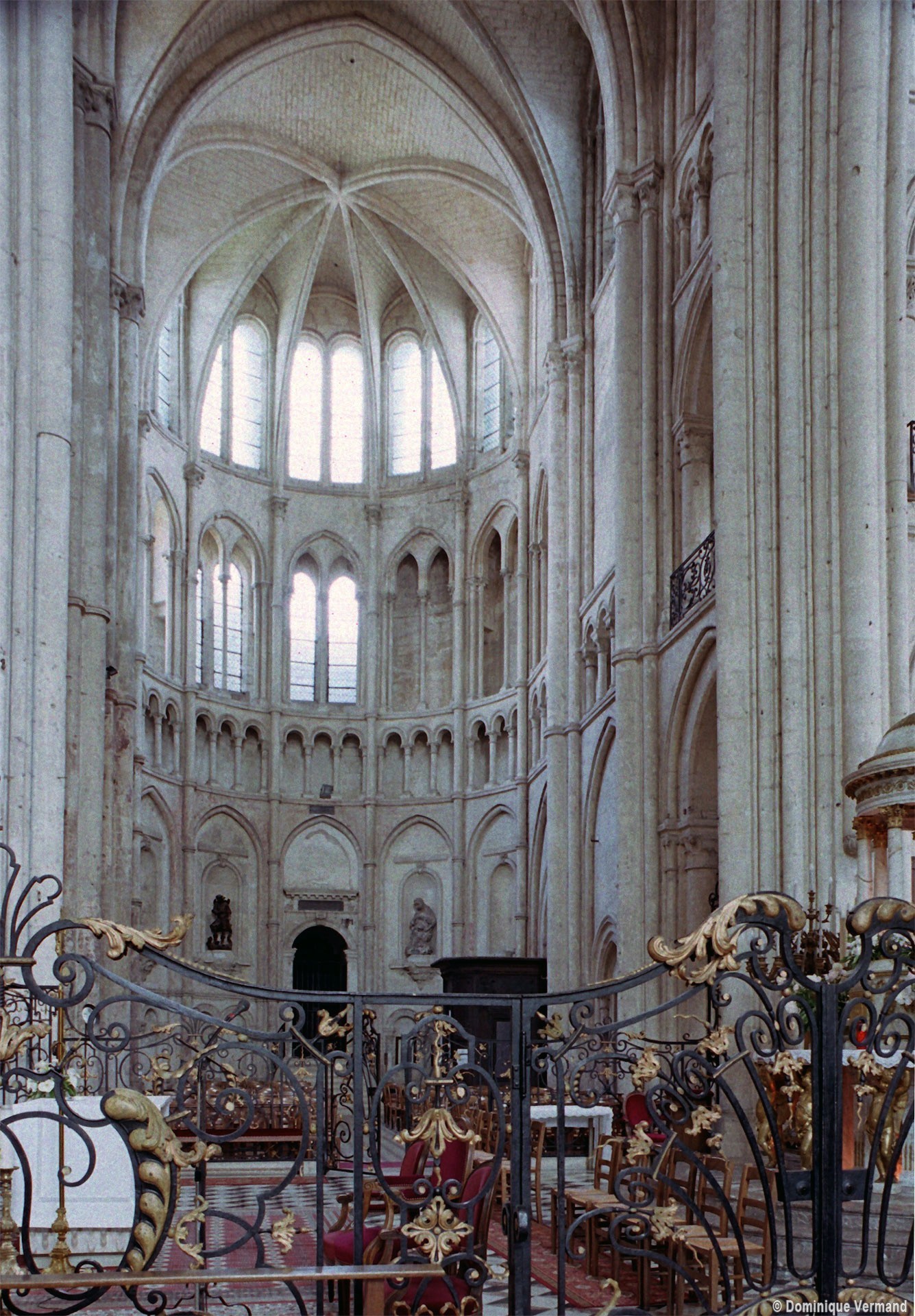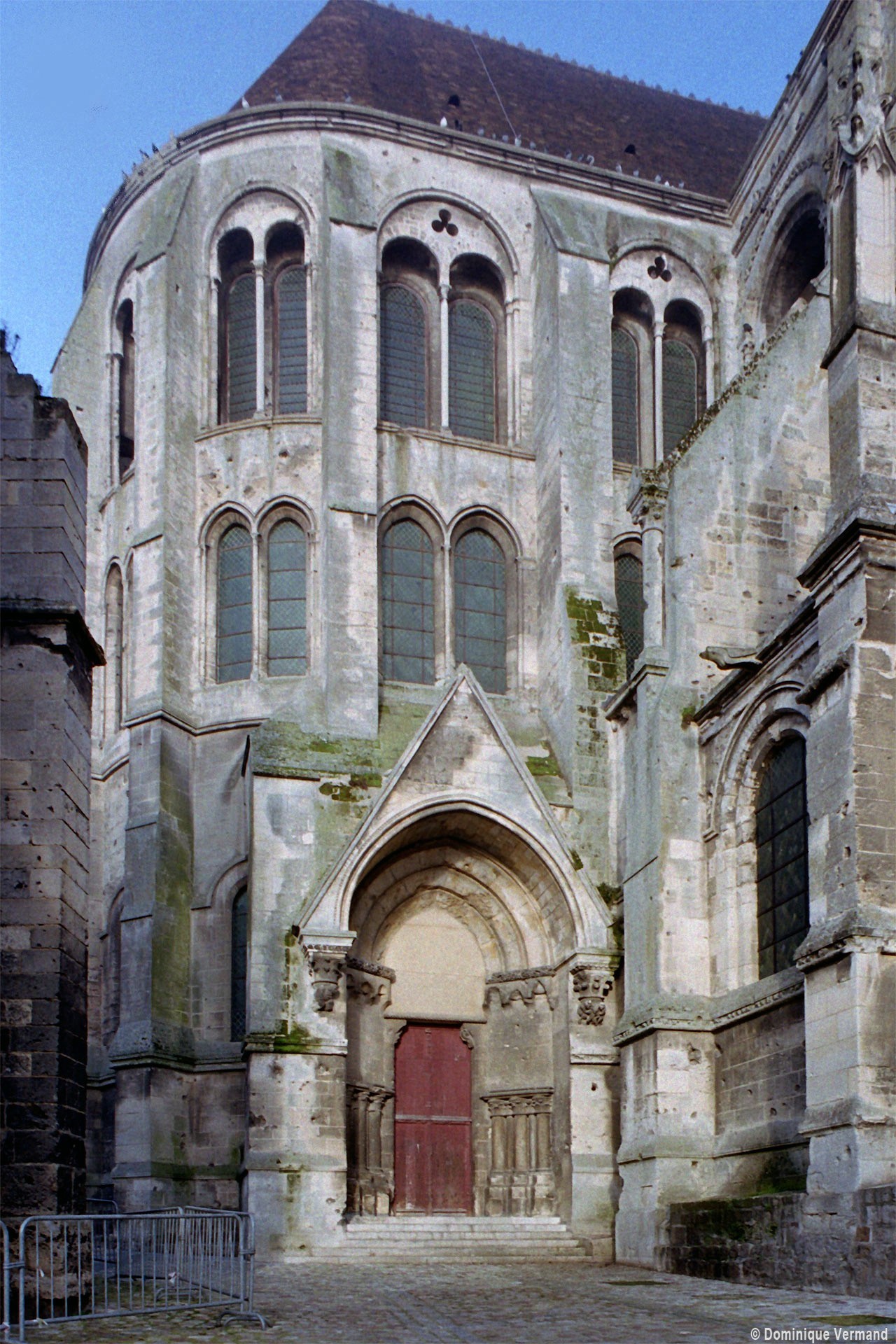 Tout le vaisseau central du choeur se caractérise ainsi par son extrême richesse décorative, par sa plastique généreuse qui font écho, là encore, à l’architecture anglo-normande comme à celle du Laonnois et du Soissonnais. Tout aussi riche dans sa décoration, le chevet est remarquable par l’équilibre de sa composition et l’étagement de ses volumes, altérés, cependant, par les modifications et les réfections dont il fut très souvent l’objet. La disparition de la toiture unique des chapelles – son appui se voit encore à la base des fenêtres des tribunes – au profit de toitures individualisées ; la réfection des arcs-boutants des tribunes au 15ème siècle et mise en place, au 18ème siècle, de nouveaux arcs-boutants dans les parties hautes ne permettent plus de définir avec certitude le système de contrebutement mis en place à l’origine.