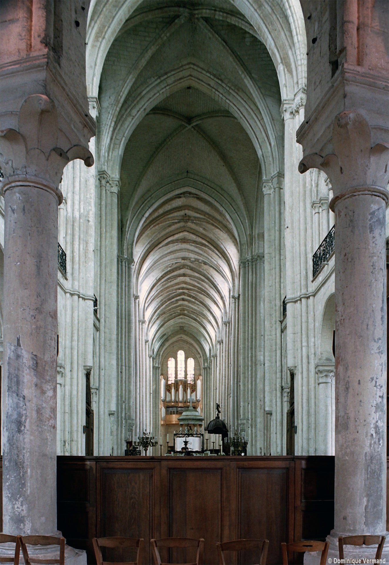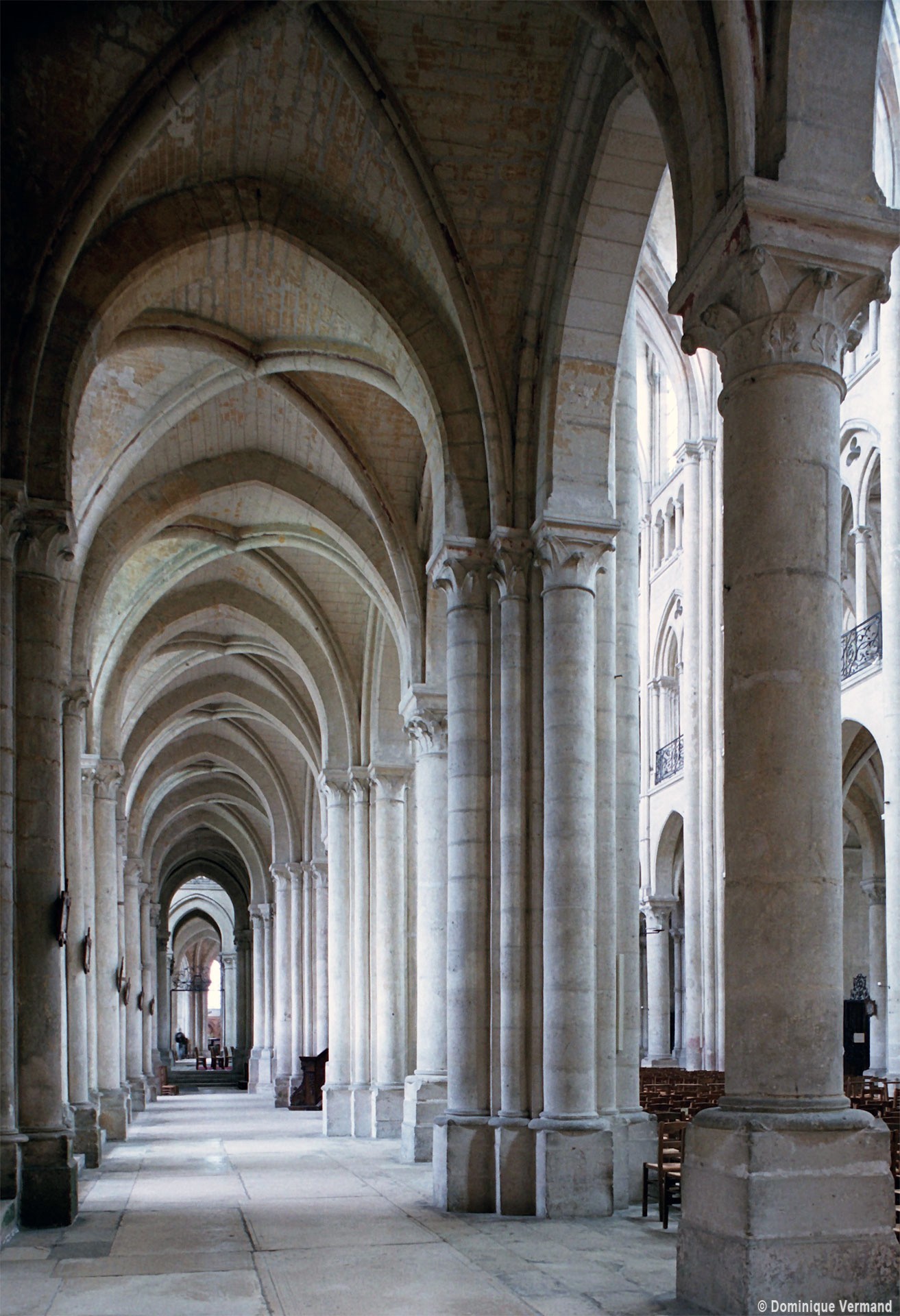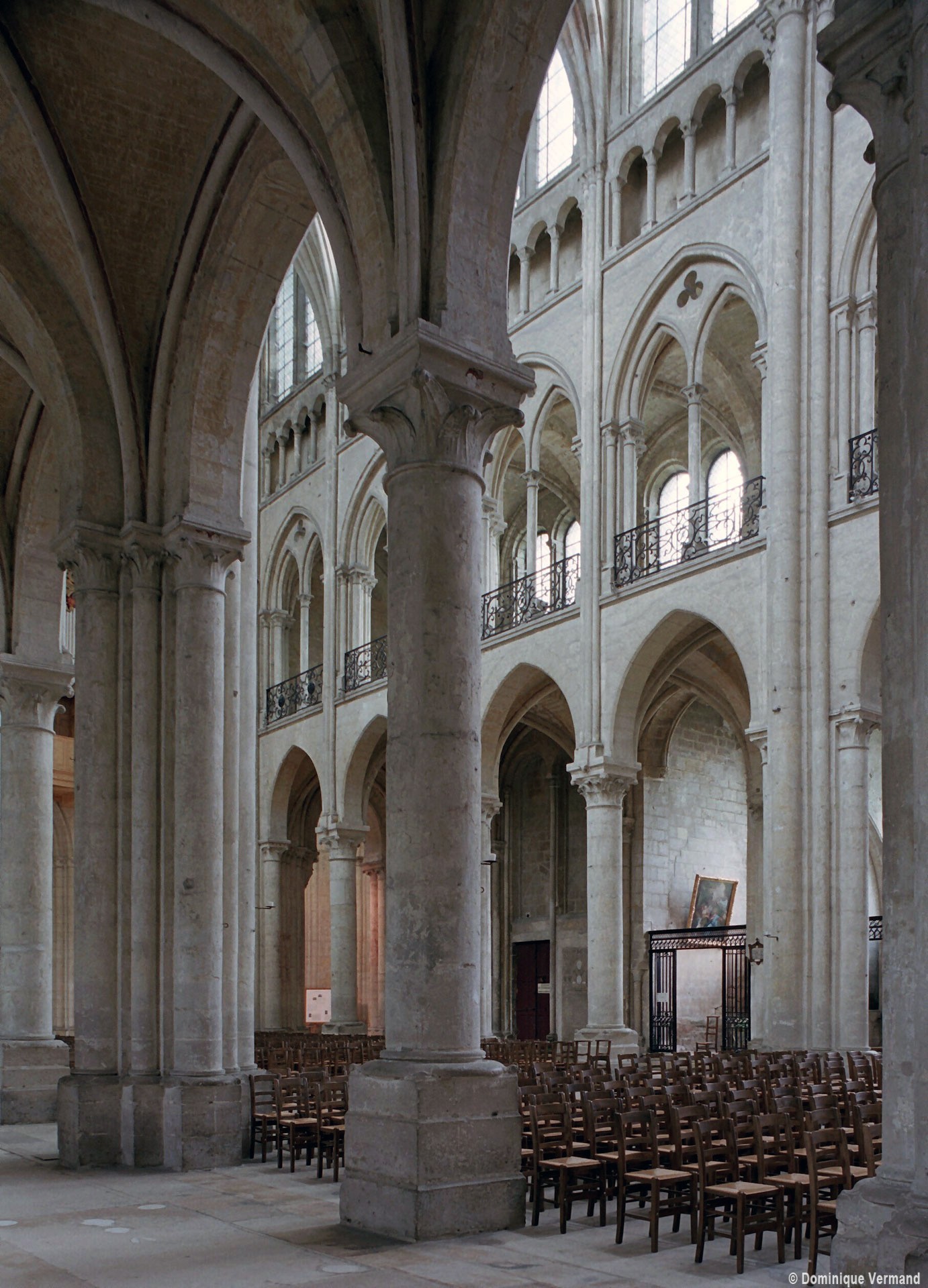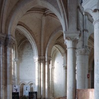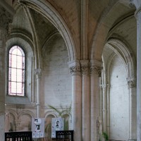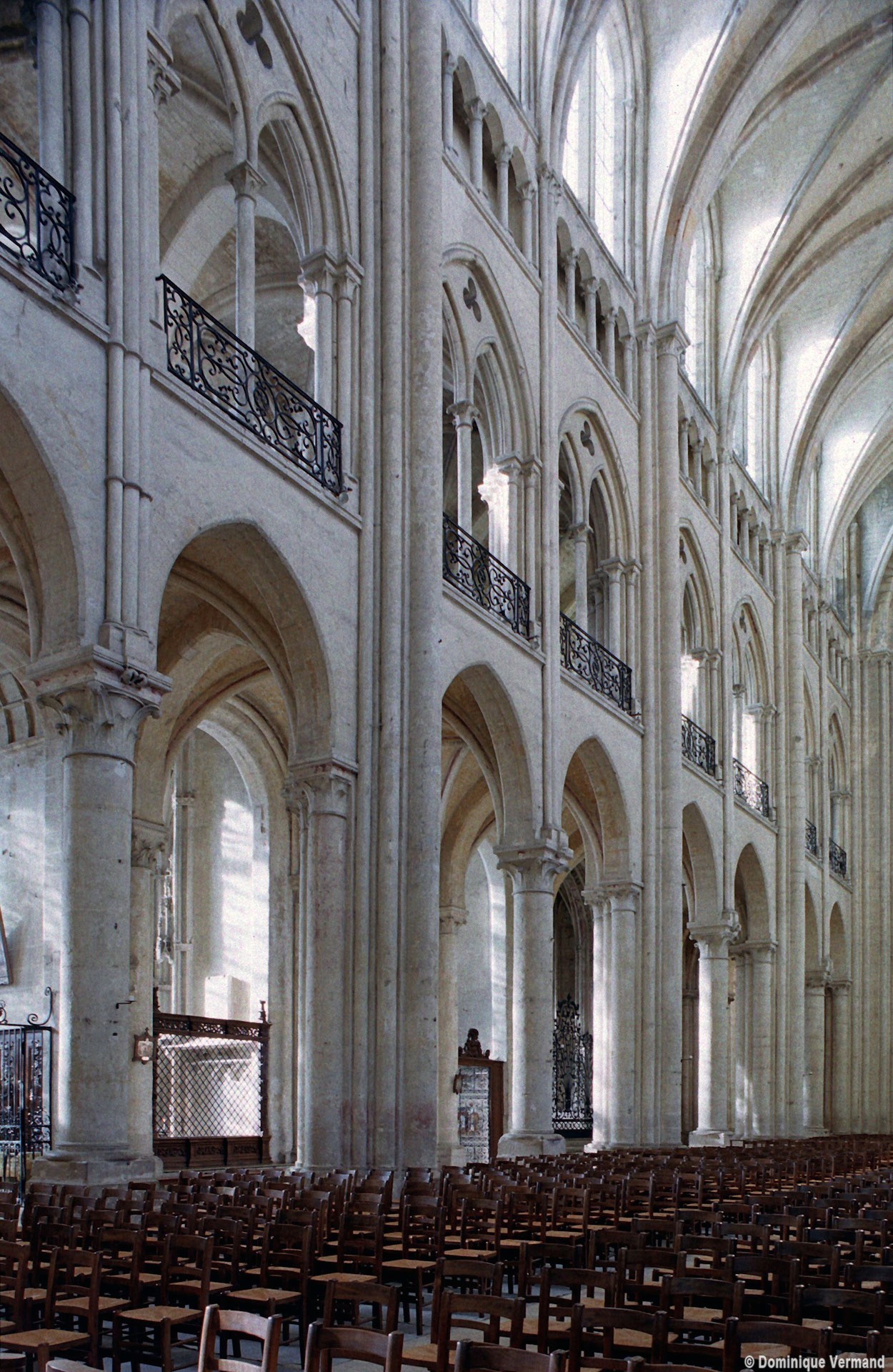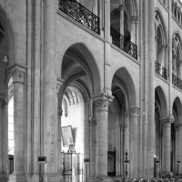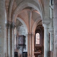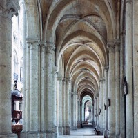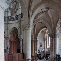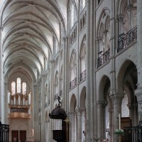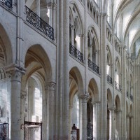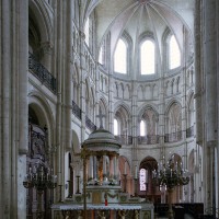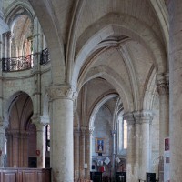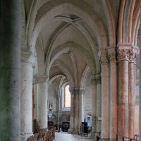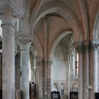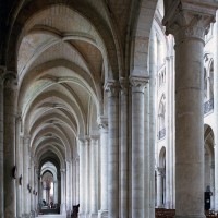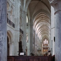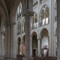 Objet d’une seconde campagne de construction terminée vers 1165, le vaisseau central se caractérise par son élévation à quatre étages, la plus ancienne de ce type dans l’architecture gothique après Saint-Germer-de-Fly. Se succèdent ainsi l’étage des grandes arcades, celui des tribunes, un niveau d’arcatures aveugles correspondant aux combles des tribunes et l’étage des fenêtres hautes. Les arcades du rez-de-chaussée sont traitées avec une grande simplicité et retombent sur de minces piles circulaires (les quatre supports de la travée droite ont été repris au 15ème siècle). Les baies des tribunes – doubles dans les travées droites, où elles retombent au centre sur un faisceau de minces colonnes, et simples dans la partie tournante – sont, au contraire, soulignées par une mouluration d’une grande richesse. Au-dessus, les arcatures aveugles trilobées, au nombre de trois à cinq selon les travées, annoncent le triforium passage de la génération suivante, tel qu’il sera utilisé au transept et à la nef. Le dernier étage, enfin, est percé d’une série de fenêtres dont les piédroits sont soulignés par de minces colonnettes. Les voûtes retombent sur des faisceaux de trois colonnettes baguées à intervalles réguliers.
