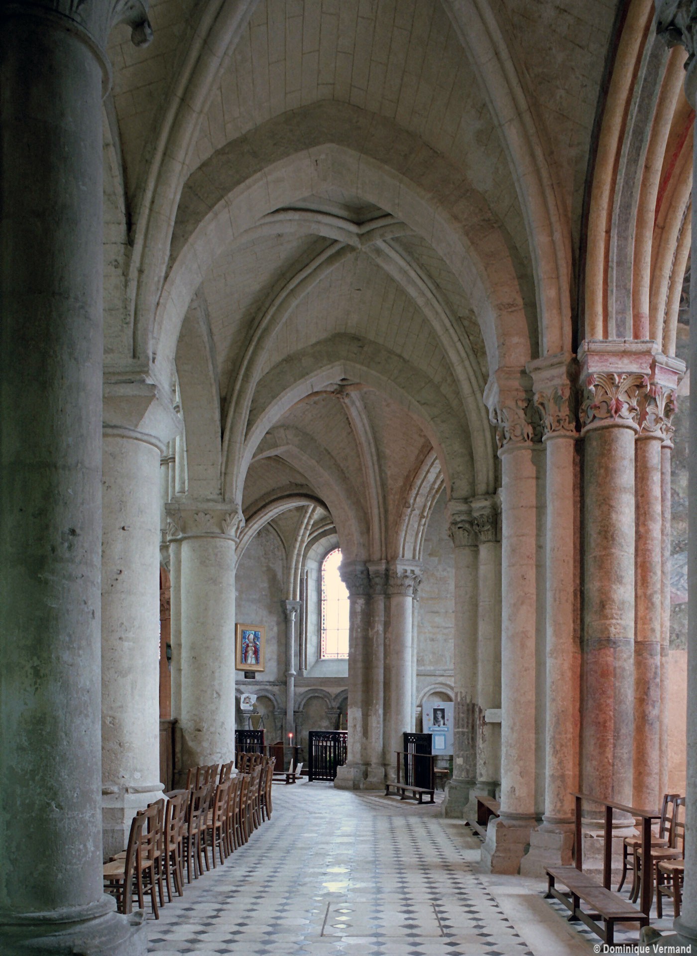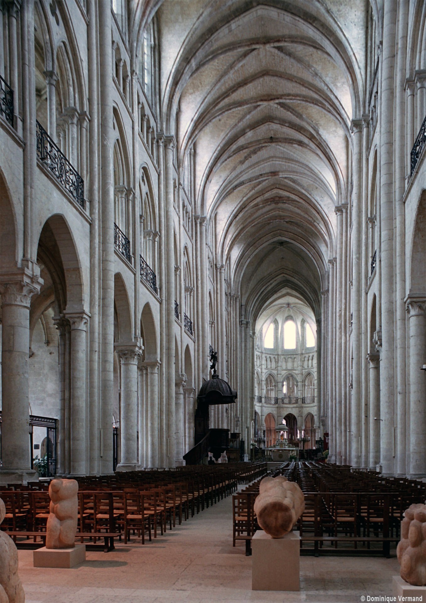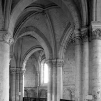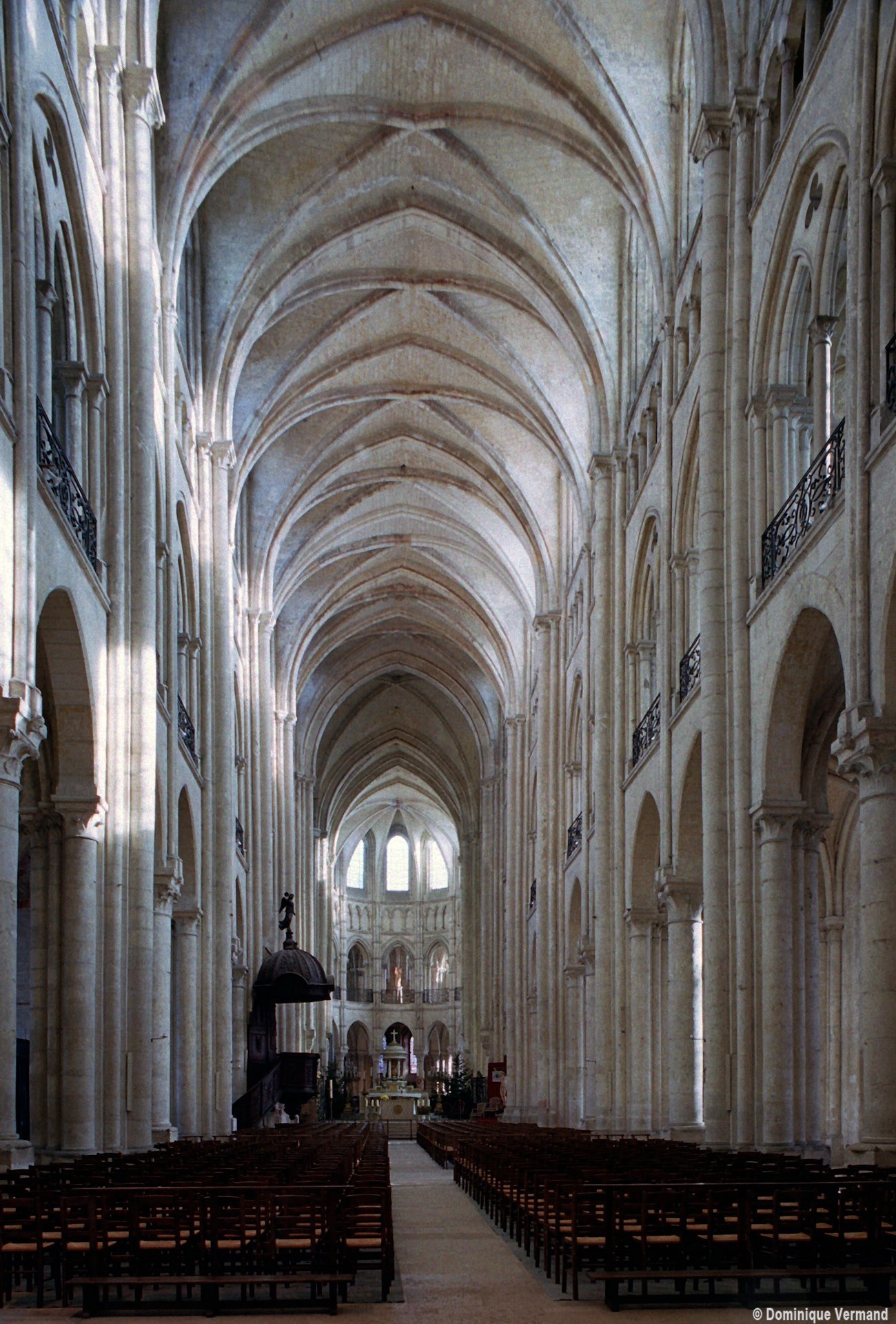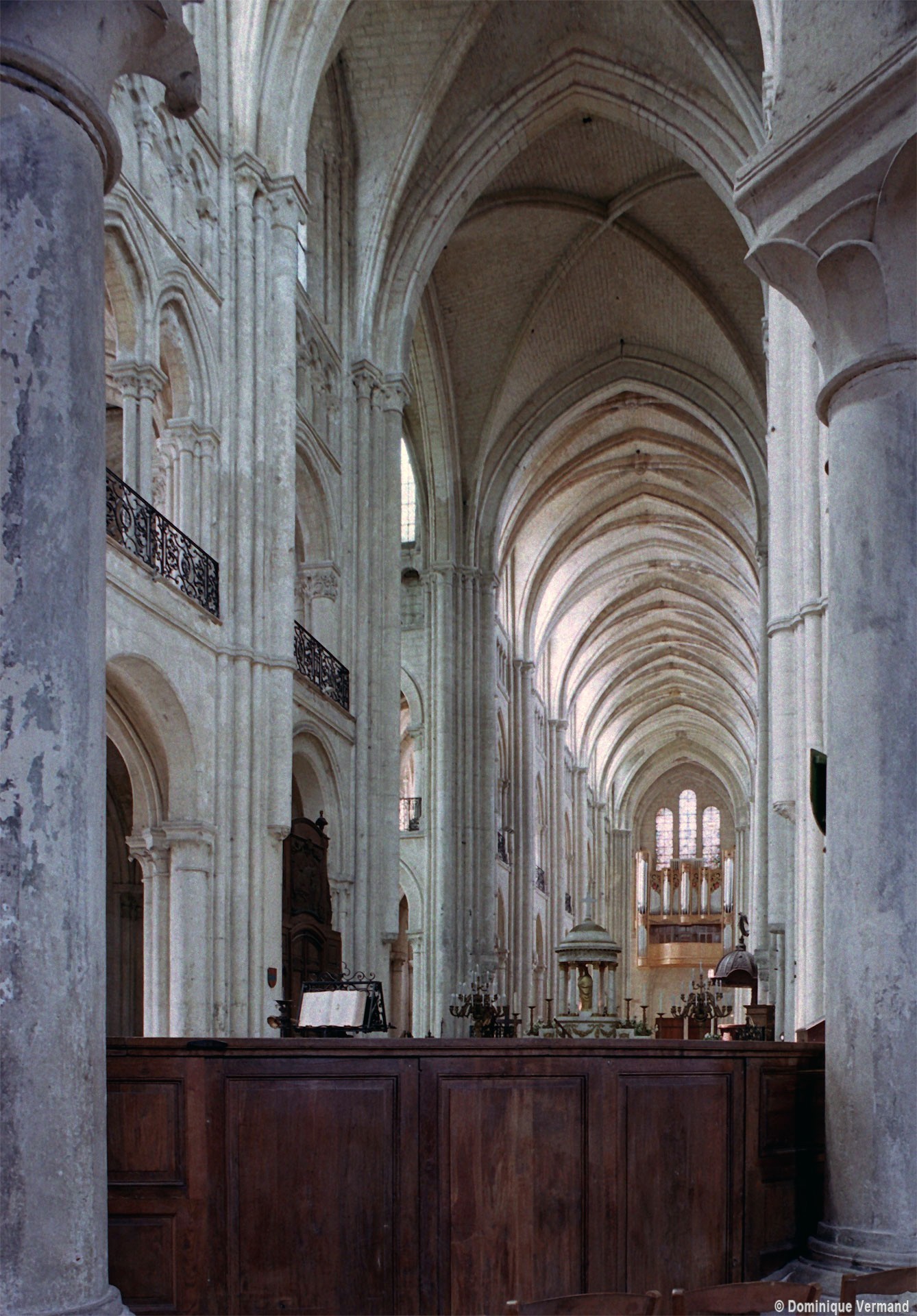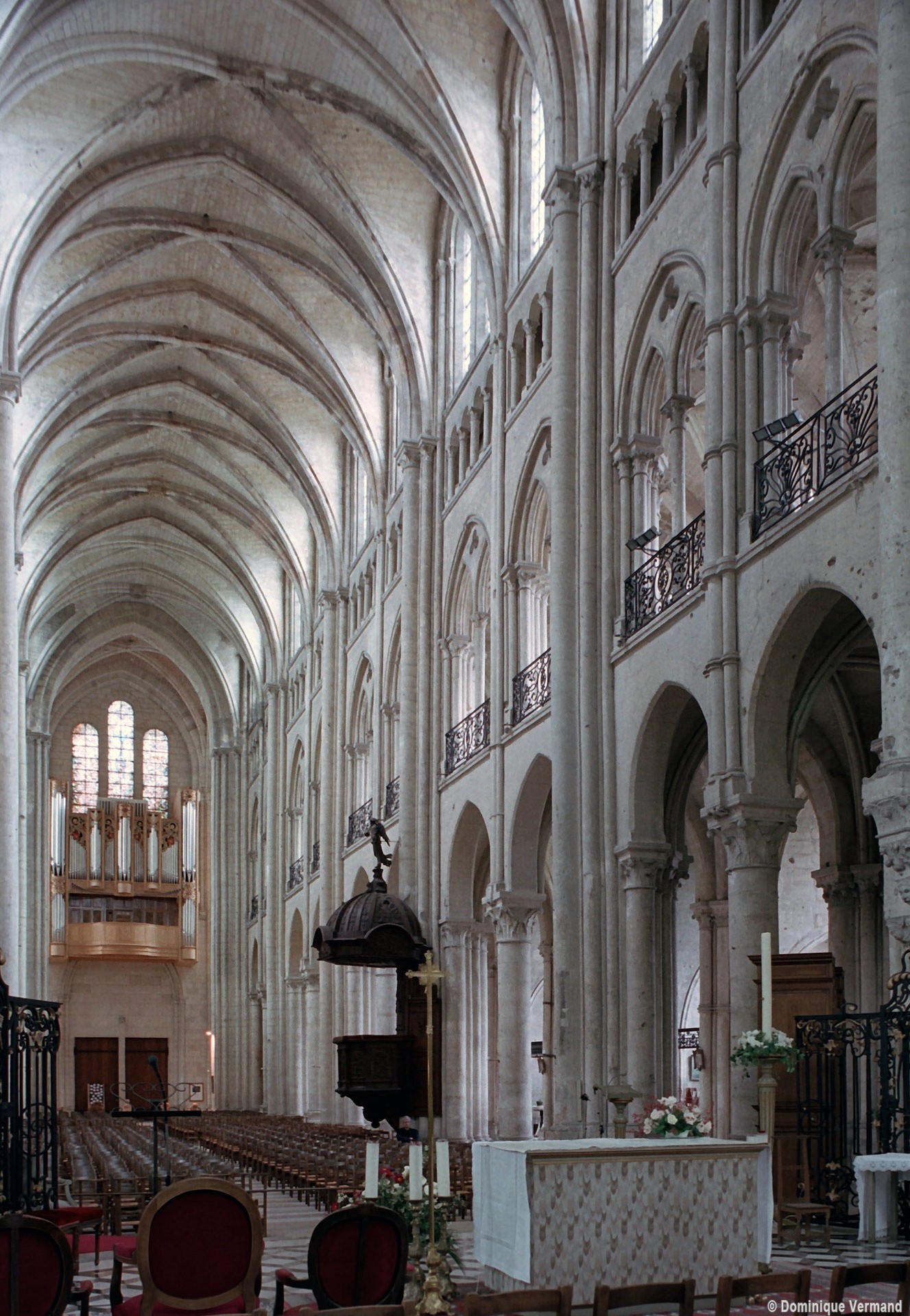 Objet d’une seconde campagne de construction terminée vers 1165, le vaisseau central se caractérise par son élévation à quatre étages, la plus ancienne de ce type dans l’architecture gothique après Saint-Germer-de-Fly. Se succèdent ainsi l’étage des grandes arcades, celui des tribunes, un niveau d’arcatures aveugles correspondant aux combles des tribunes et l’étage des fenêtres hautes. Les arcades du rez-de-chaussée sont traitées avec une grande simplicité et retombent sur de minces piles circulaires (les quatre supports de la travée droite ont été repris au 15ème siècle). Les baies des tribunes – doubles dans les travées droites, où elles retombent au centre sur un faisceau de minces colonnes, et simples dans la partie tournante – sont, au contraire, soulignées par une mouluration d’une grande richesse. Au-dessus, les arcatures aveugles trilobées, au nombre de trois à cinq selon les travées, annoncent le triforium passage de la génération suivante, tel qu’il sera utilisé au transept et à la nef. Le dernier étage, enfin, est percé d’une série de fenêtres dont les piédroits sont soulignés par de minces colonnettes. Les voûtes retombent sur des faisceaux de trois colonnettes baguées à intervalles réguliers.