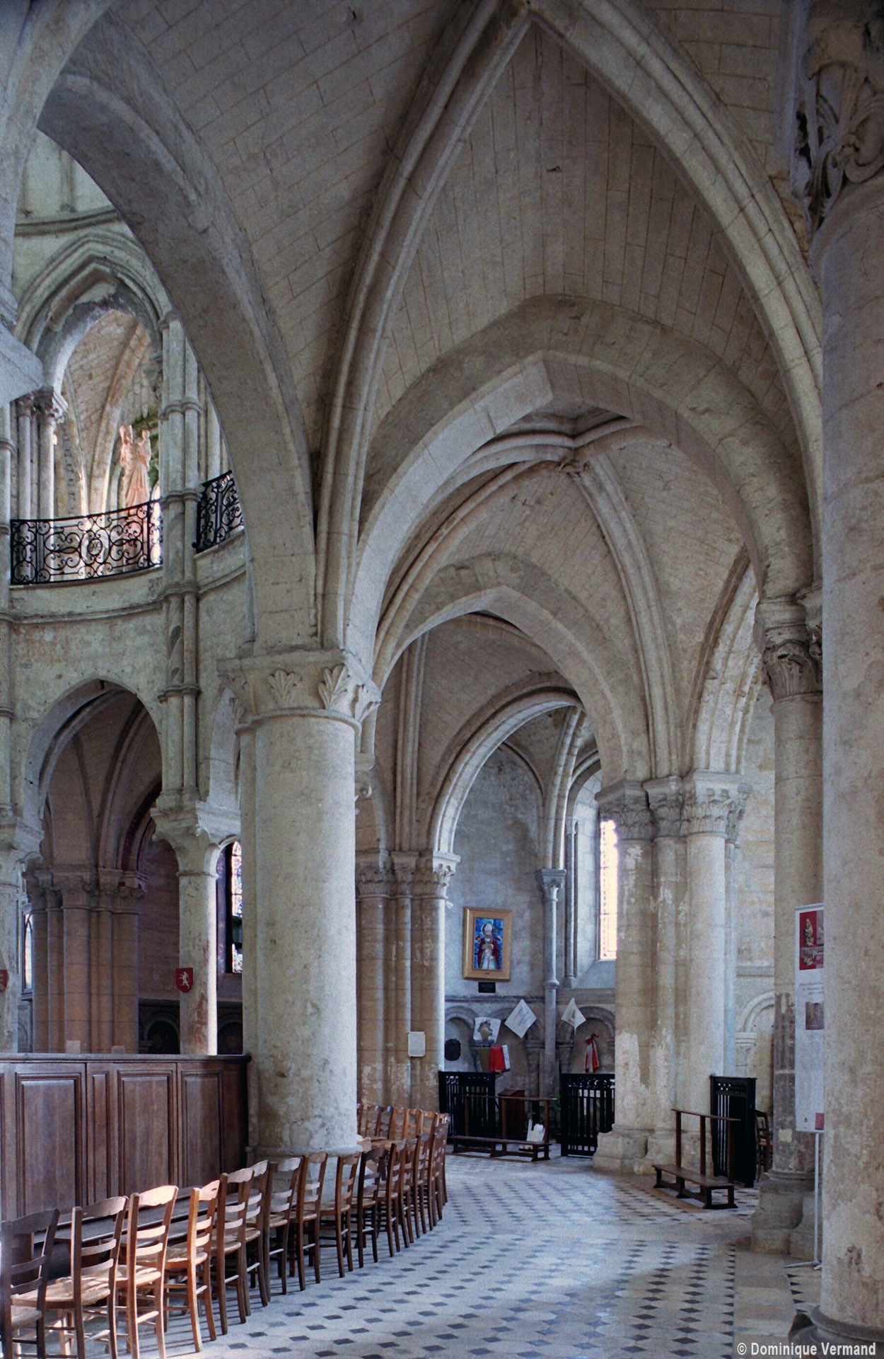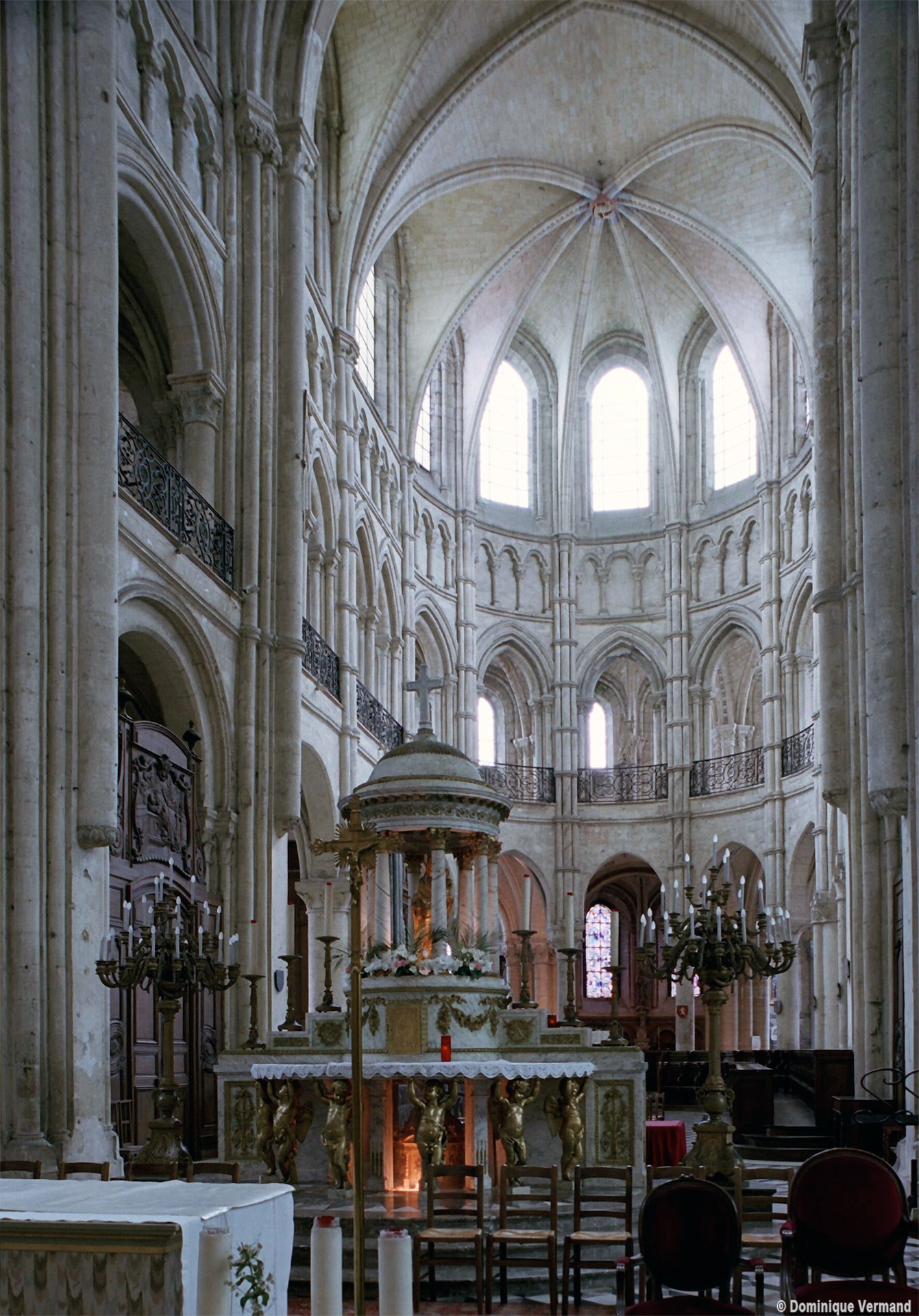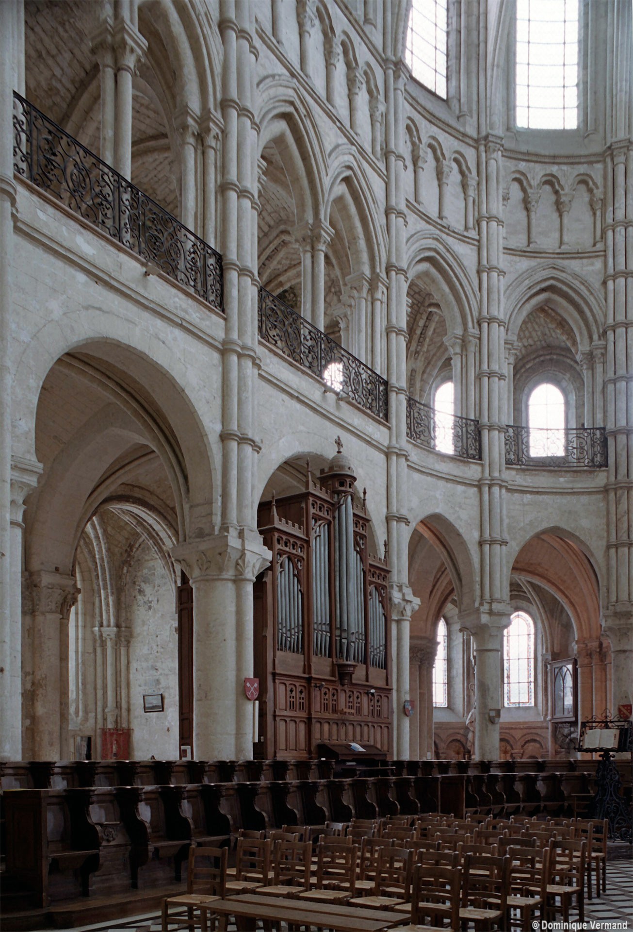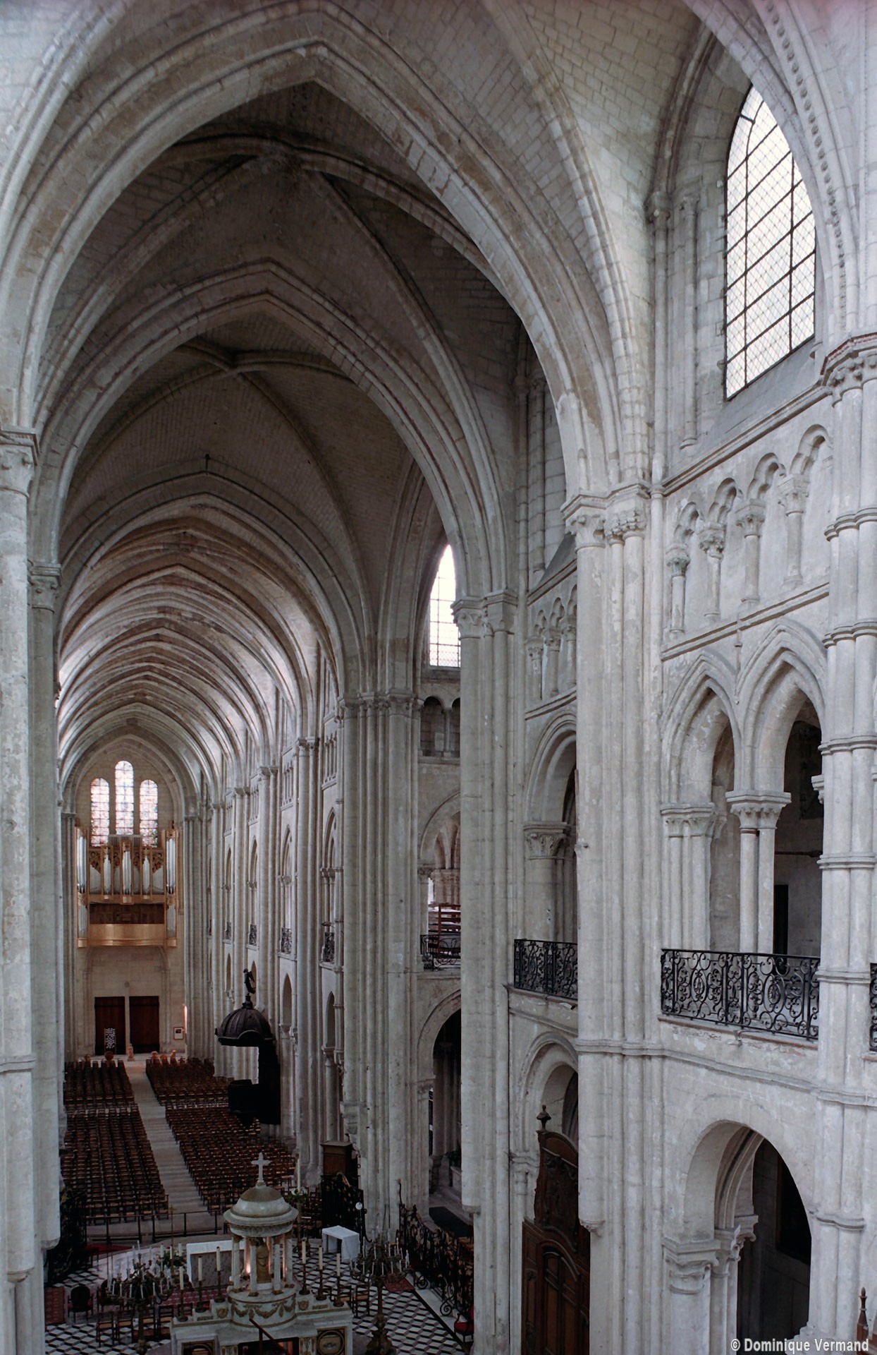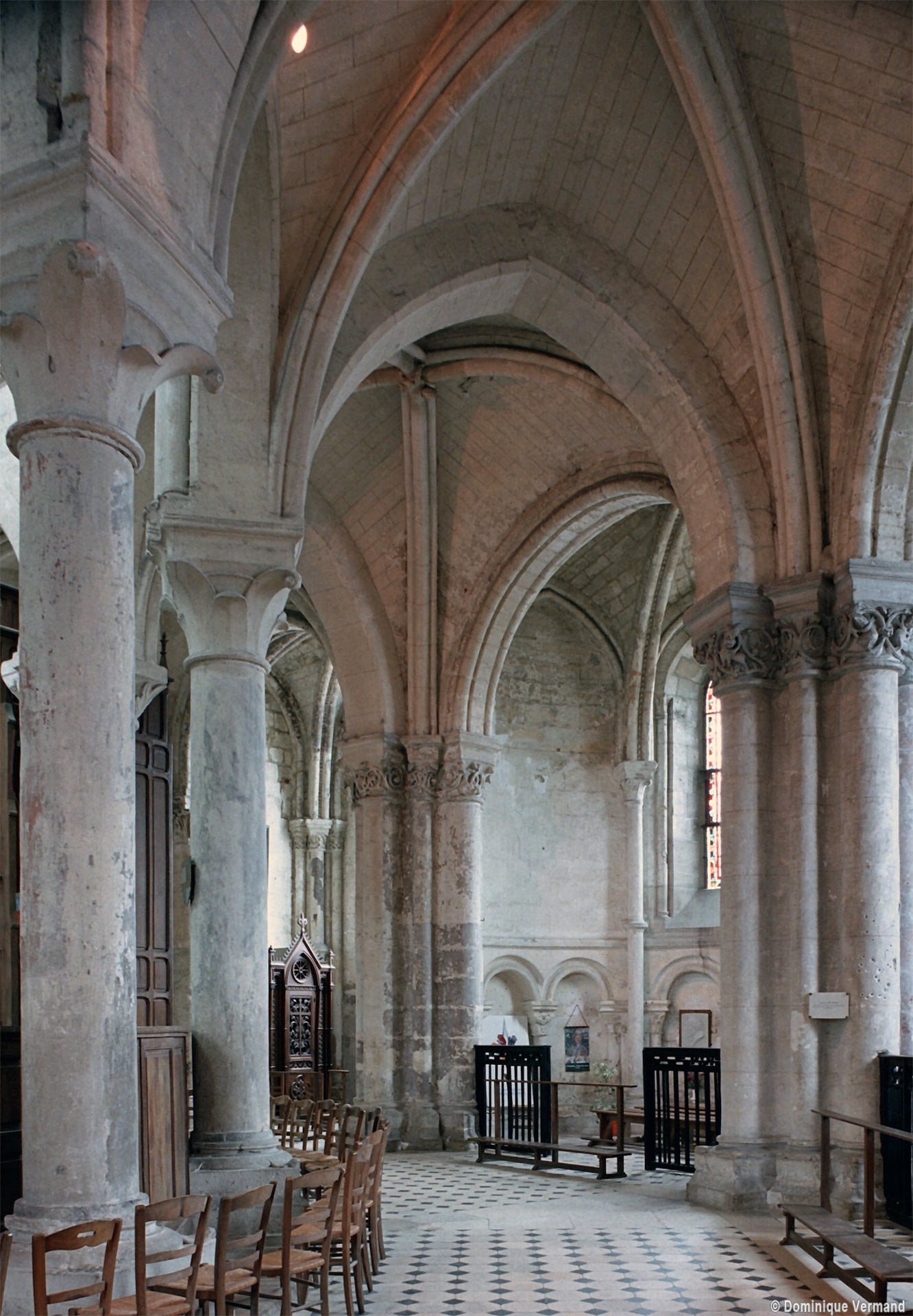 Objet d’une seconde campagne de construction terminée vers 1165, le vaisseau central se caractérise par son élévation à quatre étages, la plus ancienne de ce type dans l’architecture gothique après Saint-Germer-de-Fly. Se succèdent ainsi l’étage des grandes arcades, celui des tribunes, un niveau d’arcatures aveugles correspondant aux combles des tribunes et l’étage des fenêtres hautes. Les arcades du rez-de-chaussée sont traitées avec une grande simplicité et retombent sur de minces piles circulaires (les quatre supports de la travée droite ont été repris au 15ème siècle). Les baies des tribunes – doubles dans les travées droites, où elles retombent au centre sur un faisceau de minces colonnes, et simples dans la partie tournante – sont, au contraire, soulignées par une mouluration d’une grande richesse. Au-dessus, les arcatures aveugles trilobées, au nombre de trois à cinq selon les travées, annoncent le triforium passage de la génération suivante, tel qu’il sera utilisé au transept et à la nef. Le dernier étage, enfin, est percé d’une série de fenêtres dont les piédroits sont soulignés par de minces colonnettes. Les voûtes retombent sur des faisceaux de trois colonnettes baguées à intervalles réguliers.