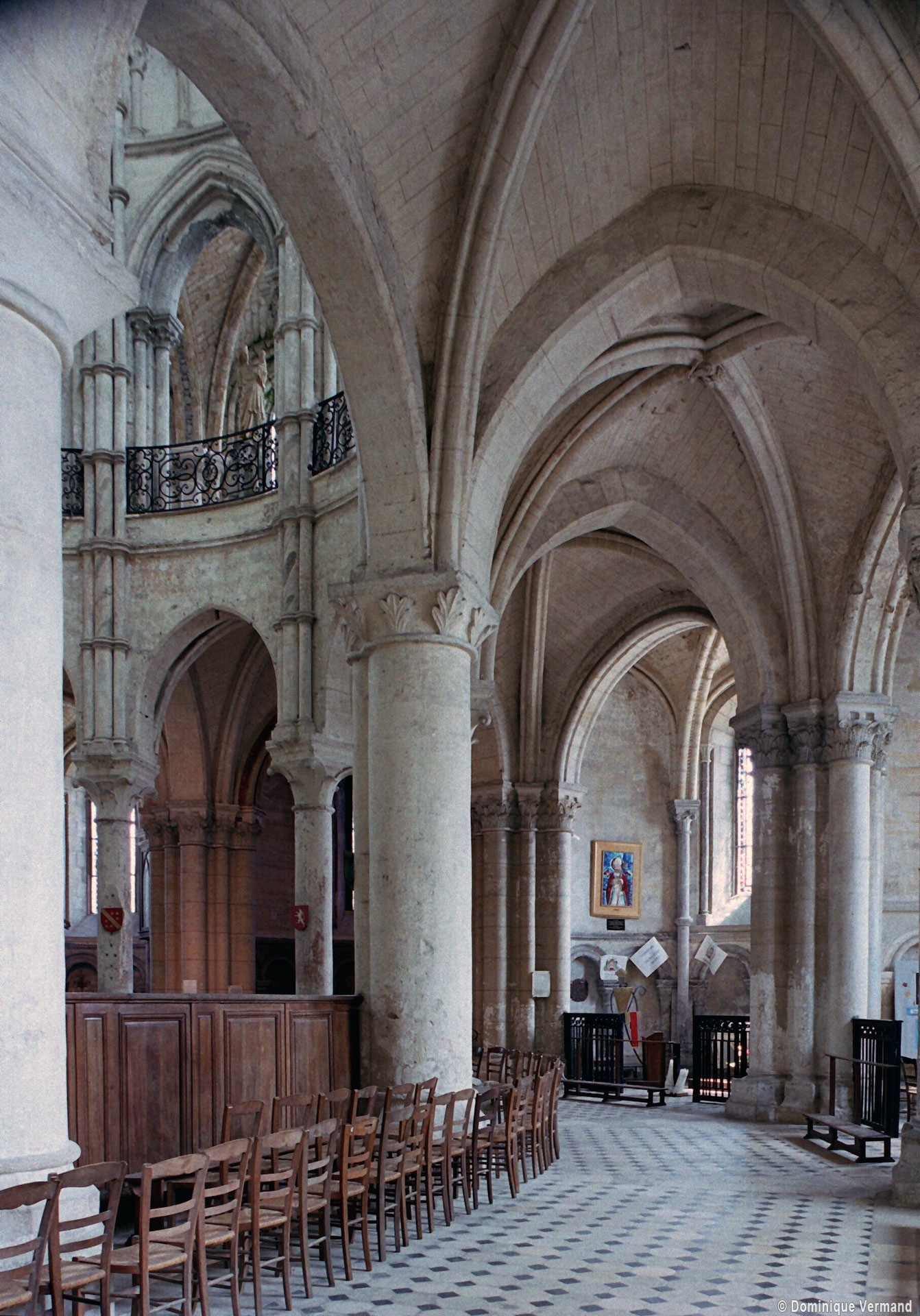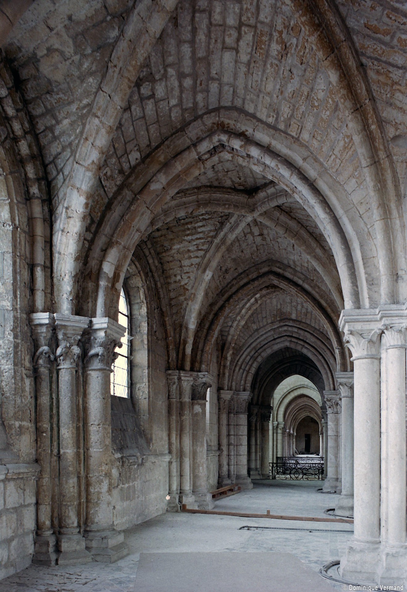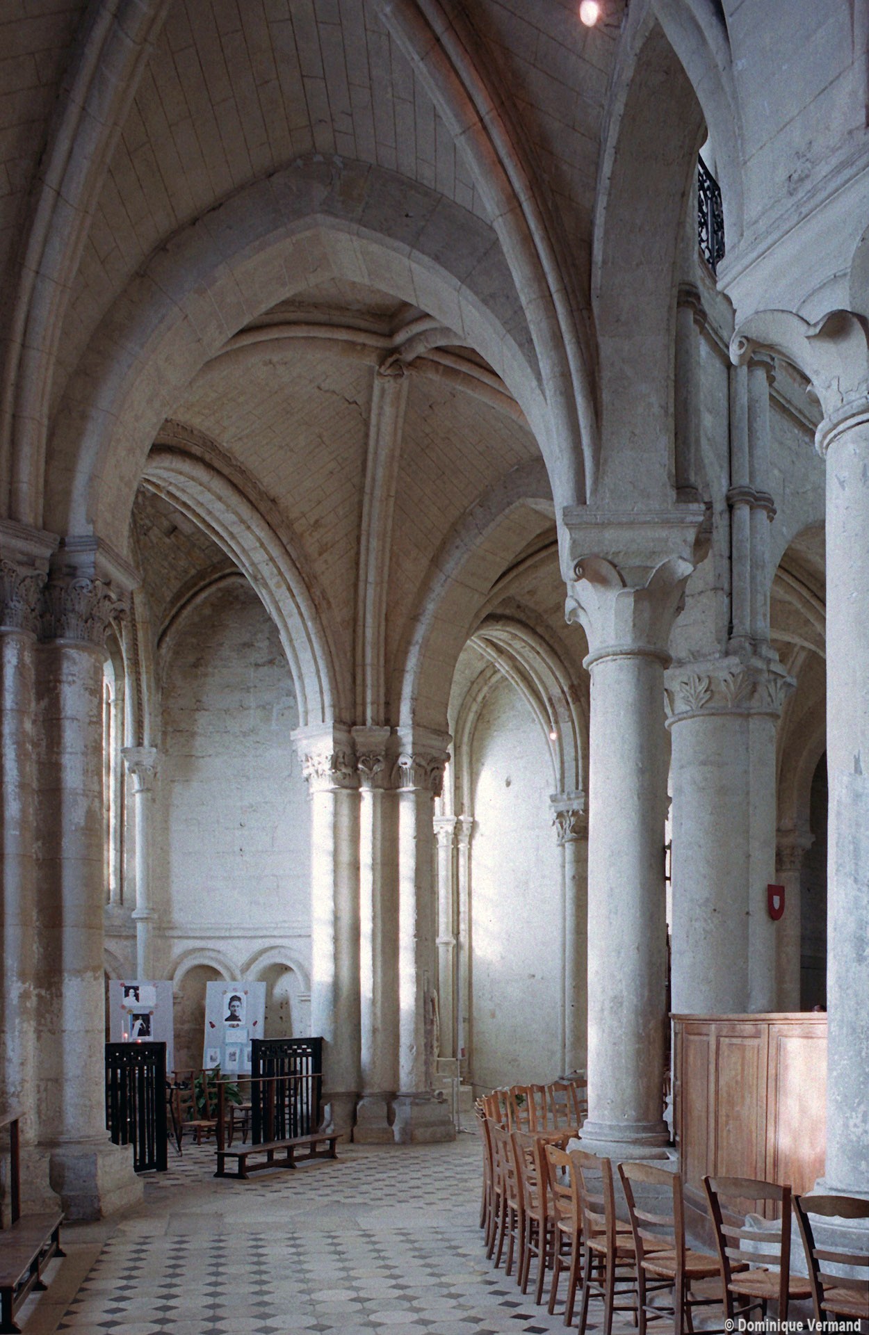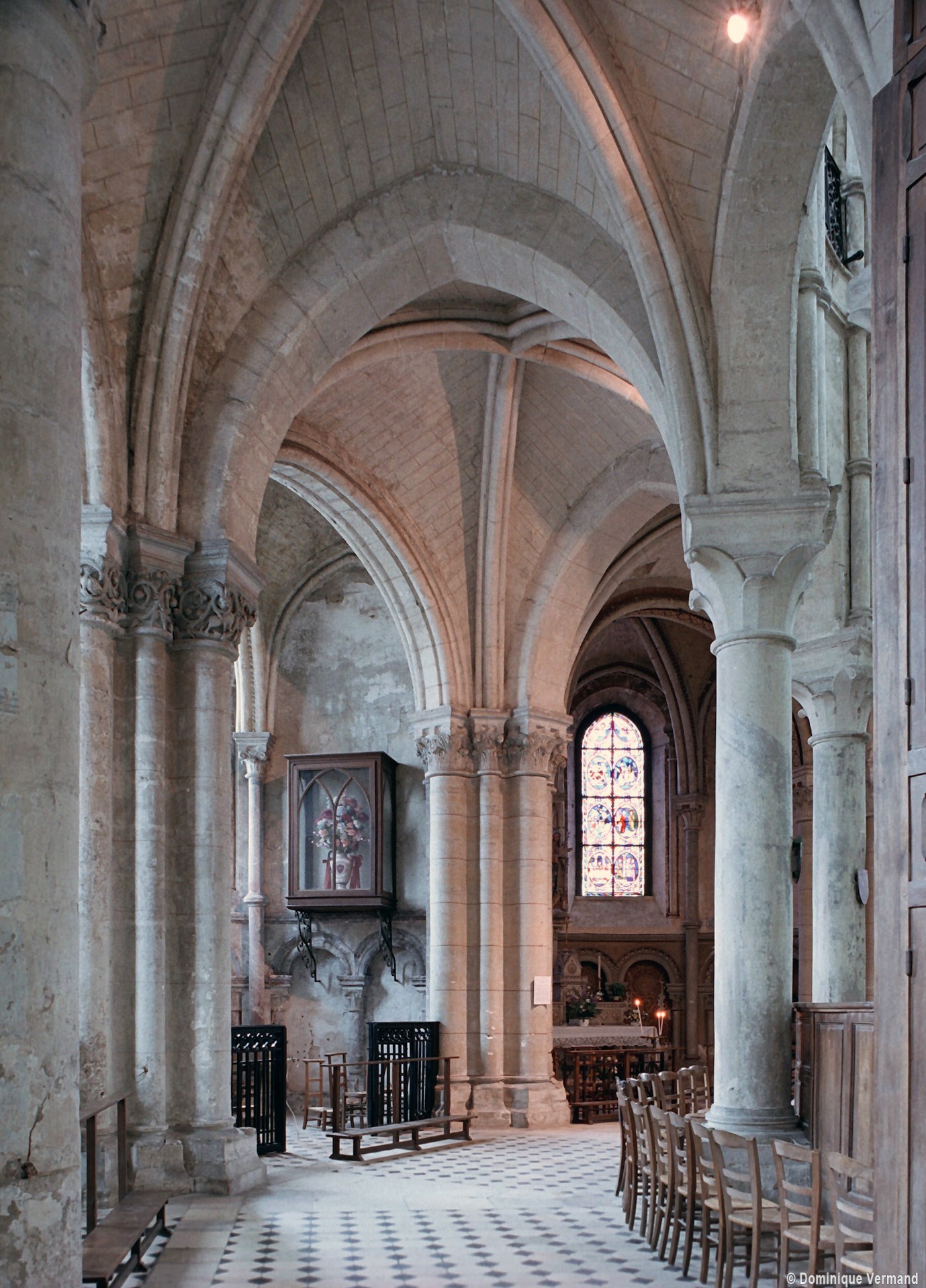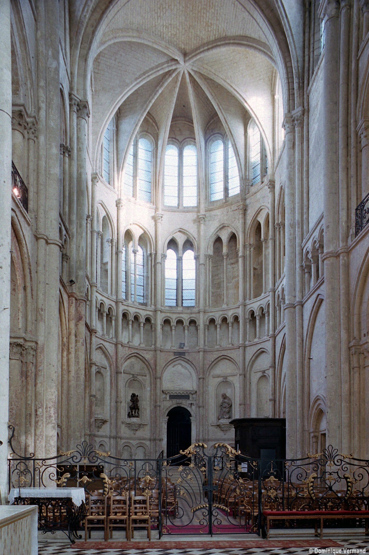 Objet d’une seconde campagne de construction terminée vers 1165, le vaisseau central se caractérise par son élévation à quatre étages, la plus ancienne de ce type dans l’architecture gothique après Saint-Germer-de-Fly. Se succèdent ainsi l’étage des grandes arcades, celui des tribunes, un niveau d’arcatures aveugles correspondant aux combles des tribunes et l’étage des fenêtres hautes. Les arcades du rez-de-chaussée sont traitées avec une grande simplicité et retombent sur de minces piles circulaires (les quatre supports de la travée droite ont été repris au 15ème siècle). Les baies des tribunes – doubles dans les travées droites, où elles retombent au centre sur un faisceau de minces colonnes, et simples dans la partie tournante – sont, au contraire, soulignées par une mouluration d’une grande richesse. Au-dessus, les arcatures aveugles trilobées, au nombre de trois à cinq selon les travées, annoncent le triforium passage de la génération suivante, tel qu’il sera utilisé au transept et à la nef. Le dernier étage, enfin, est percé d’une série de fenêtres dont les piédroits sont soulignés par de minces colonnettes. Les voûtes retombent sur des faisceaux de trois colonnettes baguées à intervalles réguliers.