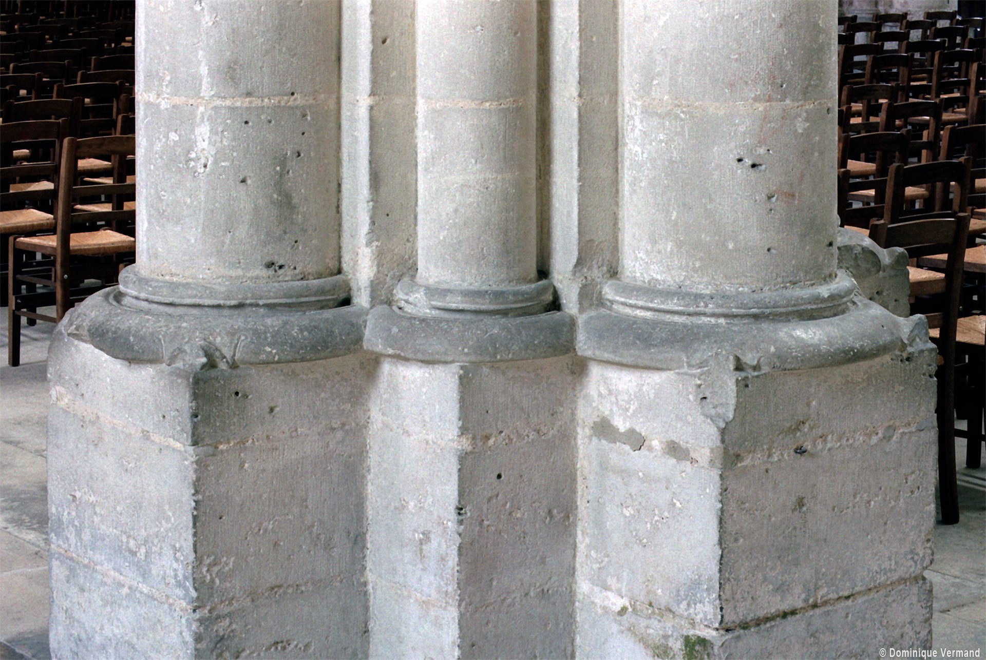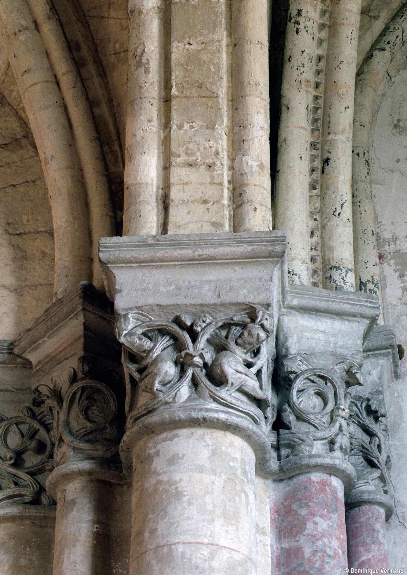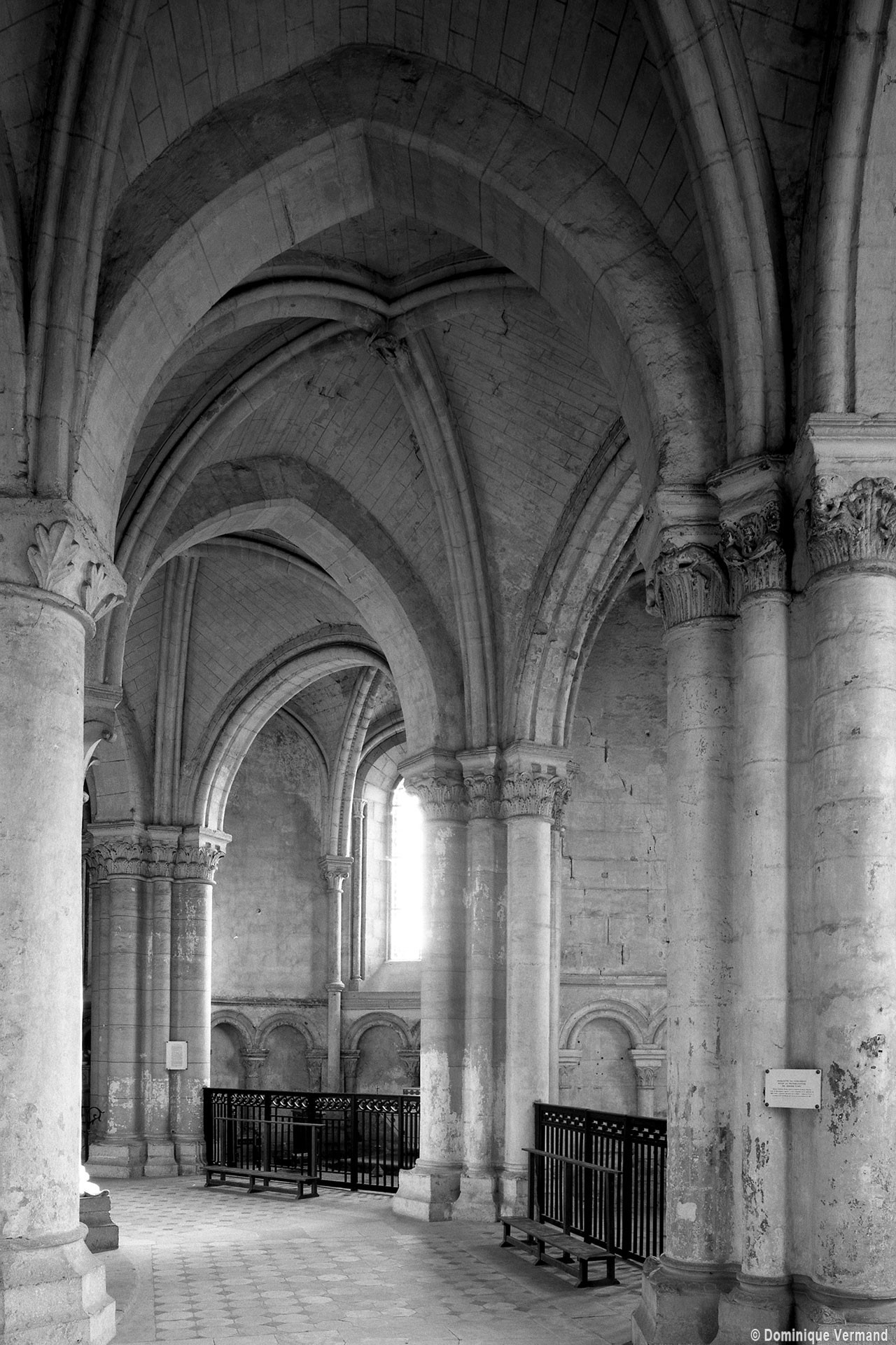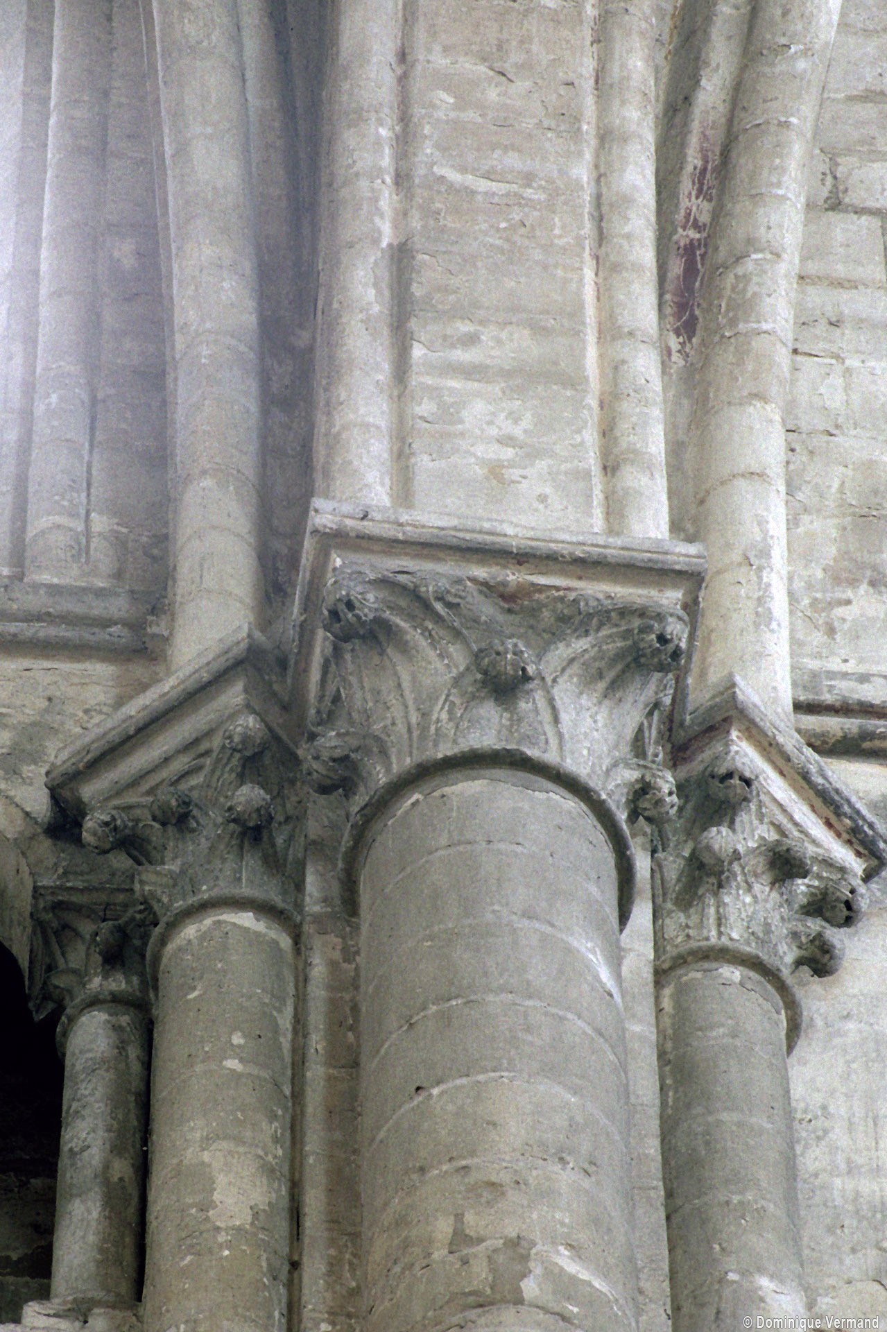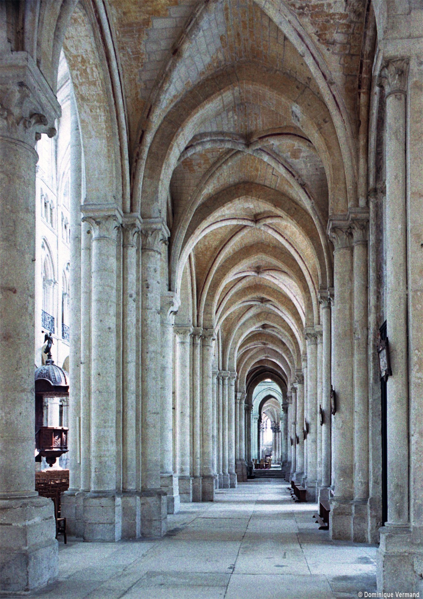 Objet d’une seconde campagne de construction terminée vers 1165, le vaisseau central se caractérise par son élévation à quatre étages, la plus ancienne de ce type dans l’architecture gothique après Saint-Germer-de-Fly. Se succèdent ainsi l’étage des grandes arcades, celui des tribunes, un niveau d’arcatures aveugles correspondant aux combles des tribunes et l’étage des fenêtres hautes. Les arcades du rez-de-chaussée sont traitées avec une grande simplicité et retombent sur de minces piles circulaires (les quatre supports de la travée droite ont été repris au 15ème siècle). Les baies des tribunes – doubles dans les travées droites, où elles retombent au centre sur un faisceau de minces colonnes, et simples dans la partie tournante – sont, au contraire, soulignées par une mouluration d’une grande richesse. Au-dessus, les arcatures aveugles trilobées, au nombre de trois à cinq selon les travées, annoncent le triforium passage de la génération suivante, tel qu’il sera utilisé au transept et à la nef. Le dernier étage, enfin, est percé d’une série de fenêtres dont les piédroits sont soulignés par de minces colonnettes. Les voûtes retombent sur des faisceaux de trois colonnettes baguées à intervalles réguliers.