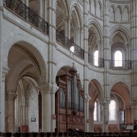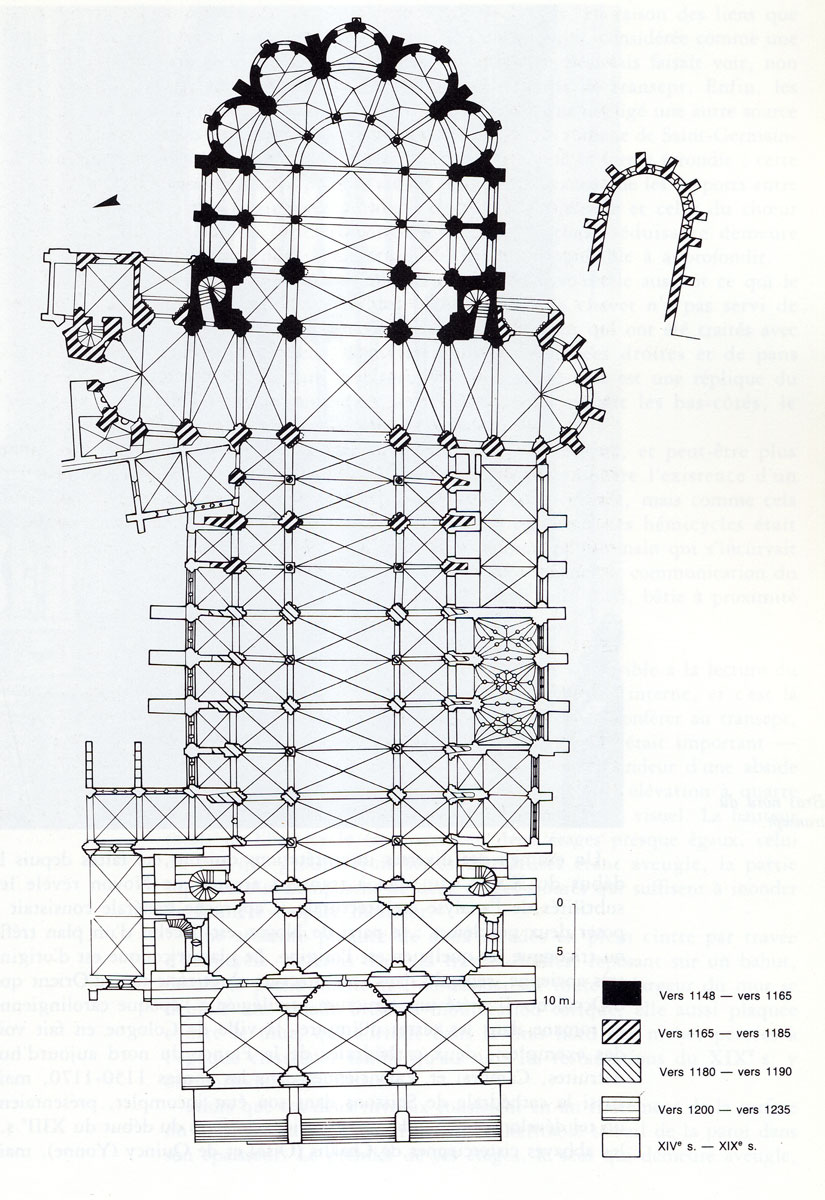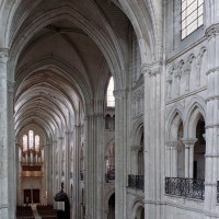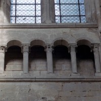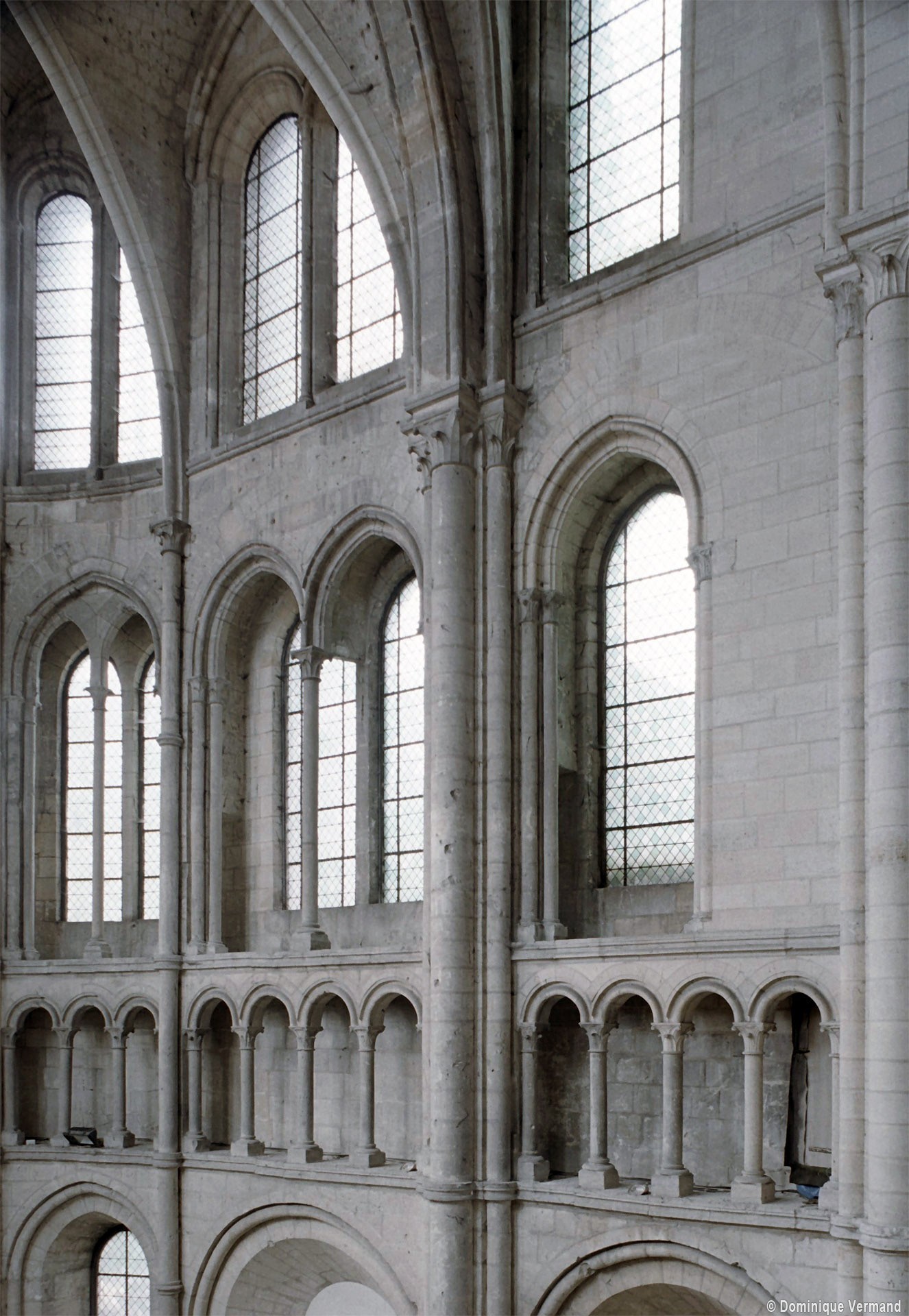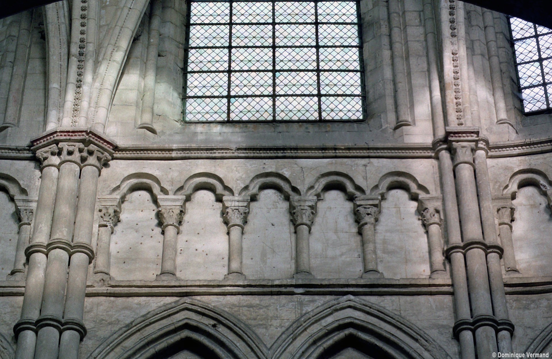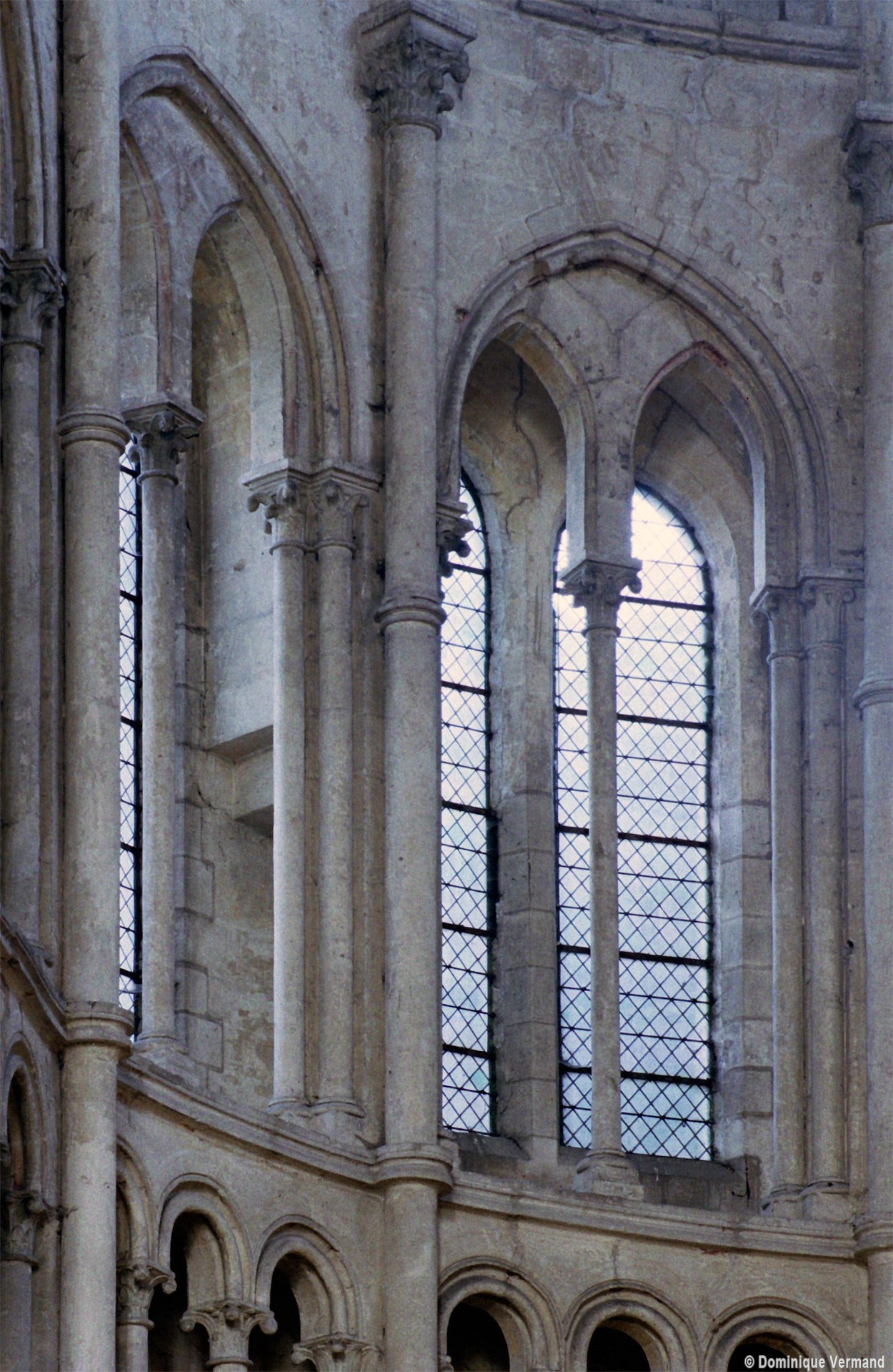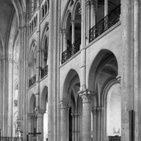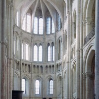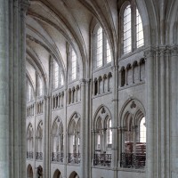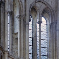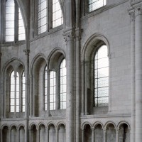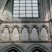 Mais, plus encore que le plan, c’est la conception de l’élévation qui retient l’attention. Divisée en cinq registres, elle comporte d’abord un soubassement puissant constitué d’une suite de deux ou trois arcatures aveugles au premier niveau, que circonscrivent des arcatures simples constituant le second niveau. Au-dessus, un triforium passage assure la continuité de la circulation entre les tribunes du choeur et celles de la nef. En contraste total avec cette partie aveugle (en tout cas au nord, le doute subsistant au sud, où les fenêtres sont du 19ème siècle) et qui constitue environ la moitié de l’élévation totale, les deux niveaux supérieurs sont inondés de lumière. Développant le principe du triforium passage situé au-dessous, le dédoublement de la paroi s’y trouve ici affirmé d’une manière spectaculaire en associant une baie recoupée par une colonnette d’une finesse sans pareil à une fenêtre à deux lancettes, toutes ces ouvertures occupant pratiquement la totalité de l’espace disponible. Le dispositif est inversé au dernier niveau où, la fenêtre étant placée sur le plan interne, c’est la galerie de circulation qui se trouve rejetée à l’extérieur.