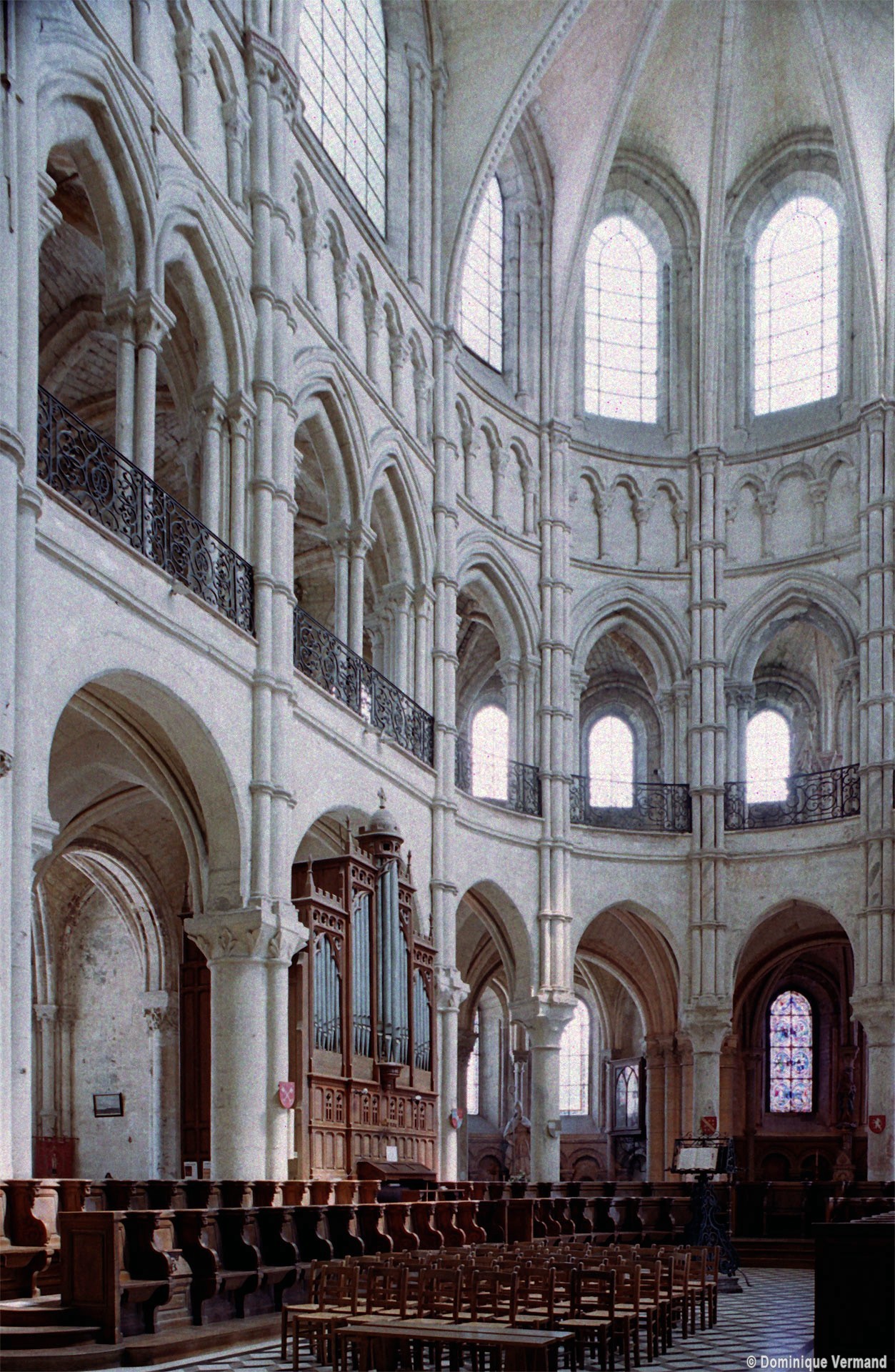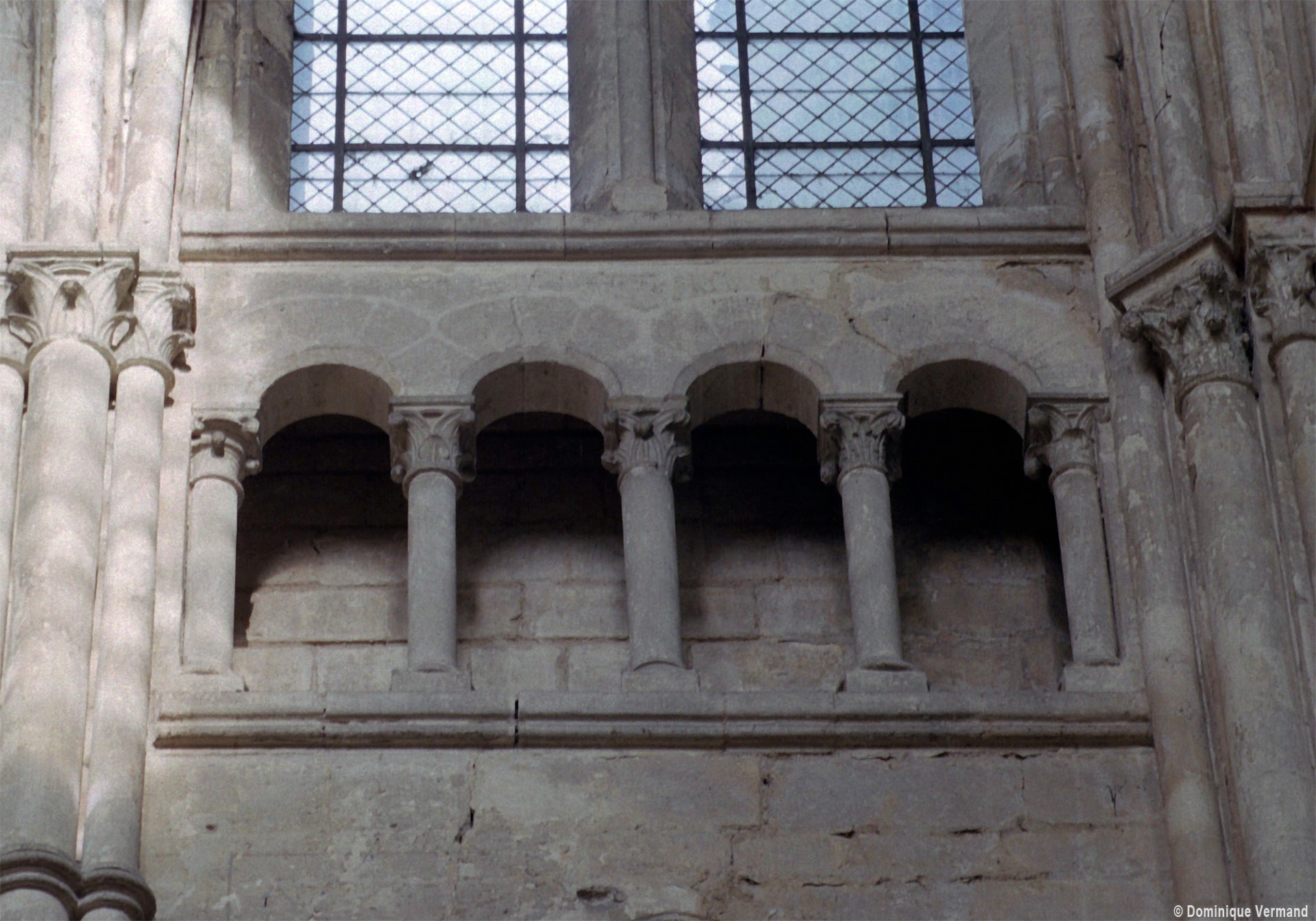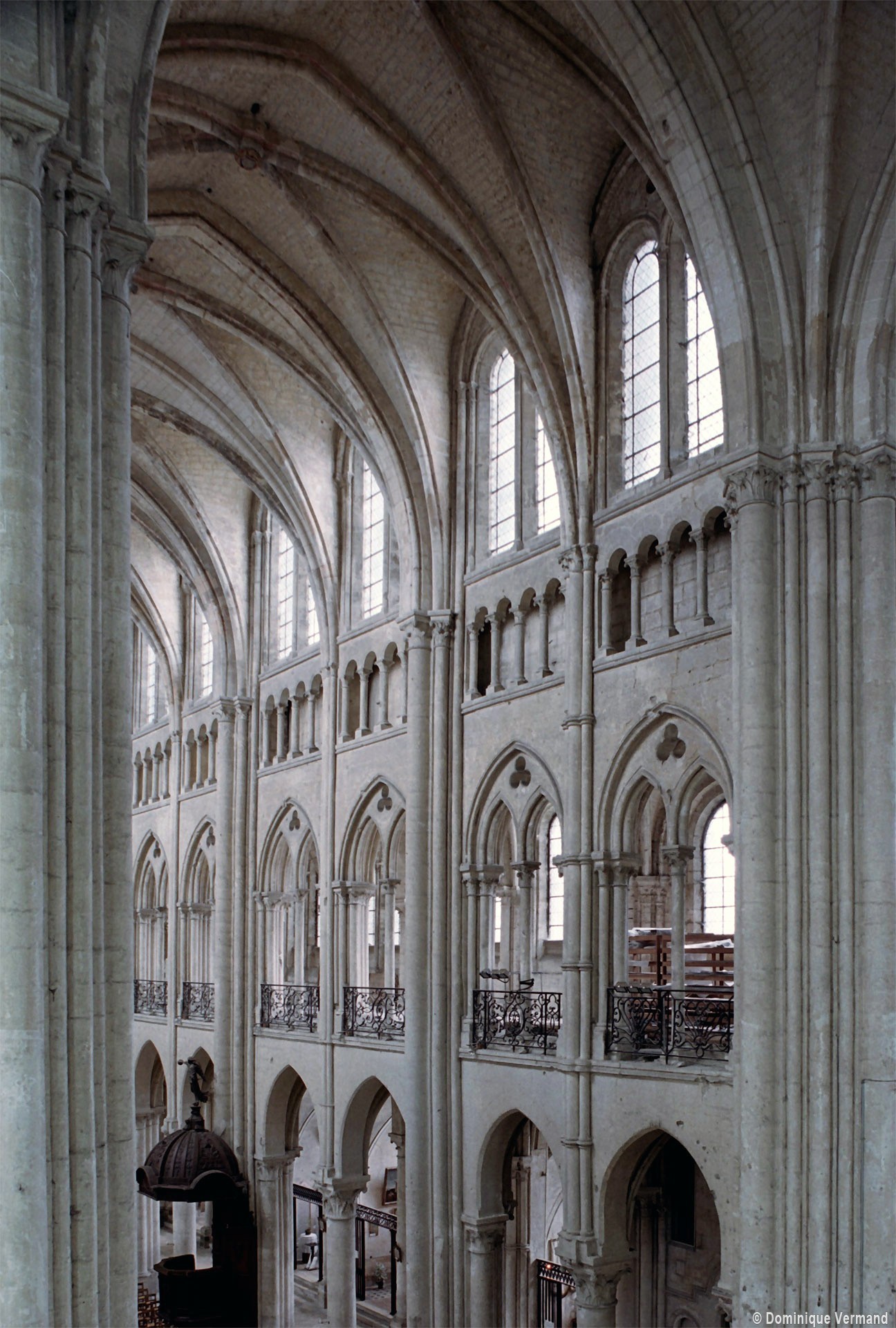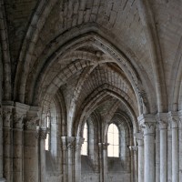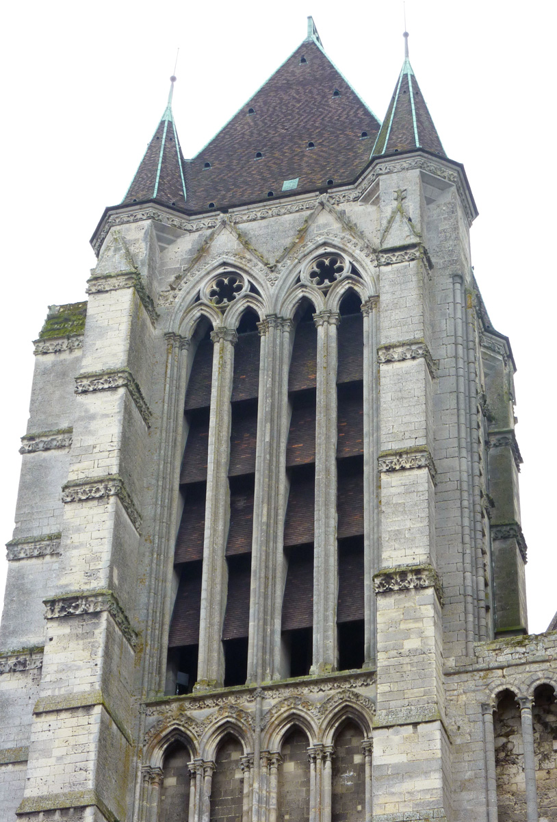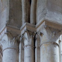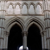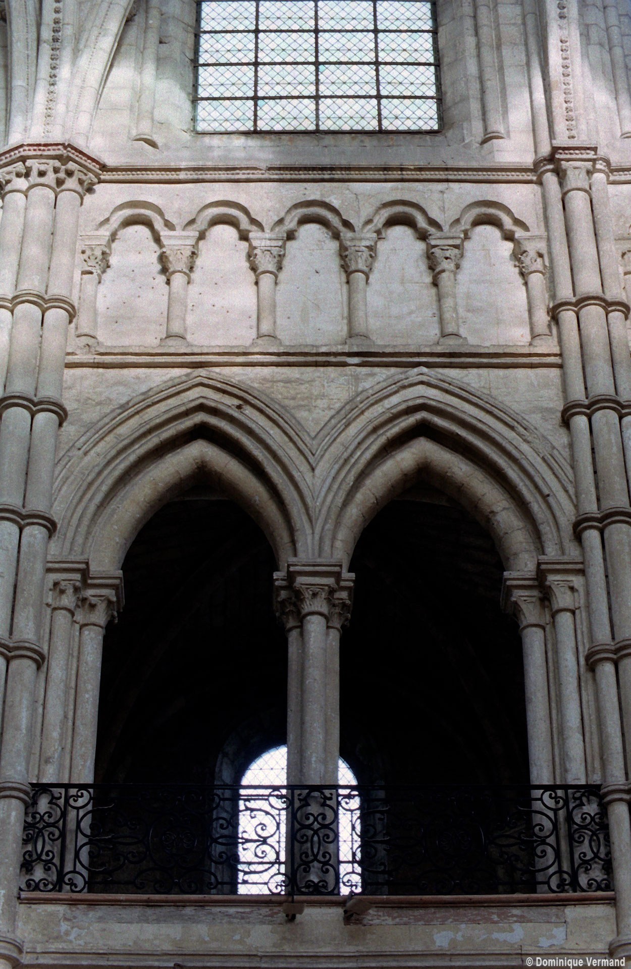 Mais, plus encore que le plan, c’est la conception de l’élévation qui retient l’attention. Divisée en cinq registres, elle comporte d’abord un soubassement puissant constitué d’une suite de deux ou trois arcatures aveugles au premier niveau, que circonscrivent des arcatures simples constituant le second niveau. Au-dessus, un triforium passage assure la continuité de la circulation entre les tribunes du choeur et celles de la nef. En contraste total avec cette partie aveugle (en tout cas au nord, le doute subsistant au sud, où les fenêtres sont du 19ème siècle) et qui constitue environ la moitié de l’élévation totale, les deux niveaux supérieurs sont inondés de lumière. Développant le principe du triforium passage situé au-dessous, le dédoublement de la paroi s’y trouve ici affirmé d’une manière spectaculaire en associant une baie recoupée par une colonnette d’une finesse sans pareil à une fenêtre à deux lancettes, toutes ces ouvertures occupant pratiquement la totalité de l’espace disponible. Le dispositif est inversé au dernier niveau où, la fenêtre étant placée sur le plan interne, c’est la galerie de circulation qui se trouve rejetée à l’extérieur.