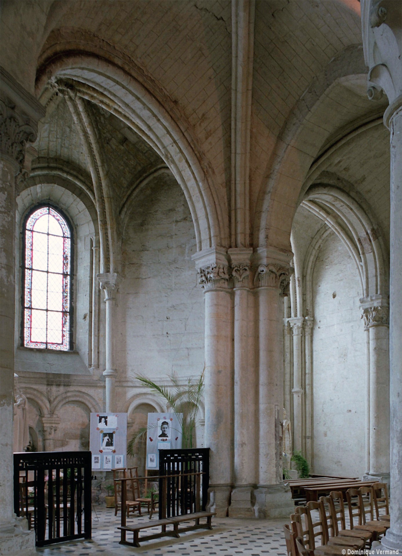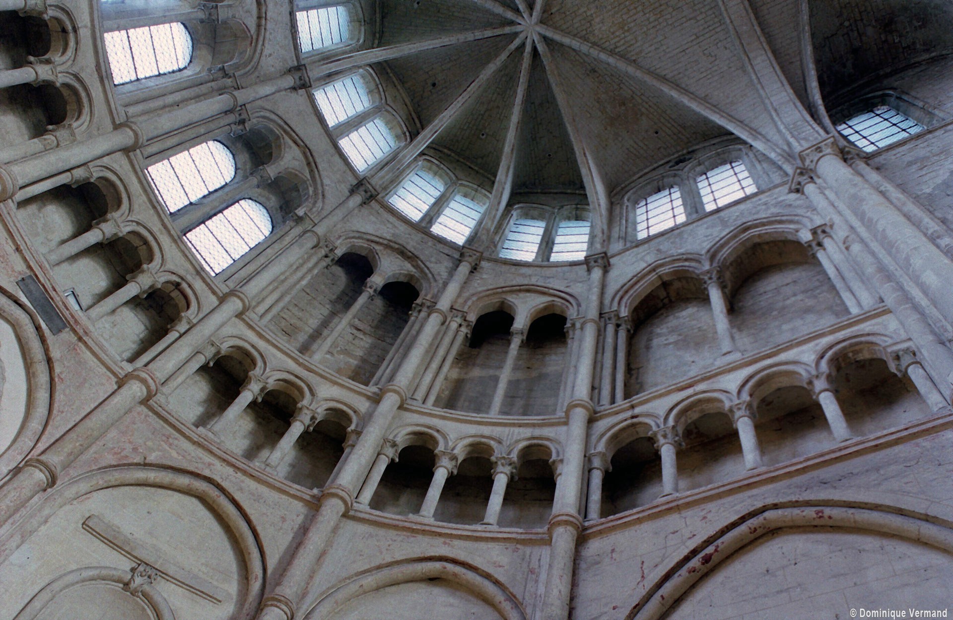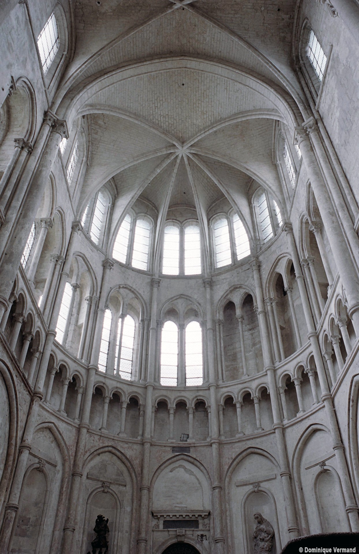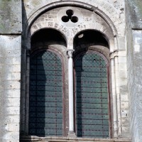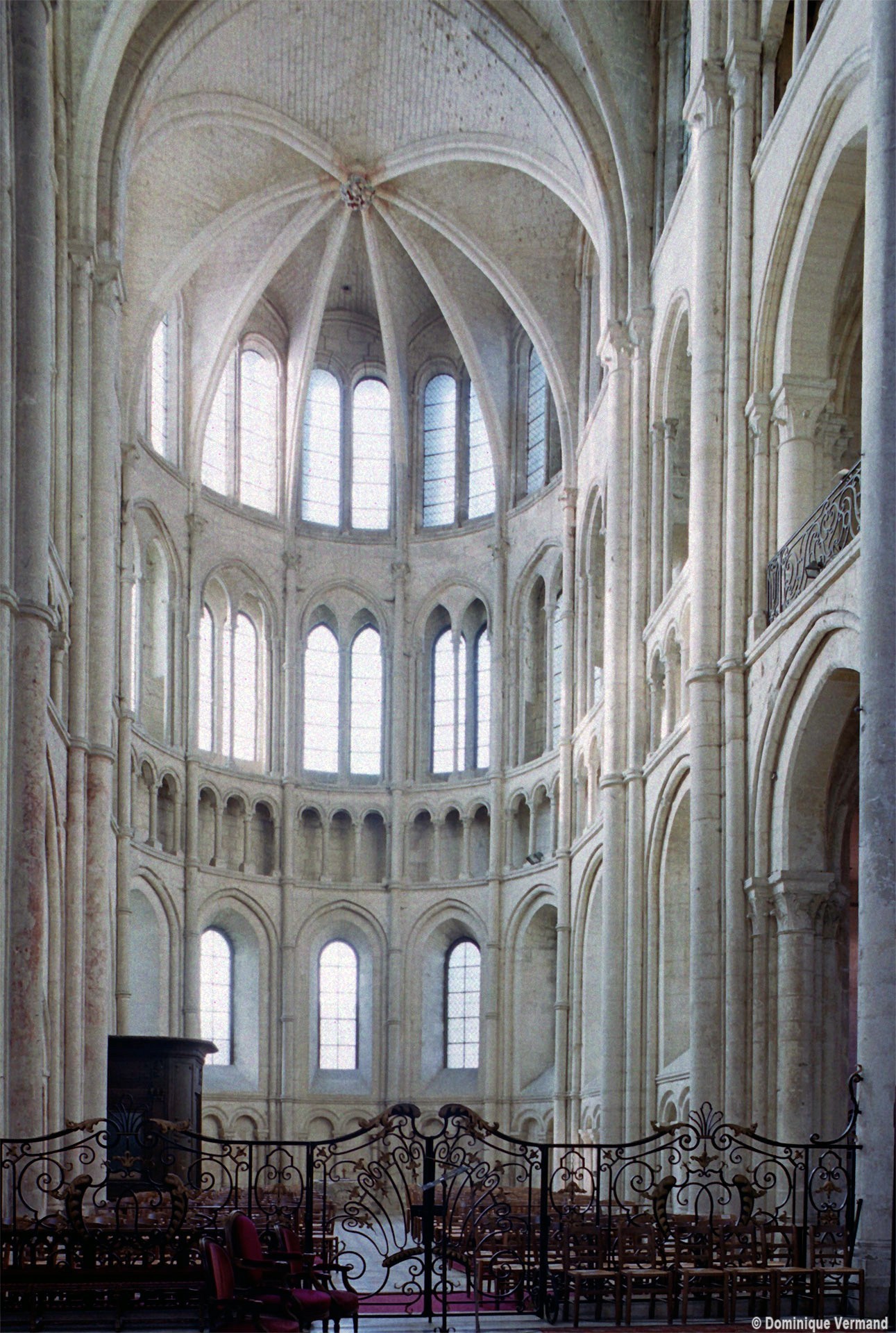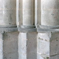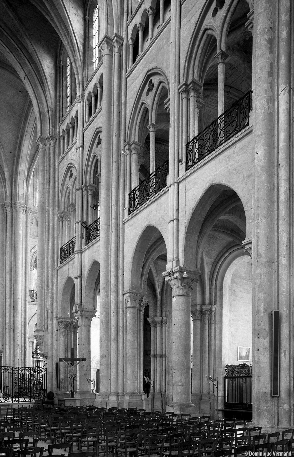 Mais, plus encore que le plan, c’est la conception de l’élévation qui retient l’attention. Divisée en cinq registres, elle comporte d’abord un soubassement puissant constitué d’une suite de deux ou trois arcatures aveugles au premier niveau, que circonscrivent des arcatures simples constituant le second niveau. Au-dessus, un triforium passage assure la continuité de la circulation entre les tribunes du choeur et celles de la nef. En contraste total avec cette partie aveugle (en tout cas au nord, le doute subsistant au sud, où les fenêtres sont du 19ème siècle) et qui constitue environ la moitié de l’élévation totale, les deux niveaux supérieurs sont inondés de lumière. Développant le principe du triforium passage situé au-dessous, le dédoublement de la paroi s’y trouve ici affirmé d’une manière spectaculaire en associant une baie recoupée par une colonnette d’une finesse sans pareil à une fenêtre à deux lancettes, toutes ces ouvertures occupant pratiquement la totalité de l’espace disponible. Le dispositif est inversé au dernier niveau où, la fenêtre étant placée sur le plan interne, c’est la galerie de circulation qui se trouve rejetée à l’extérieur.