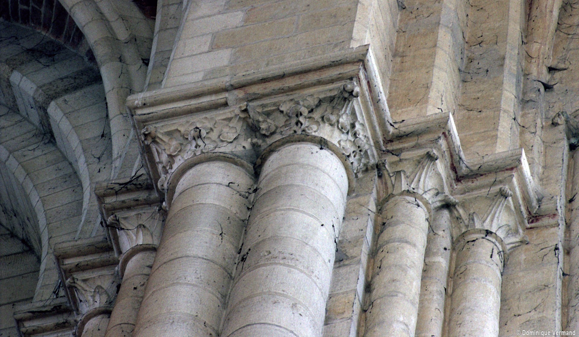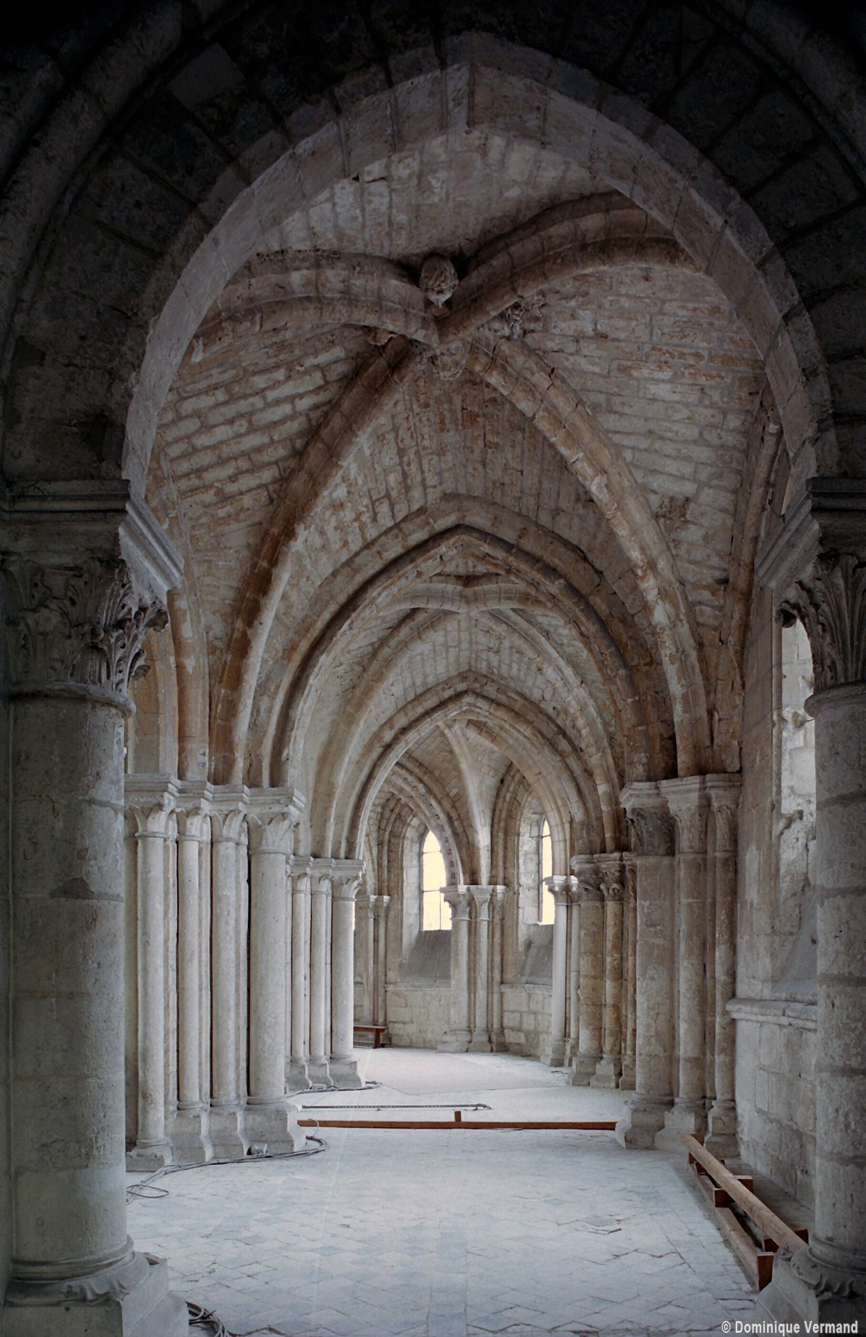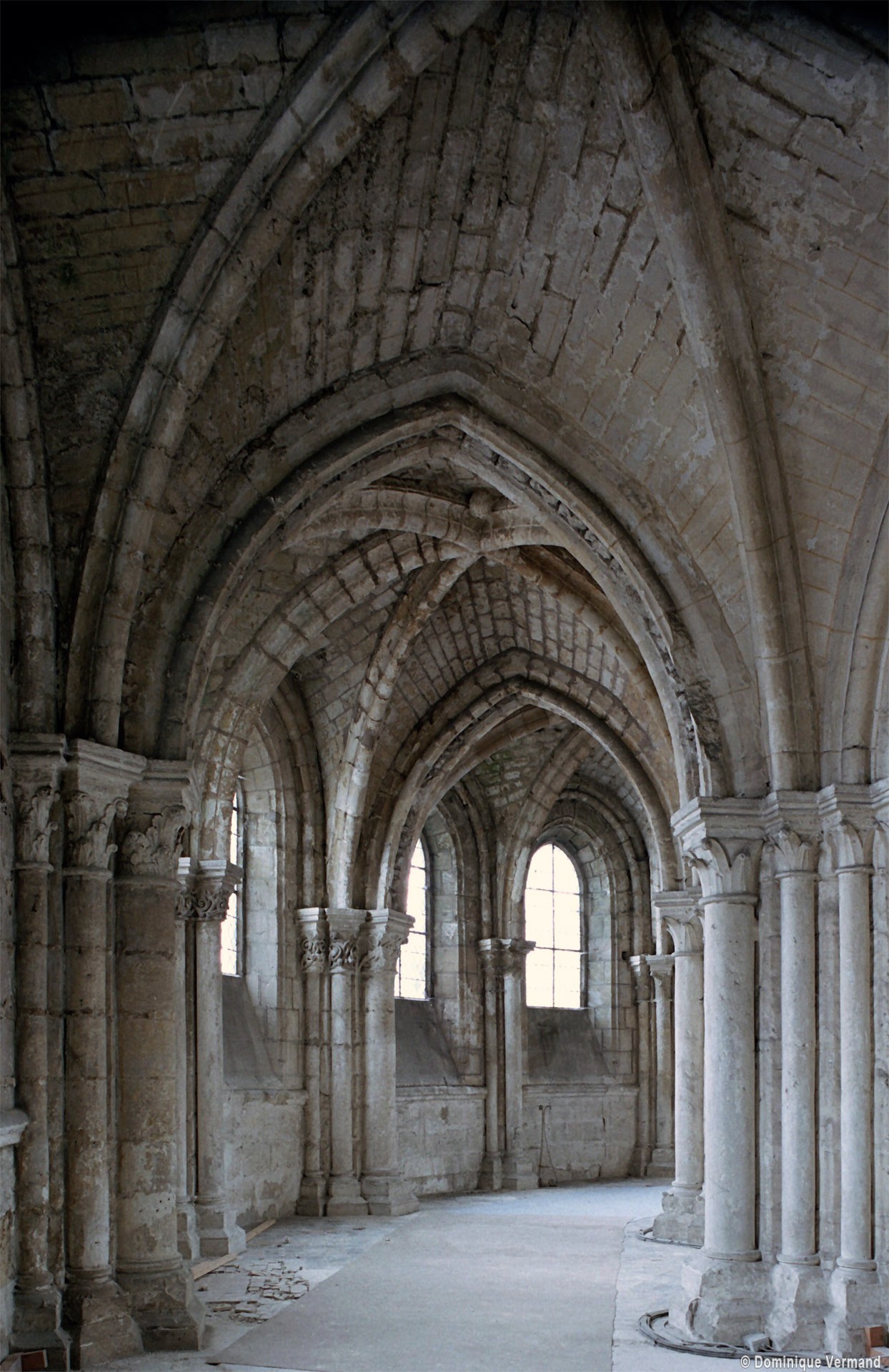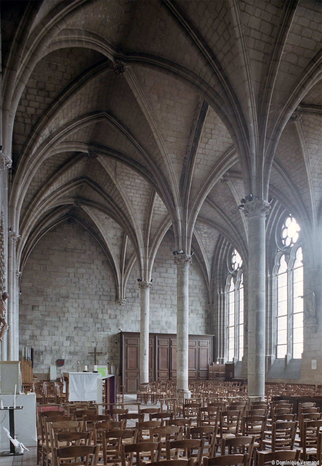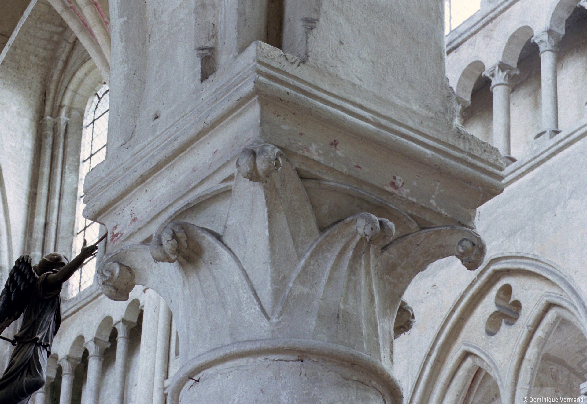 Mais, plus encore que le plan, c’est la conception de l’élévation qui retient l’attention. Divisée en cinq registres, elle comporte d’abord un soubassement puissant constitué d’une suite de deux ou trois arcatures aveugles au premier niveau, que circonscrivent des arcatures simples constituant le second niveau. Au-dessus, un triforium passage assure la continuité de la circulation entre les tribunes du choeur et celles de la nef. En contraste total avec cette partie aveugle (en tout cas au nord, le doute subsistant au sud, où les fenêtres sont du 19ème siècle) et qui constitue environ la moitié de l’élévation totale, les deux niveaux supérieurs sont inondés de lumière. Développant le principe du triforium passage situé au-dessous, le dédoublement de la paroi s’y trouve ici affirmé d’une manière spectaculaire en associant une baie recoupée par une colonnette d’une finesse sans pareil à une fenêtre à deux lancettes, toutes ces ouvertures occupant pratiquement la totalité de l’espace disponible. Le dispositif est inversé au dernier niveau où, la fenêtre étant placée sur le plan interne, c’est la galerie de circulation qui se trouve rejetée à l’extérieur.