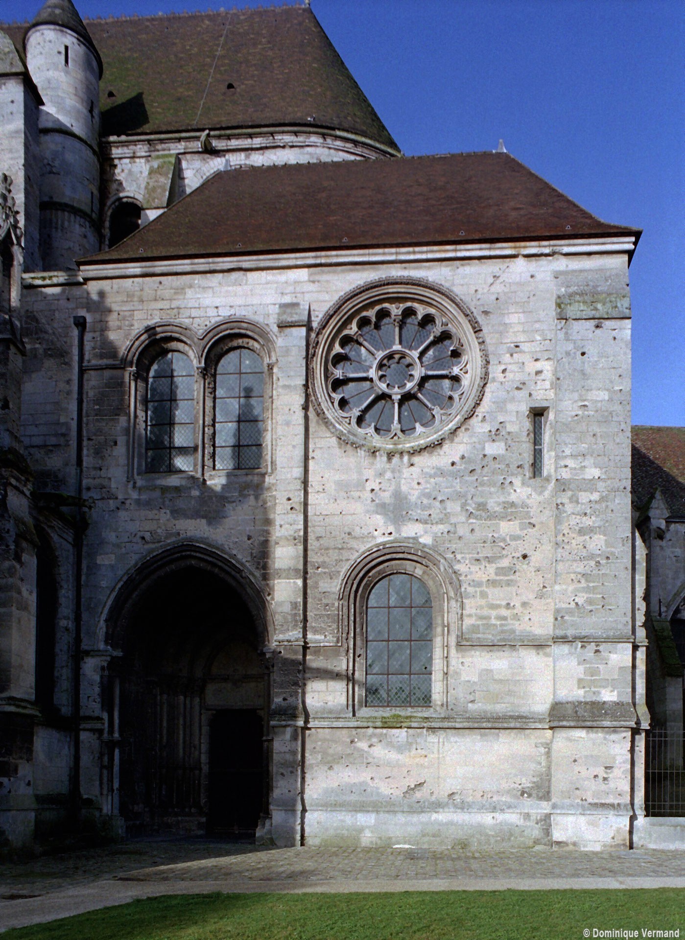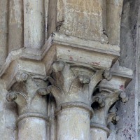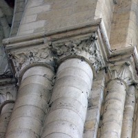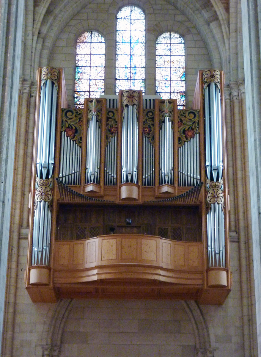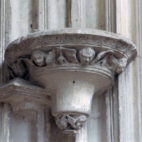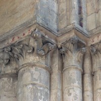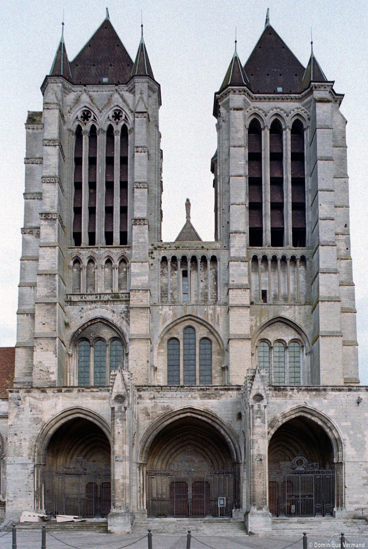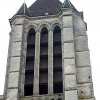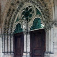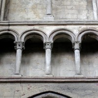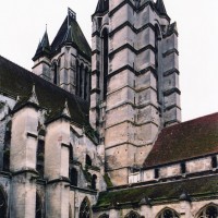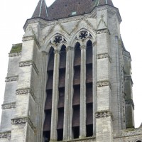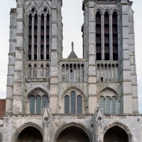 A l’extérieur, c’est la puissante masse des deux tours et leurs imposants contreforts qui dominent et imposent au regard une articulation verticale. Au-dessus du niveau des portails, abrités sous un profond porche que contrebutent deux contreforts traités comme des arcs-boutants et ajoutés au 14ème siècle, un étage ajouré de trois grandes fenêtres composées chacune de trois baies, correspond au niveau des tribunes. Le troisième étage, formé par une galerie ajourée d’arcatures, n’est pas homogène : la partie centrale et celle correspondant à la tour sud sont du début du 13ème siècle tandis que la galerie nord est postérieure à l’incendie de 1293. Il en est de même des deux tours et celle du nord, avec ses deux longues baies géminées coiffées de gables et ses contreforts aux larmiers distribués différemment, porte les marques d’une importante réfection.