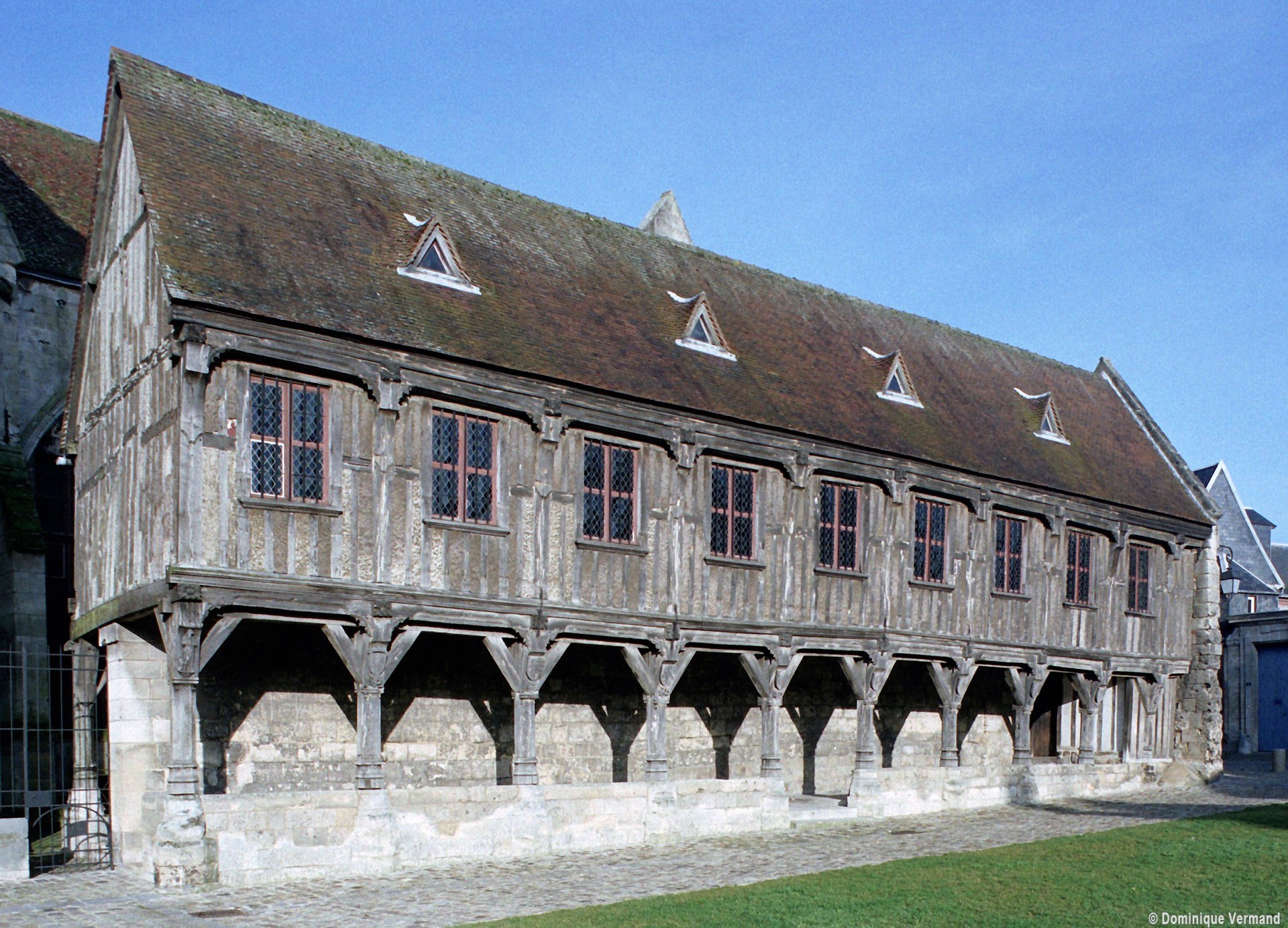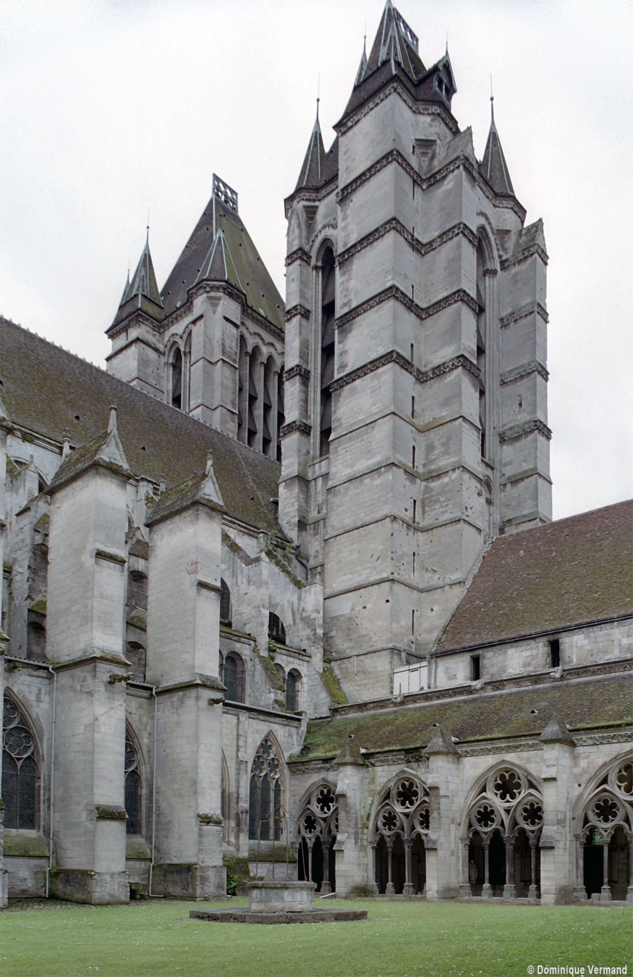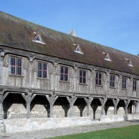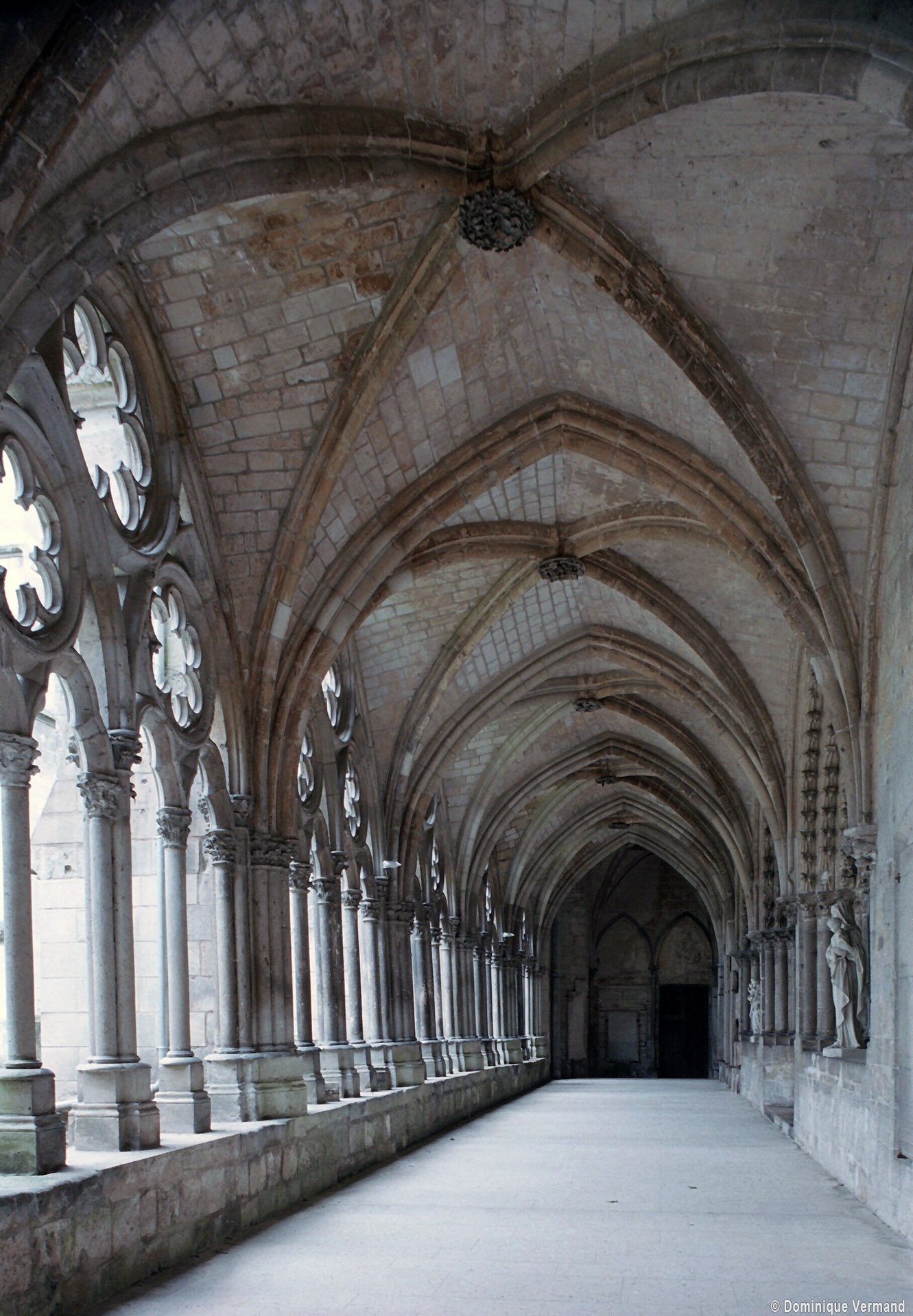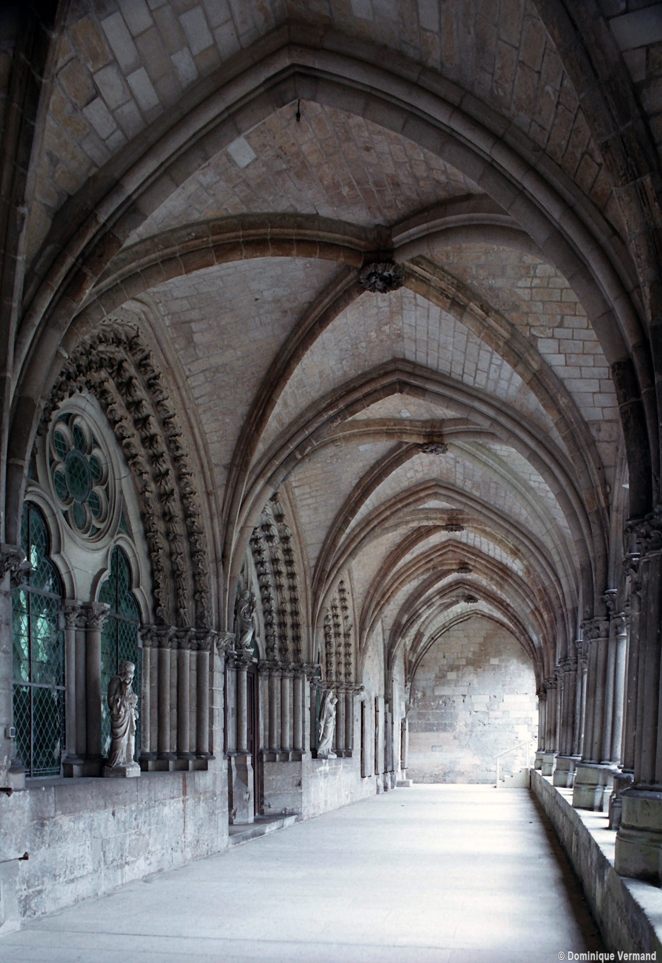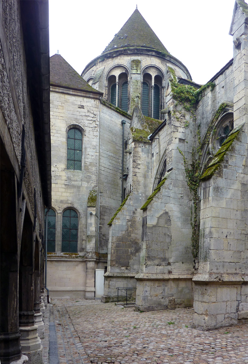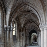Tout le flanc nord de la cathédrale est occupé par un ensemble de bâtiments distribués autour d’un cloître dont, seule, la galerie ouest existe encore aujourd’hui. Cet espace, réservé aux chanoines, était complété par de nombreuses maisons, dont celles qui, avec leurs beaux portails avec pots à feu, s’élèvent à l’ouest de la cathédrale. Plus ancien bâtiment de cet ensemble puisque construit vers 1175 en même temps que le bras nord du transept, le trésor occupe une salle de deux travées au-dessus du portail du transept nord (portail Saint-Pierre) et du revestiaire. Il est remarquable par sa rose richement décorée. Mais c’est surtout au milieu du 13ème siècle que l’on doit le plus remarquable des bâtiments conservés. Communiquant avec la galerie occidentale du cloître, il est constitué d’un vaste cellier en sous-sol, divisé en deux nefs de cinq travées par quatre piles circulaires qui concentrent les retombées des voûtes. Ce plan est repris au rez-de-chaussée, occupé par l’ancien réfectoire. Les voûtes y sont plus hautes et la salle est d’une grande élégance. Le portail et les deux baies en communication avec la galerie du cloître ont été très refaits en 1858-1859. Au-dessus se trouve un grenier d’abondance. Dernière construite – en 1506 -la bibliothèque est une véritable rareté : son étage en pan de bois, tout en longueur, repose sur une galerie ouverte composée de deux files de dix poteaux et renforcée par un mur de soutènement plus tardif. Le célèbre évangéliaire de Morienval (9ème siècle), qui y a pendant longtemps été conservé, se trouve maintenant à l’Hôtel-de-Ville (2008, modifié 2015).