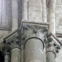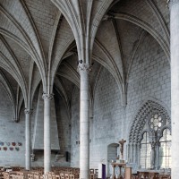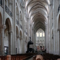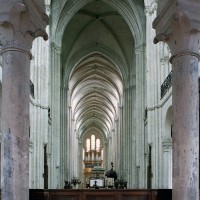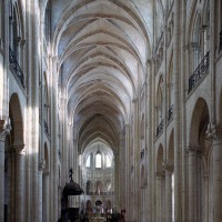 Réalisant en quelque sorte la fusion entre le choeur, dont elle reprend l’élévation à quatre étages, et le transept, auquel elle emprunte le triforium passage et le réseau des fenêtres hautes, la nef, bien que d’un bel équilibre, est la partie la moins novatrice de la cathédrale. Sa particularité réside surtout dans l’alternance de piles circulaires et de piles composées, justifiée par un voûtement sexpartite qui n’a, finalement, pas été réalisé. L’alternance observée dans les supports ne se retrouve donc pas au niveau des voûtes, au nombre de dix pour les cinq travées doubles que compte la nef. Une analyse minutieuse de celle-ci montre par ailleurs que les deux travées doubles orientales appartiennent à la même campagne que le transept, les travaux ayant commencé par le nord. Ce n’est qu’à l’achèvement des trois travées doubles occidentales, à la fin du 12ème siècle, que le voûtement de l’ensemble a été réalisé.
