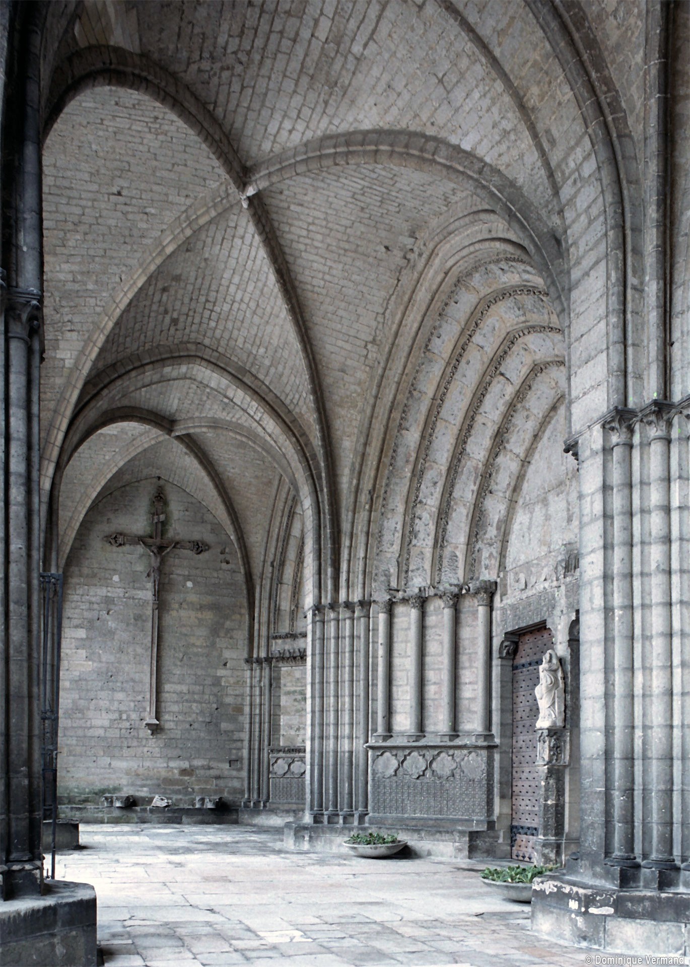 Longue de 103 mètres (Paris en compte 130 et Laon 110), Notre-Dame se compose d’un choeur de deux travées terminées par une abside, l’ensemble étant flanqué de bas-côtés sur lesquels se greffent quatre chapelles droites et d’un déambulatoire desservant cinq chapelles rayonnantes. La première travée des bas-côtés sert d’assise à deux tours partiellement arasées au 18ème siècle. Un transept aux extrémités en hémicycle se développe à l’ouest, suivi d’une longue nef de cinq travées doubles avec bas-côtés. Un vaste massif occidental, servant de socle aux tours et précédé d’un porche voûté, introduit à l’édifice.