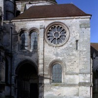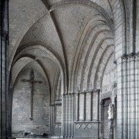 Démarré dans les années 1160, lorsque s’achevait le choeur, et terminé vers 1185, le transept est certainement l’élément le plus remarquable de la cathédrale. Très proche, par ses dimensions, du vaisseau central du choeur, il en reprend la terminaison arrondie. Ce parti d’origine très ancienne a connu un succès réel dans les régions du Nord aux 12ème et 13ème siècles. Dans le cas de Noyon, et sans exclure d’autres influences, il est tentant de voir en la cathédrale de Tournai, dont le diocèse était associé à celui de Noyon jusqu’en 1146, la source de cette particularité. Doté, sur chaque bras, d’un portail s’ouvrant à l’est, il remplissait un rôle fonctionnel essentiel en permettant l’accueil des pèlerins qui venaient se recueillir auprès des reliques de saint Eloi et en assurant, par ailleurs, une communication directe avec les bâtiments du chapitre, au nord, et avec la chapelle et le palais épiscopal, au sud.