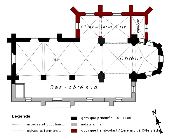 La construction du bas-côté sud est difficile à dater avec certitude faute d’éléments significatifs. Elle est, au plus tard, contemporaine de la voûte de le nef, dont les retombées sont en parfaite correspondance avec les piles du bas-côté, et de la chapelle nord, dont le réseau des fenêtres, déjà renaissant, permet de la dater du milieu du 16ème siècle. L’église possède une Vierge à l’Enfant du 14ème siècle (2002).
