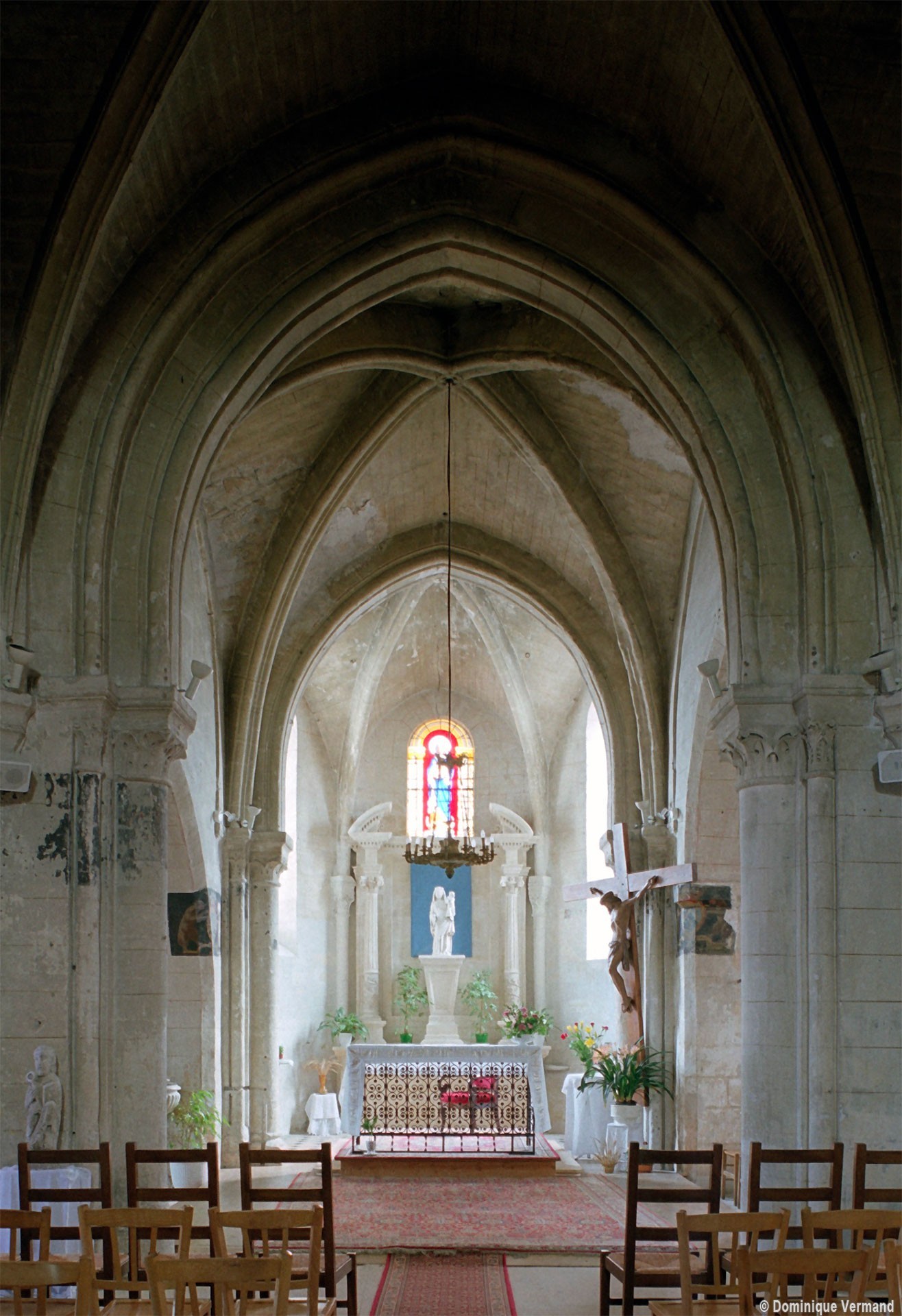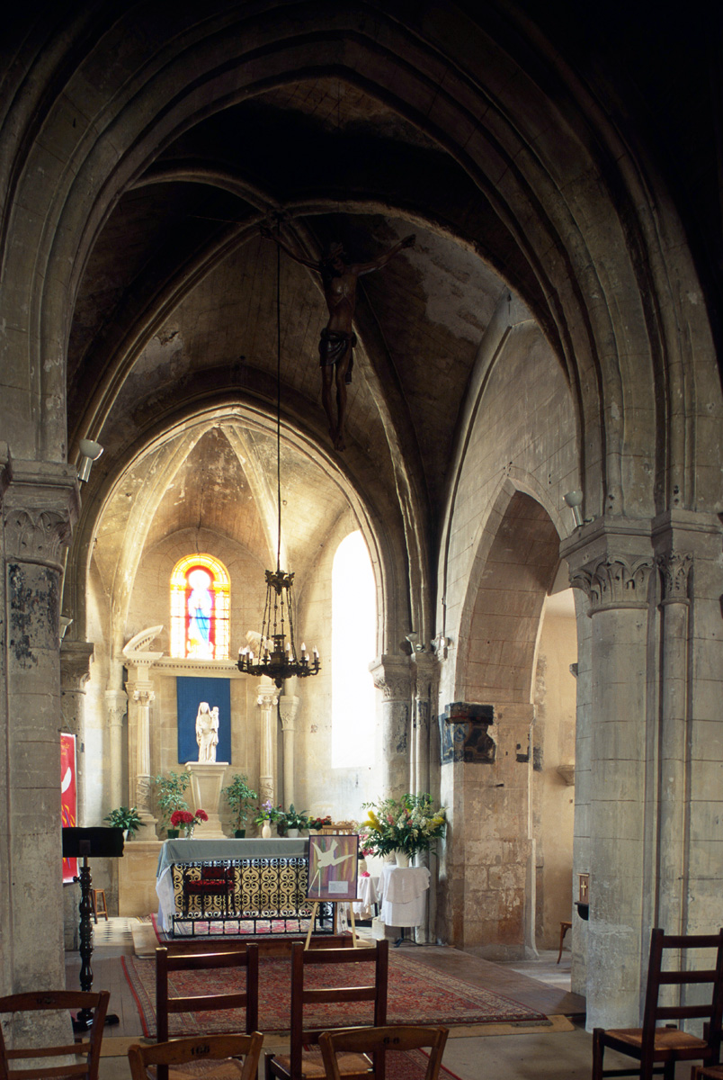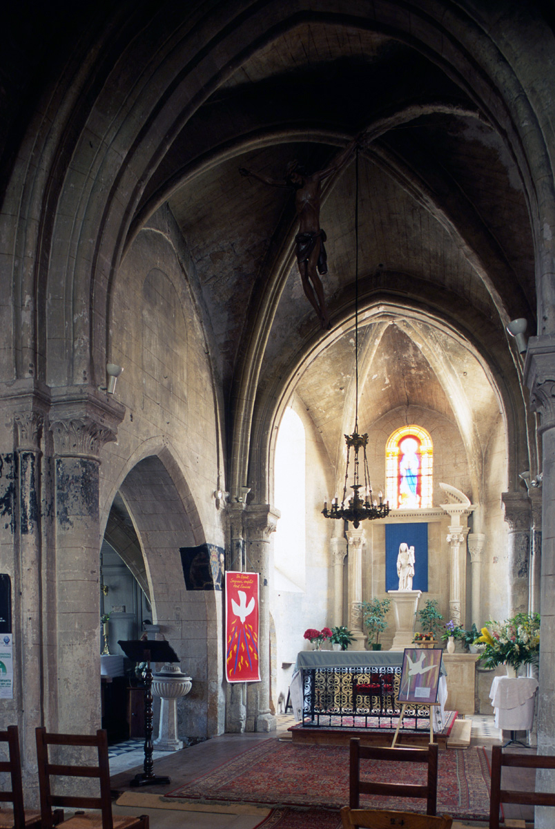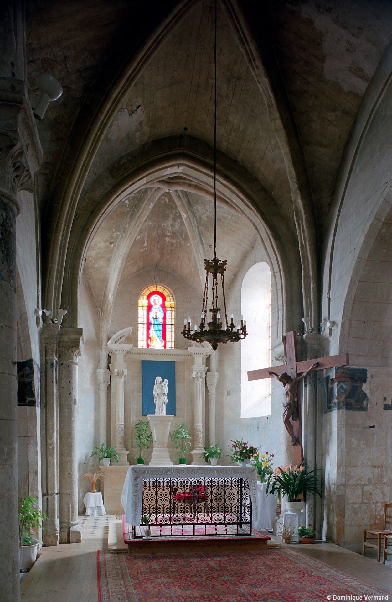 L’abside en hémicycle éclairée par des fenêtres en plein cintre et la nef non voûtée (à l’origine) inscrivent cette église dans la tradition romane malgré la date tardive de sa construction (vers 1160/70). A l’intérieur cependant, la présence de voûtes d’ogives sur le choeur en fait un édifice bien représentatif du style appelé, faute de mieux, de transition.