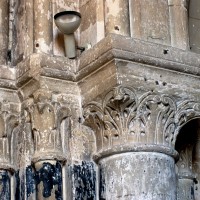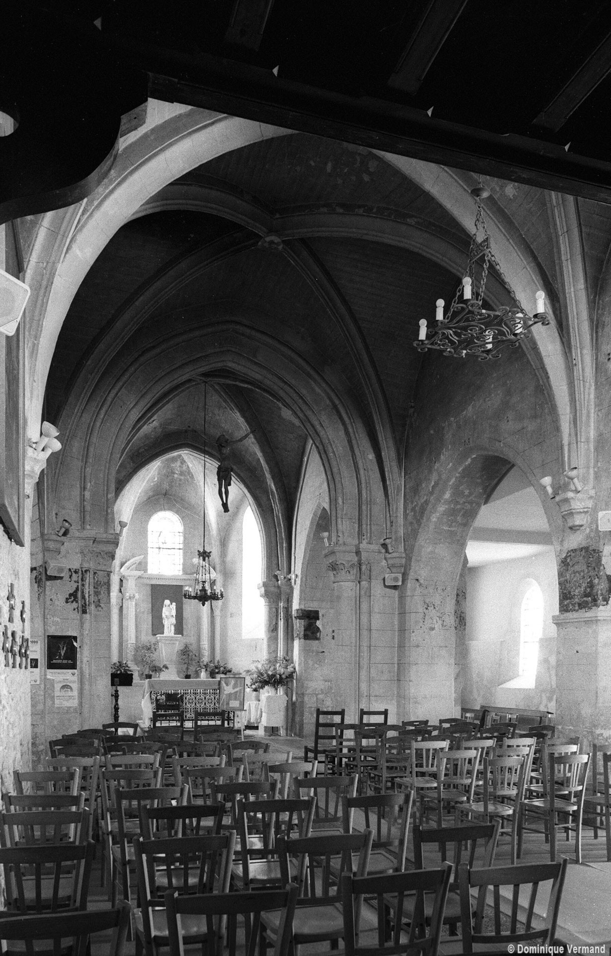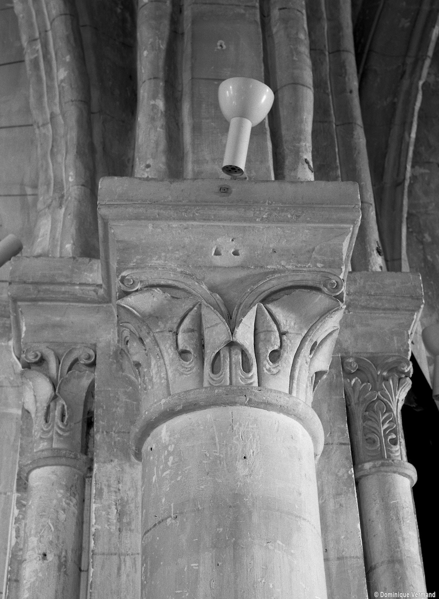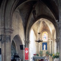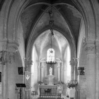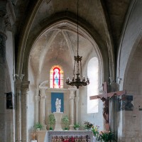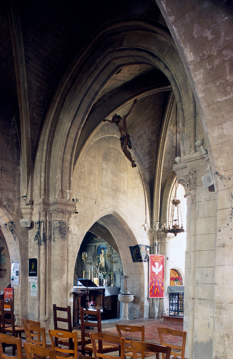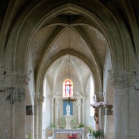 L’abside en hémicycle éclairée par des fenêtres en plein cintre et la nef non voûtée (à l’origine) inscrivent cette église dans la tradition romane malgré la date tardive de sa construction (vers 1160/70). A l’intérieur cependant, la présence de voûtes d’ogives sur le choeur en fait un édifice bien représentatif du style appelé, faute de mieux, de transition.